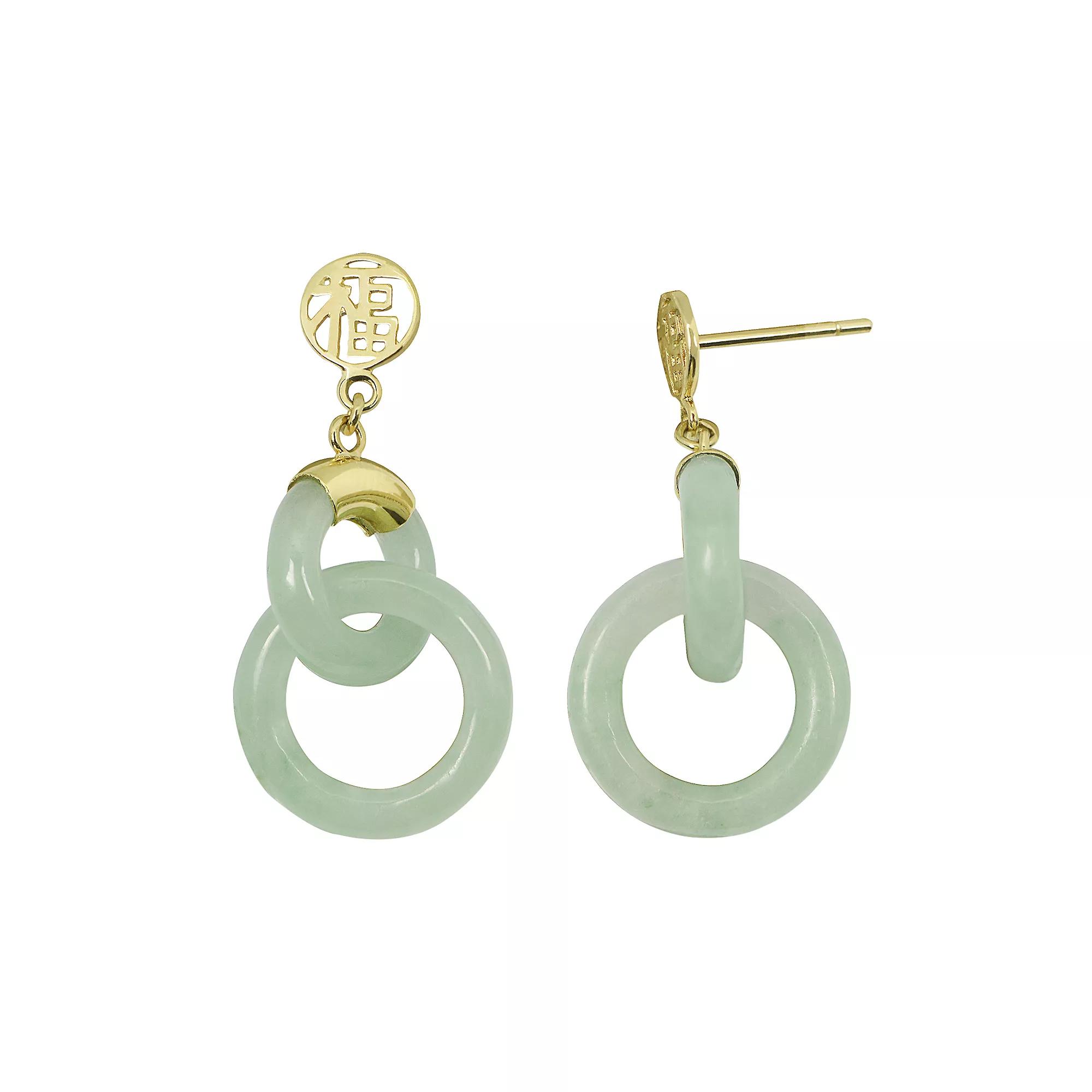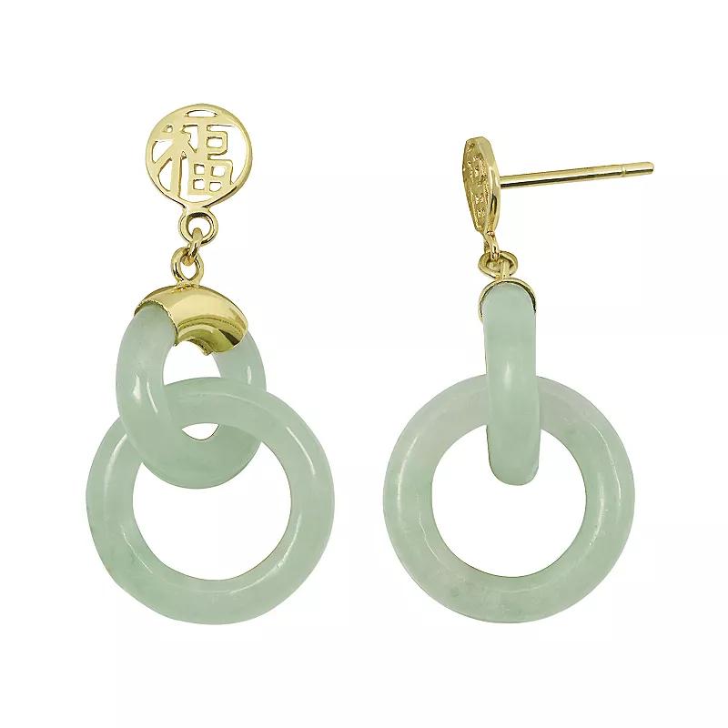 Interlocking jade circles and Chinese happiness symbols make these 10k gold earrings the perfect way to elevate your ensemble. Comes in a gift box.EARRING DETAILS Length: 1.3 in. Backings: post Metal: 10k gold STONE DETAILS Stone type: genuine jade Shape: ring Size: One Size. Color: Green. Gender: female. Age Group: adult.