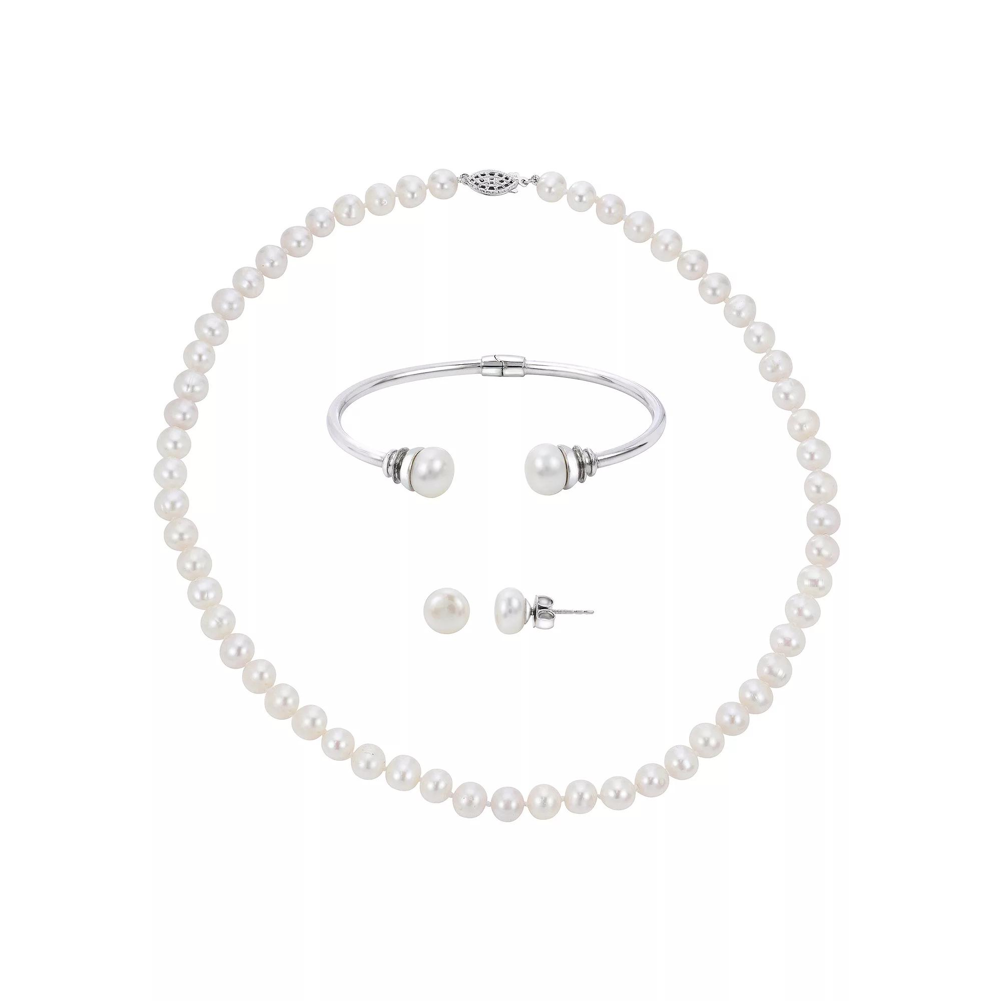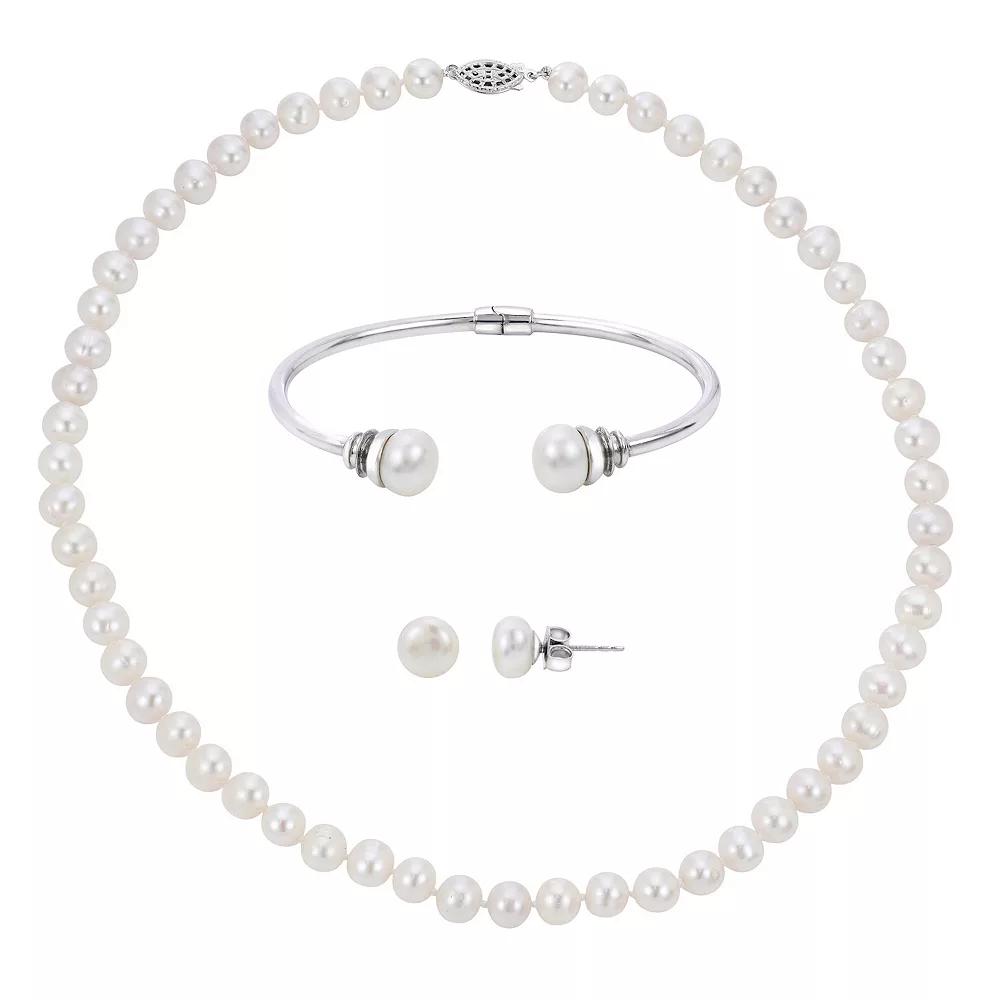 Enclosed in a elegant rose wood box, this gorgeous jewelry set includes a stunning necklace, flexible cuff bracelet and set of stud earrings, all of which feature gorgeous freshwater cultured pearls. Enclosed in a elegant rose wood box, this gorgeous jewelry set includes a stunning necklace, flexible cuff bracelet and set of stud earrings, all of which feature gorgeous freshwater cultured pearls. Includes: necklace, bracelet, pair of earrings Necklace length: 18 in. Bracelet length: 6.5 in. Earring diameter: 10 mm Backings: post Metal: sterling silver Plating: rhodium Finish: polished Packaging: rose wood box Additional details: hand knotted on silk blend threadCULTURED PEARL DETAILS Type: freshwater Size: 7 mm - 8 mm & 9 mm - 10 mm Shape: button, near-round Color: white Gemstones may have been treated to enhance their appearance. Special care may be required. Please visit our Gemstone Treatment & Special Care Guide for more information. Please note, due to the high value of this item, a signature may be required upon delivery. Size: One Size. Gender: female. Age Group: adult.