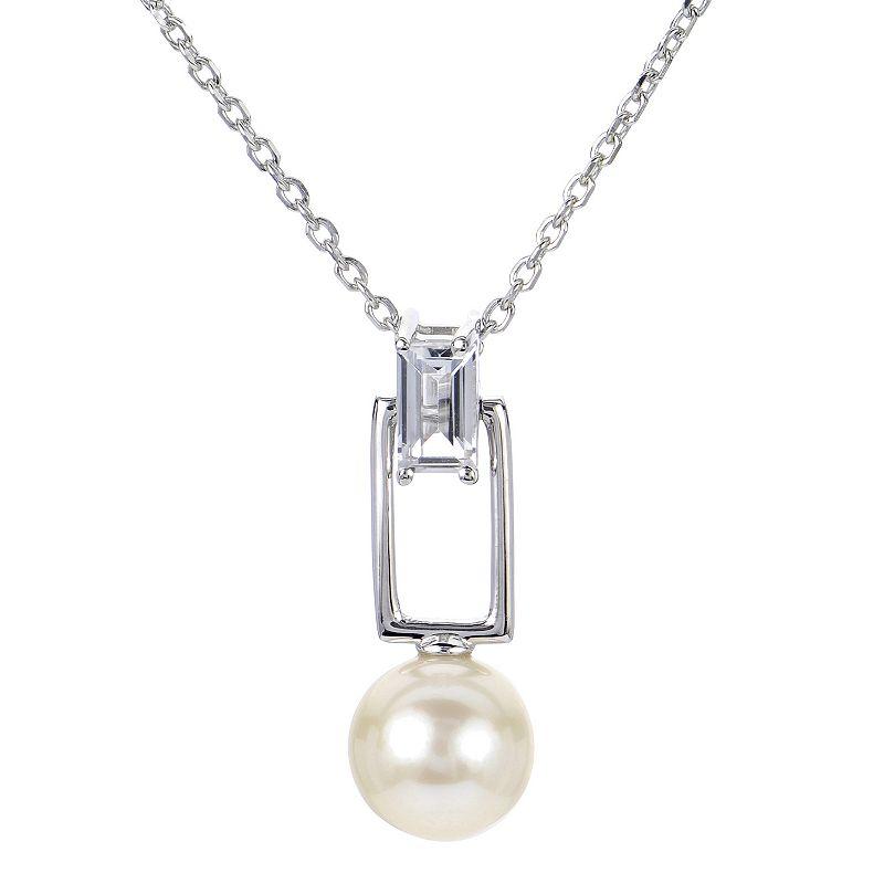 Sleek and streamlined, this simple yet stylish 18” cable chain necklace is crafted in fine, high polish sterling silver and boasts a lustrous, white 7-7.5 mm off-round shape cultured freshwater pearl and shimmering genuine white topaz baguette shape gemstone set in a modern geometric design. | Pearlustre By Imperial Sterling Silver Freshwater Pearl Necklace, 18 In