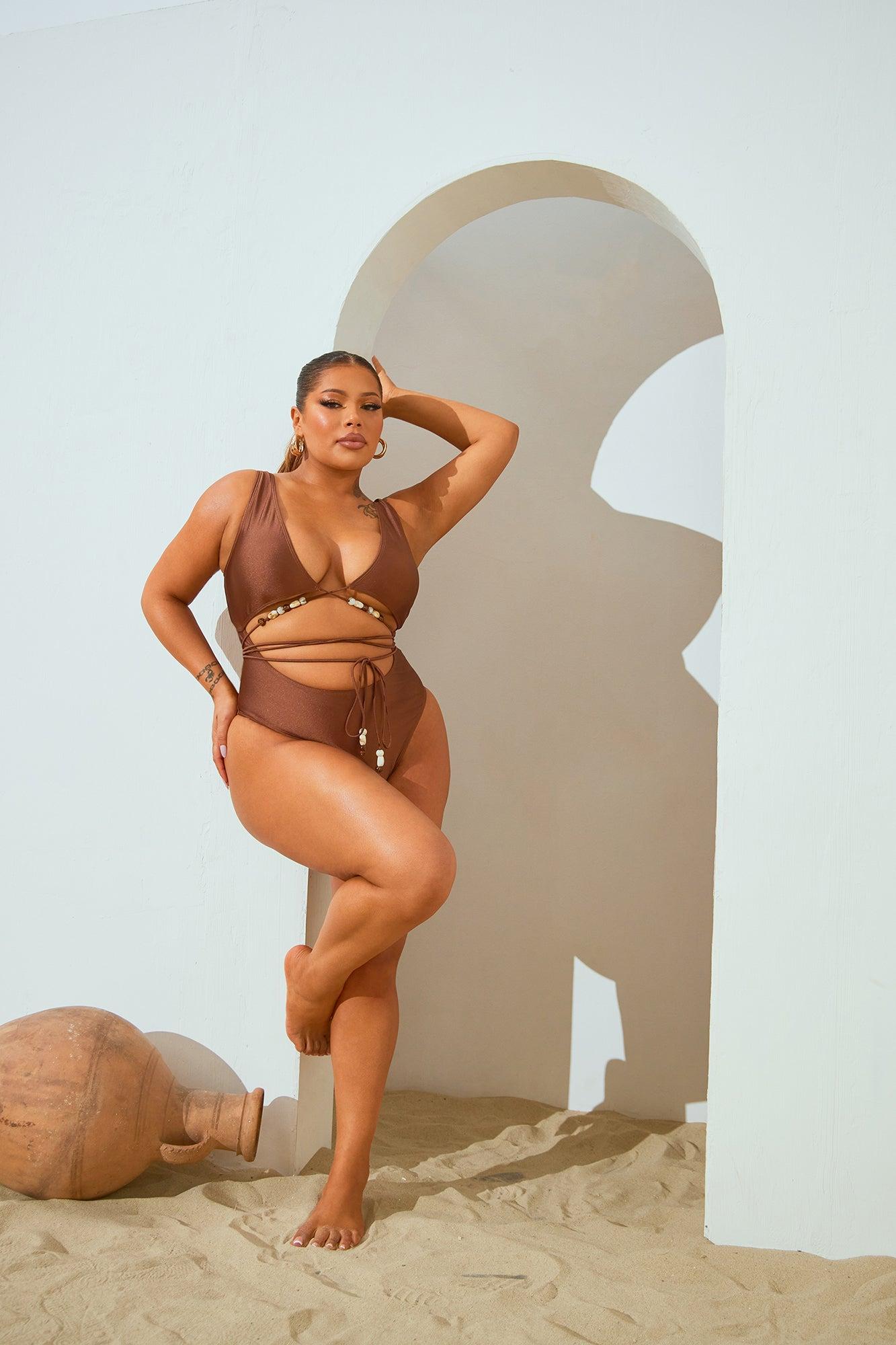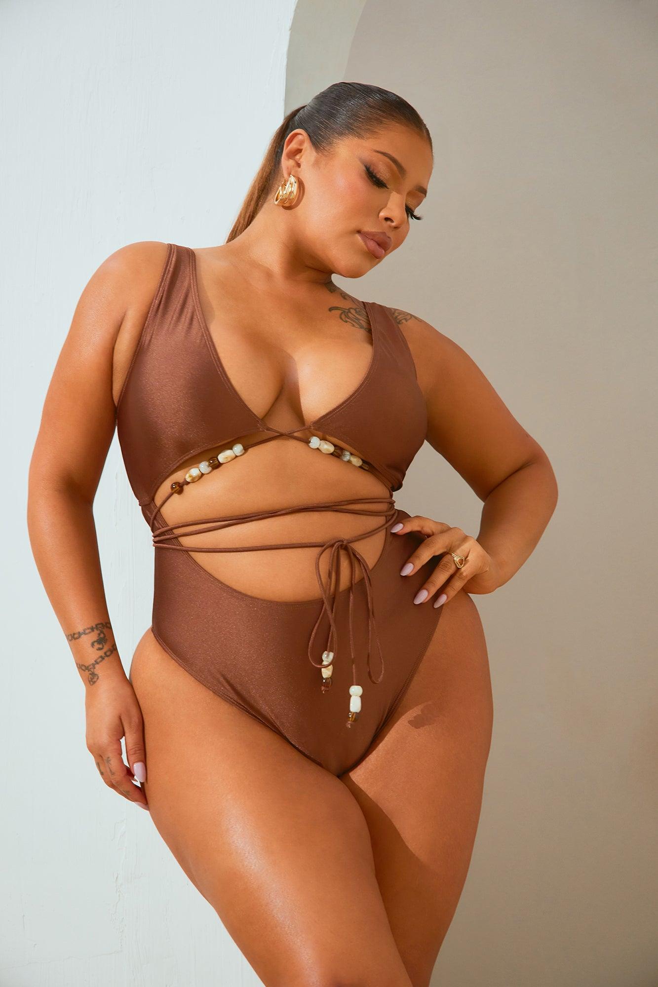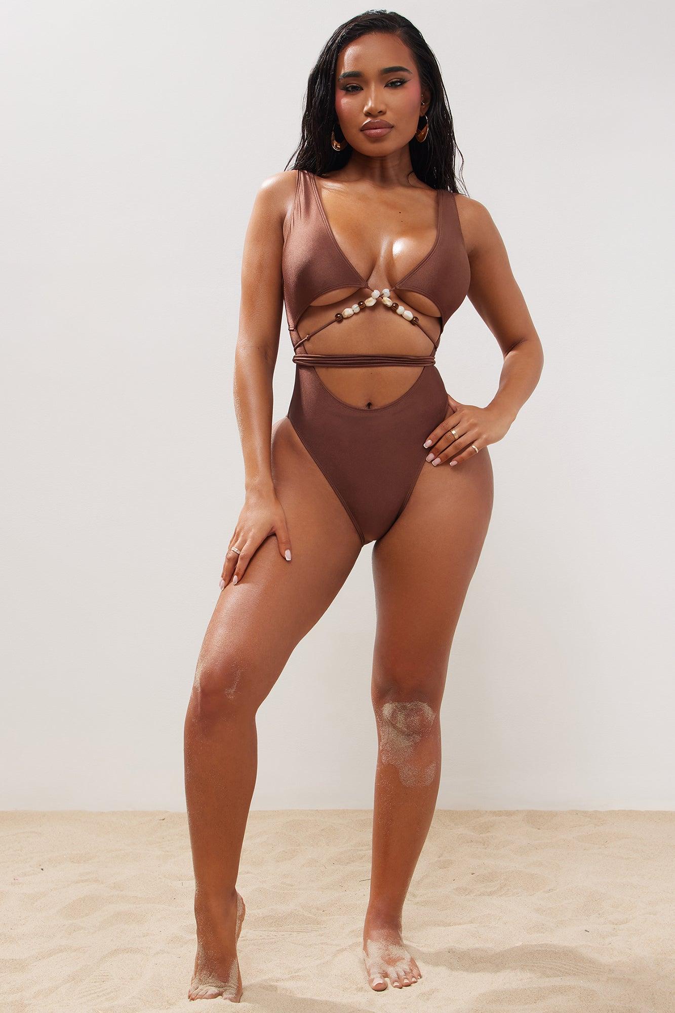 Available In Blue, Chocolate, And Cream. 1 Piece Ensemble Swimsuit Bead & Stone Charms Adjustable Wrap Around Straps Cut Out High Leg Cut Cheeky Bikini Bottom Sheen Fabric Full Stretch Final Sale Main: 82% Polyamide 18% Elastane Lining: 100% Polyester Imported California Proposition 65WARNING: Cancer and Reproductive Harm - www.P65Warnings.ca.gov.