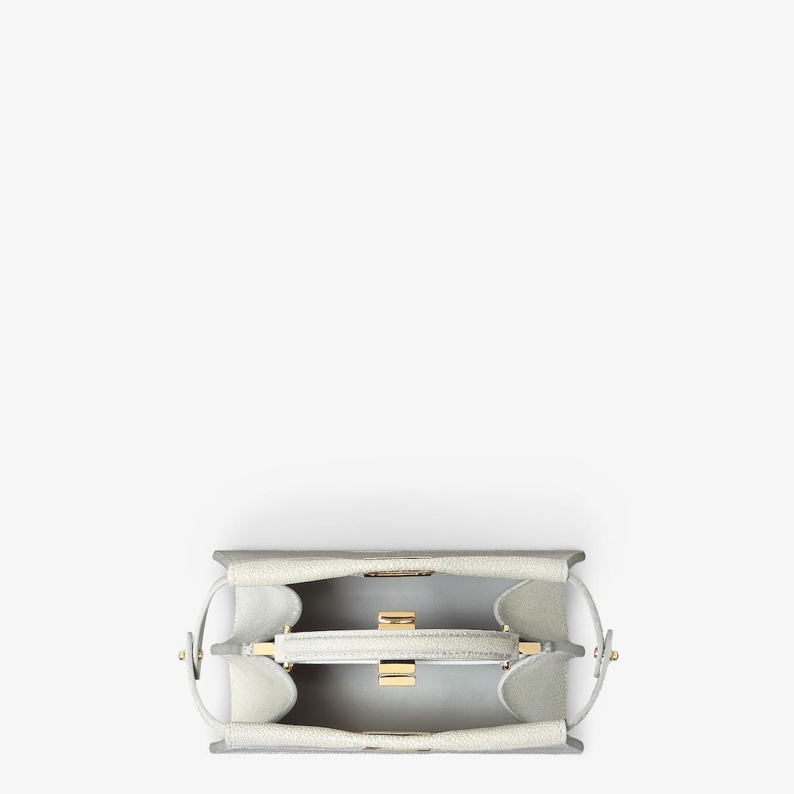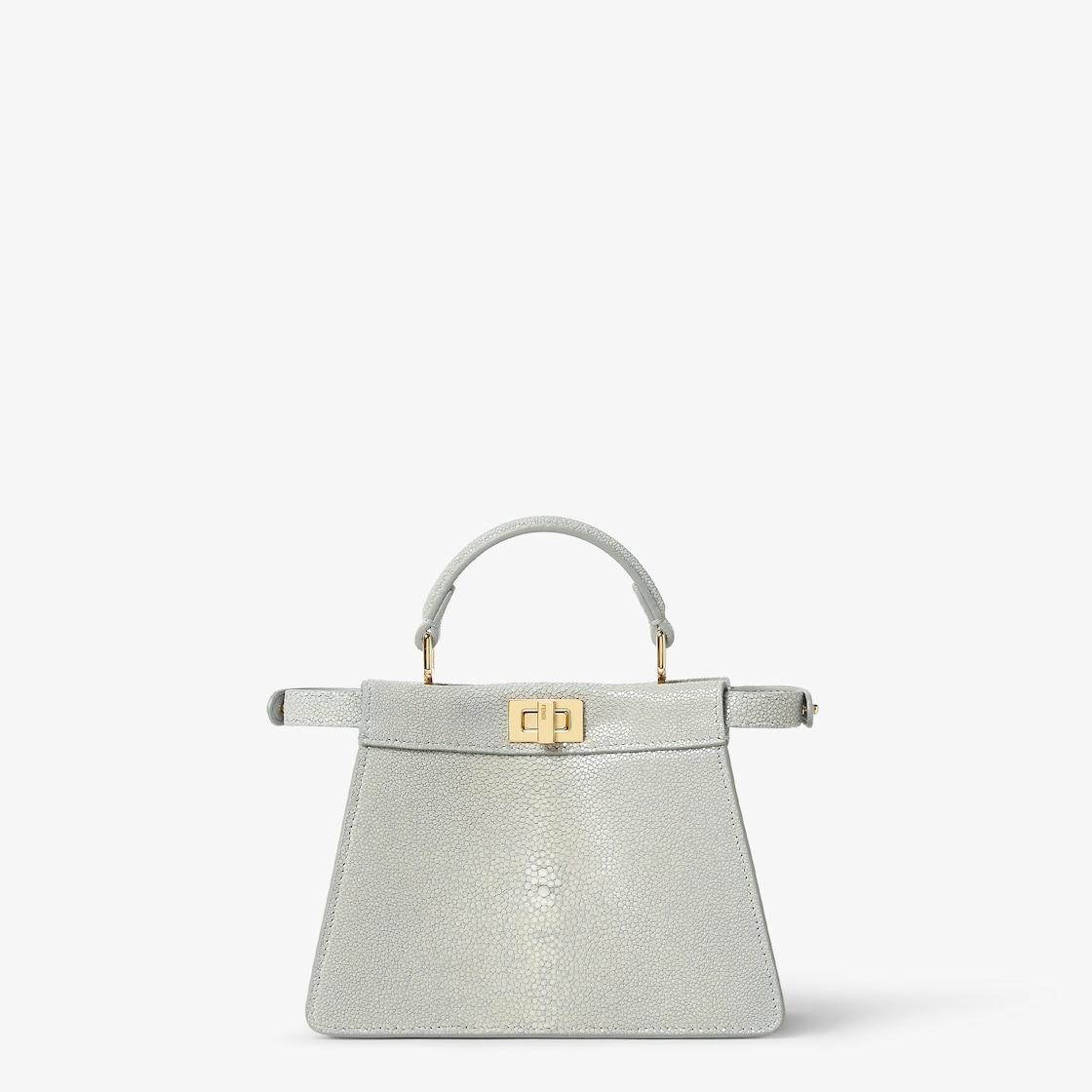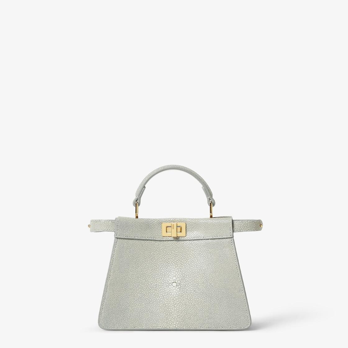 Iconic small Peekaboo ISeeU bag, the epitome of Fendi craftsmanship and creativity. A timeless icon, the Peekaboo was created in 2009. Like the children’s game it takes its name from, peek-a-boo, the bag plays with the beauty showcased on the outside and that concealed on the inside. Made of luxury, hand-polished pearl gray stingray leather. Featuring interiors lined in soft tone-on-tone nappa leather, two internal compartments separated by a stiff partition and an inner pocket. Gold-finish bar, closure and metalware. Decorated with the iconic twist lock on both sides. The bag can be carried by hand or worn either on the shoulder or crossbody thanks to the handle and adjustable, detachable shoulder strap. Made in Italy