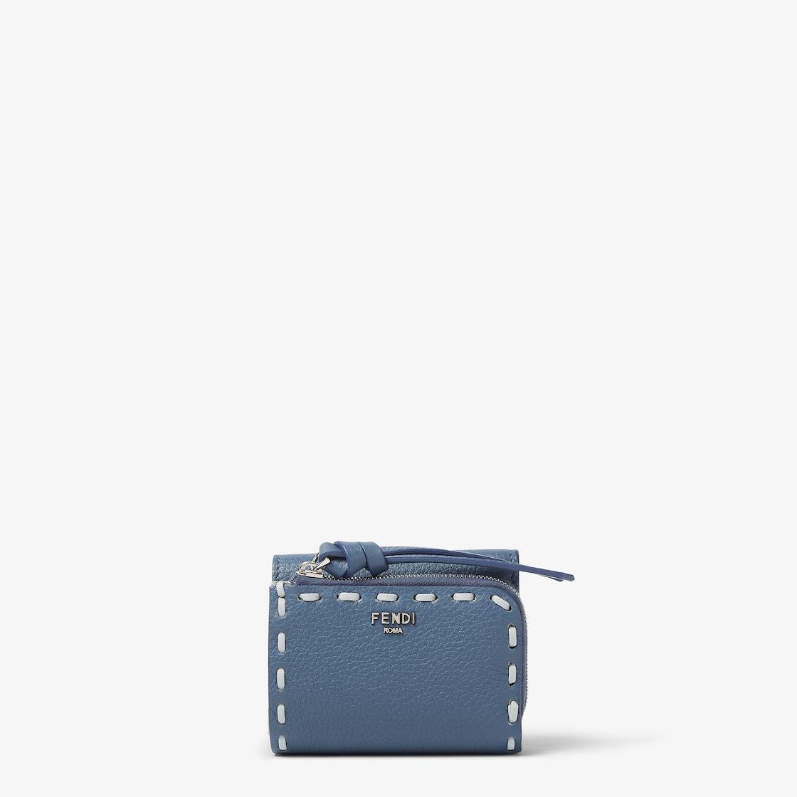 Compact Peekaboo tri-fold wallet, with a large internal compartment for bills, a cardholder slot and an external coin purse with a zipper and long knotted zipper pull. Made of blue Cuoio Romano leather with 82 hand-sewn, contrasting topstitches, an emblem of the iconic Selleria stitching handed down through generations of Fendi artisans since 1925. Palladium-finish metalware and metal FENDI logo. Made in Italy