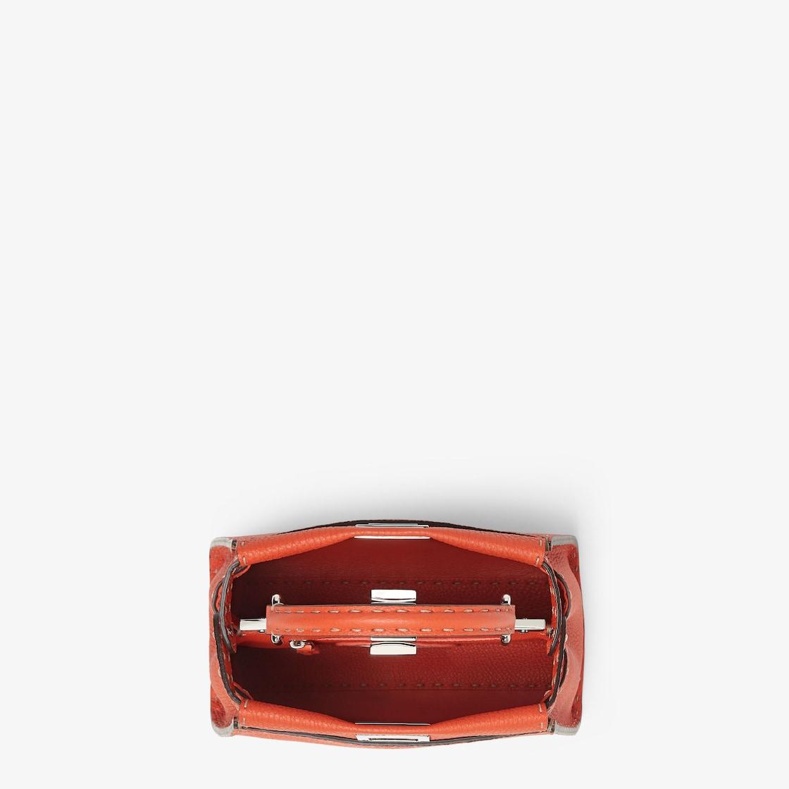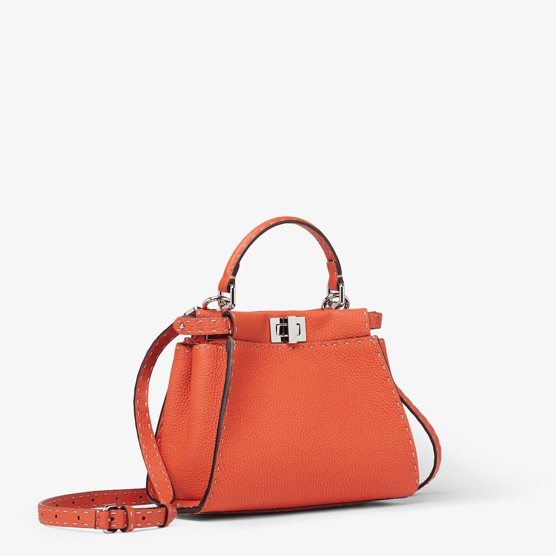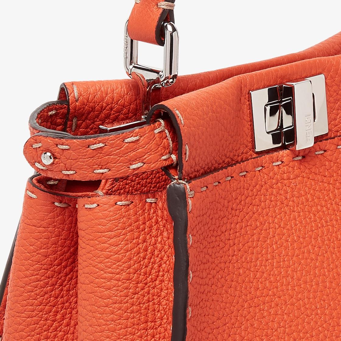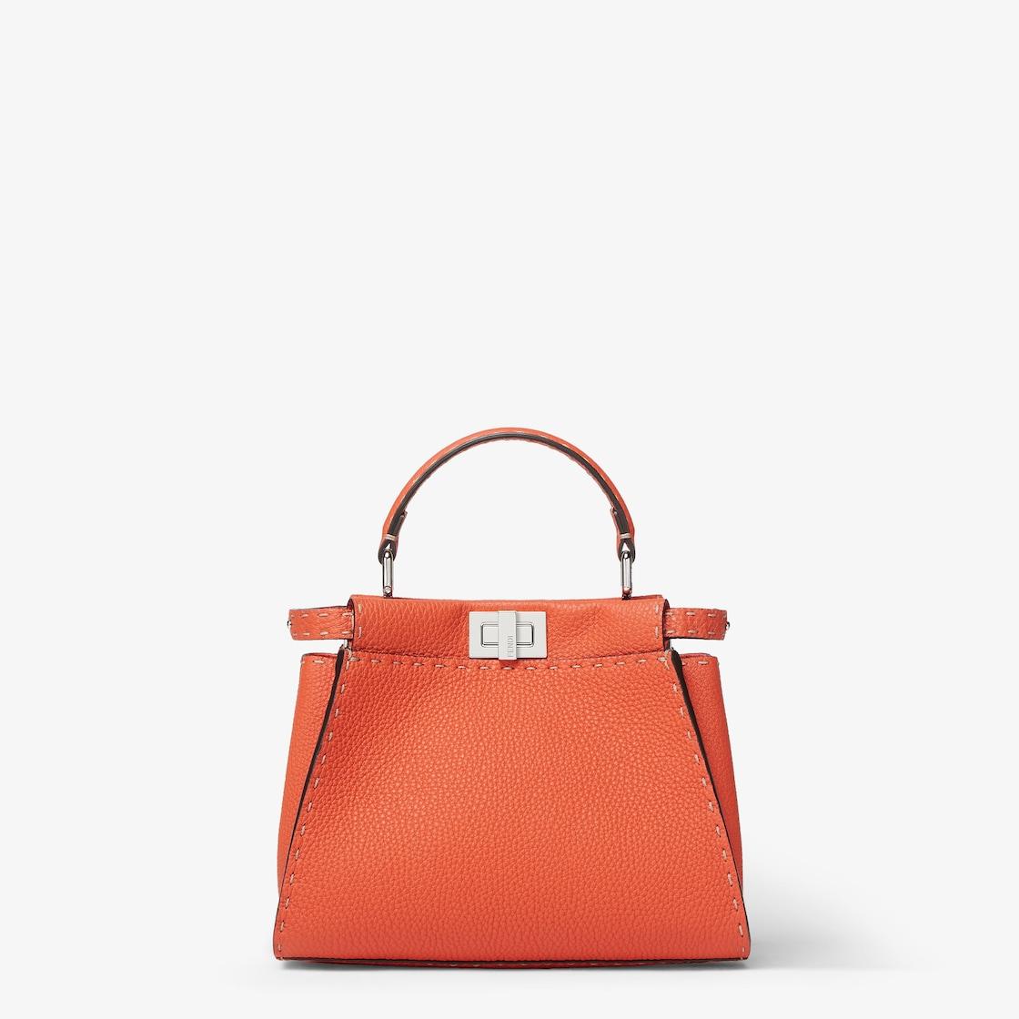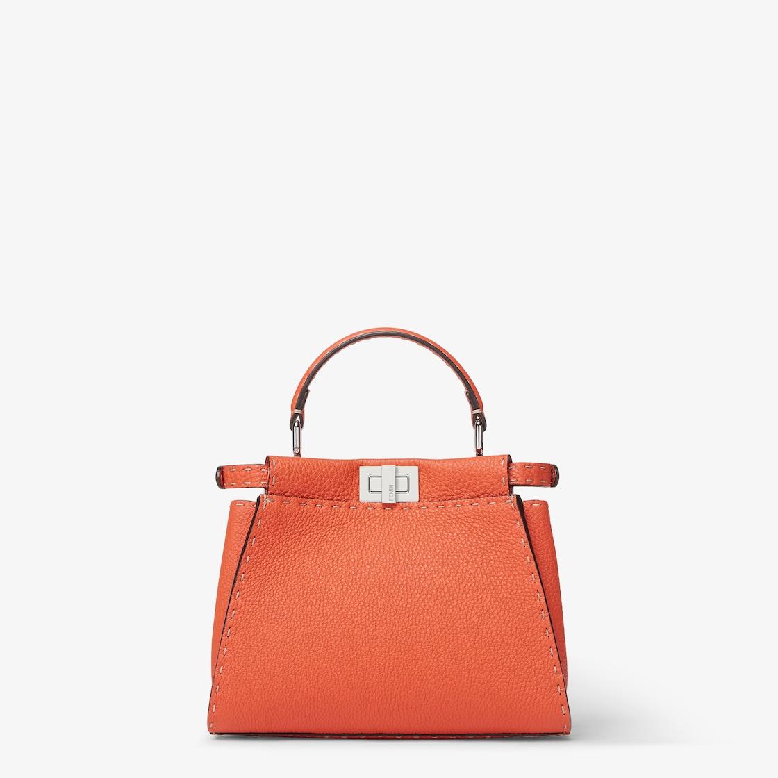 Small, iconic Peekaboo bag made with 1048 hand-sewn topstitches, an emblem of the iconic Selleria stitching handed down through generations of Fendi artisans since 1925. Made of orange Cuoio Romano leather, calfskin with a characteristic natural grain, produced with a metal-free tanning process. Featuring a calfskin-lined interior with two internal compartments divided by a stiff Cuoio Romano leather partition, one internal pocket. Selleria logo plate in silver, palladium-finish metalware. Decorated with the iconic twist lock on both sides. The bag can be carried by hand or worn on the shoulder thanks to the stone colored python handle and adjustable, detachable shoulder strap. Made in Italy