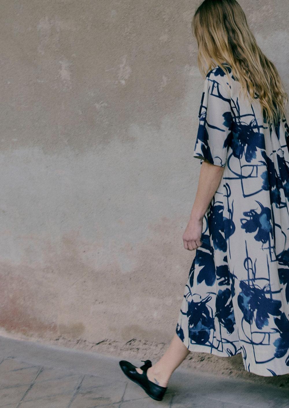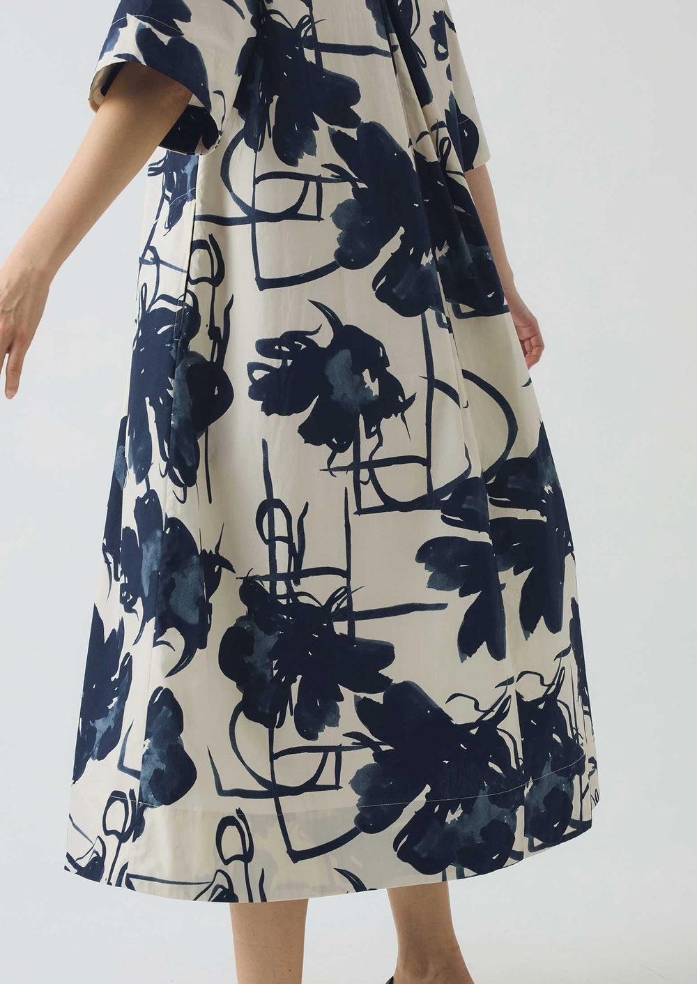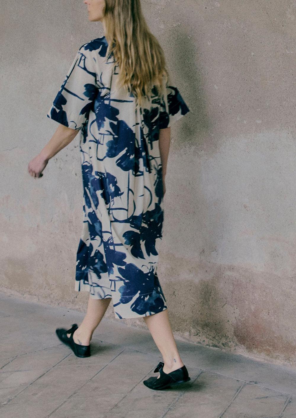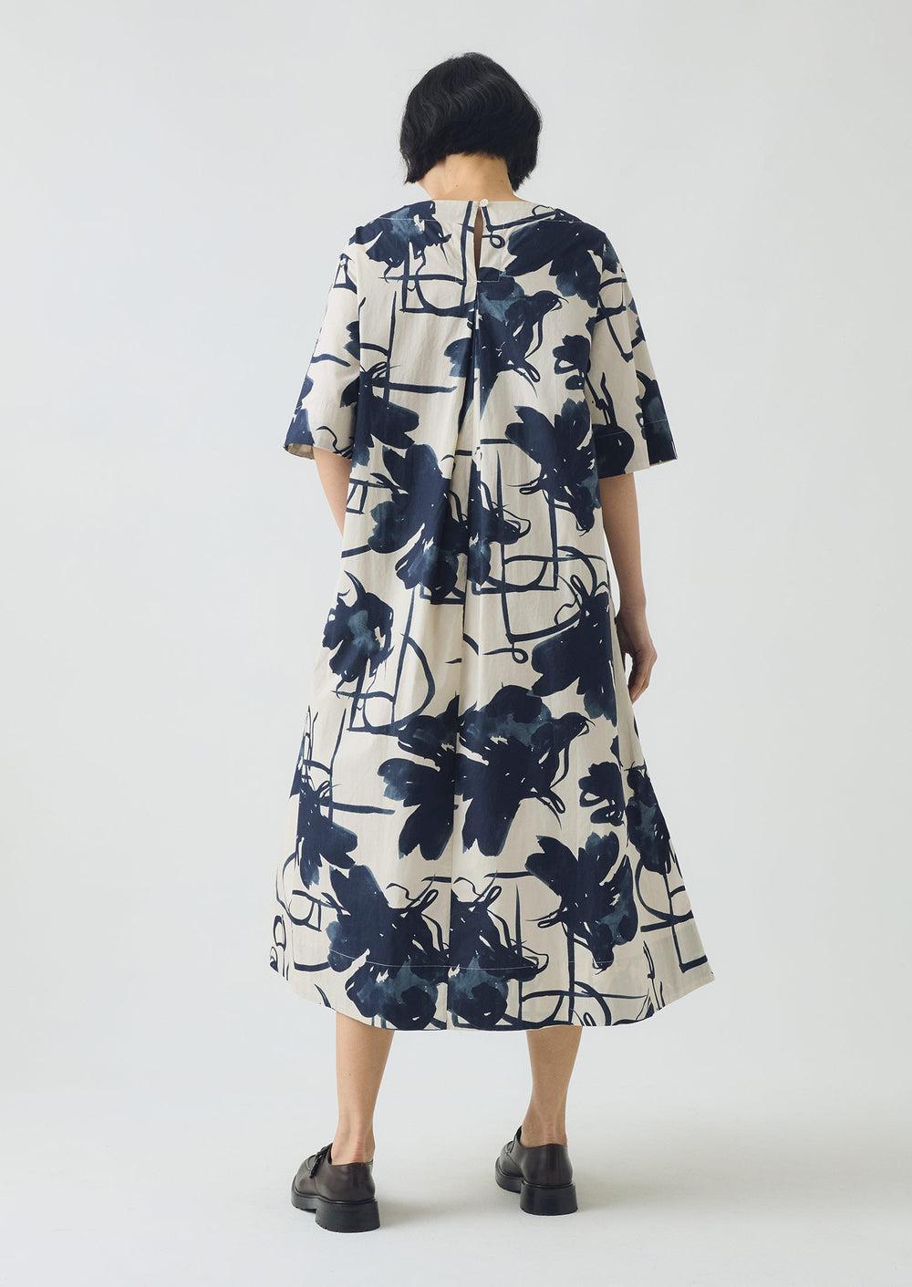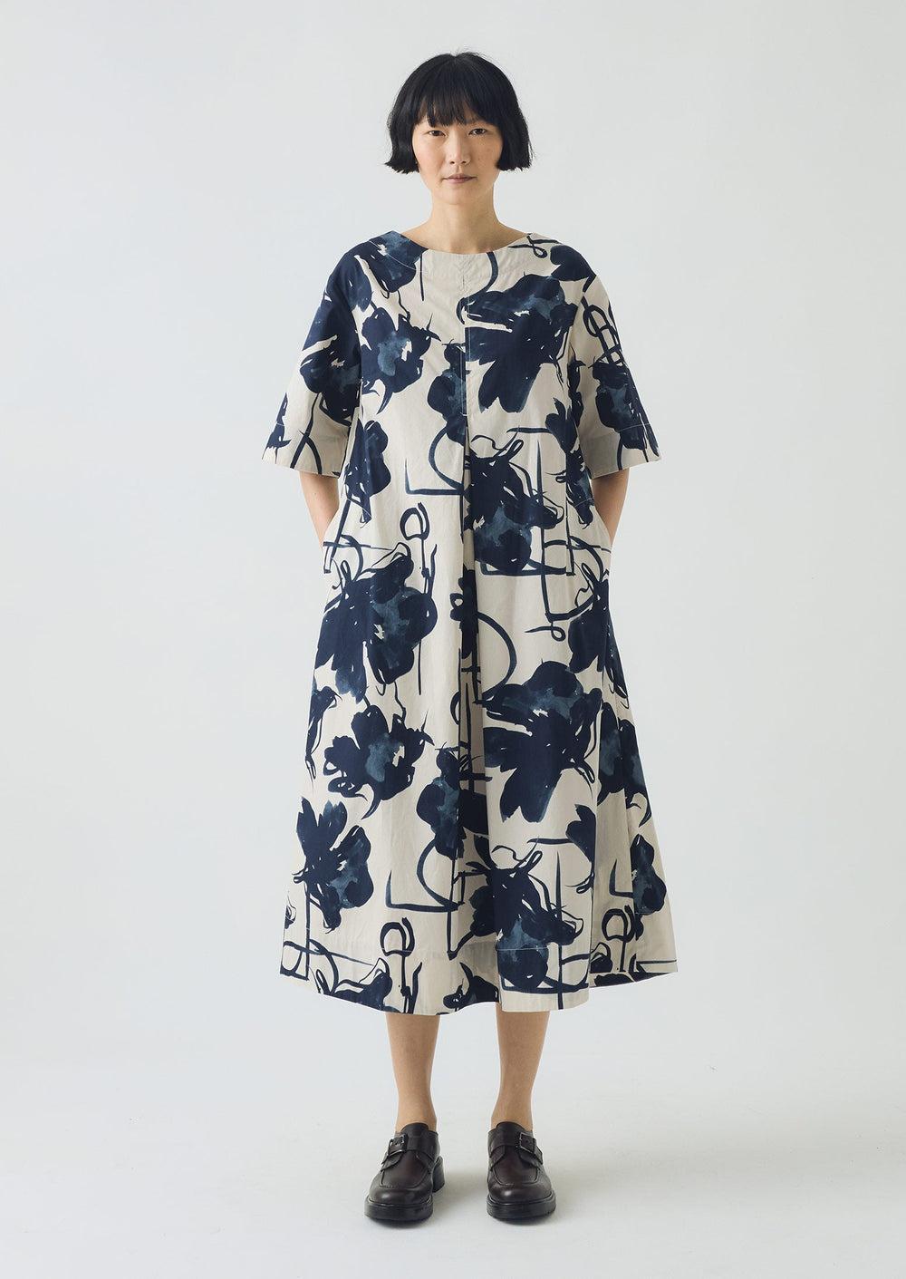 Our cotton dress features an expressive pattern inspired by the flowering ink marks created by fountain pens. A boat neckline, elbow-length sleeves and slip pockets at the side seams allow for a clean silhouette. Pleats directing an effortless skirt.