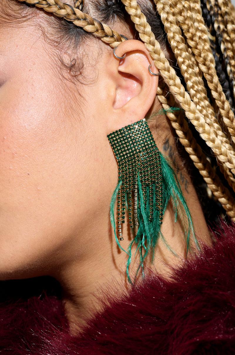 Bring some merriness into your life with The AKIRA Label Penelope Feather Earring. This opulent accessory is crafted from a faux gold metallic base and features a square lobe post made of sparkling gemstones with coordinating, dangling chainlink fringe. Complete with a layer of delicate, feather accents, and classic post back-style closures. - 100% Man-Made Materials (all measurements approximate from size O/S)- 5” Length- Imported Product ID: 472286