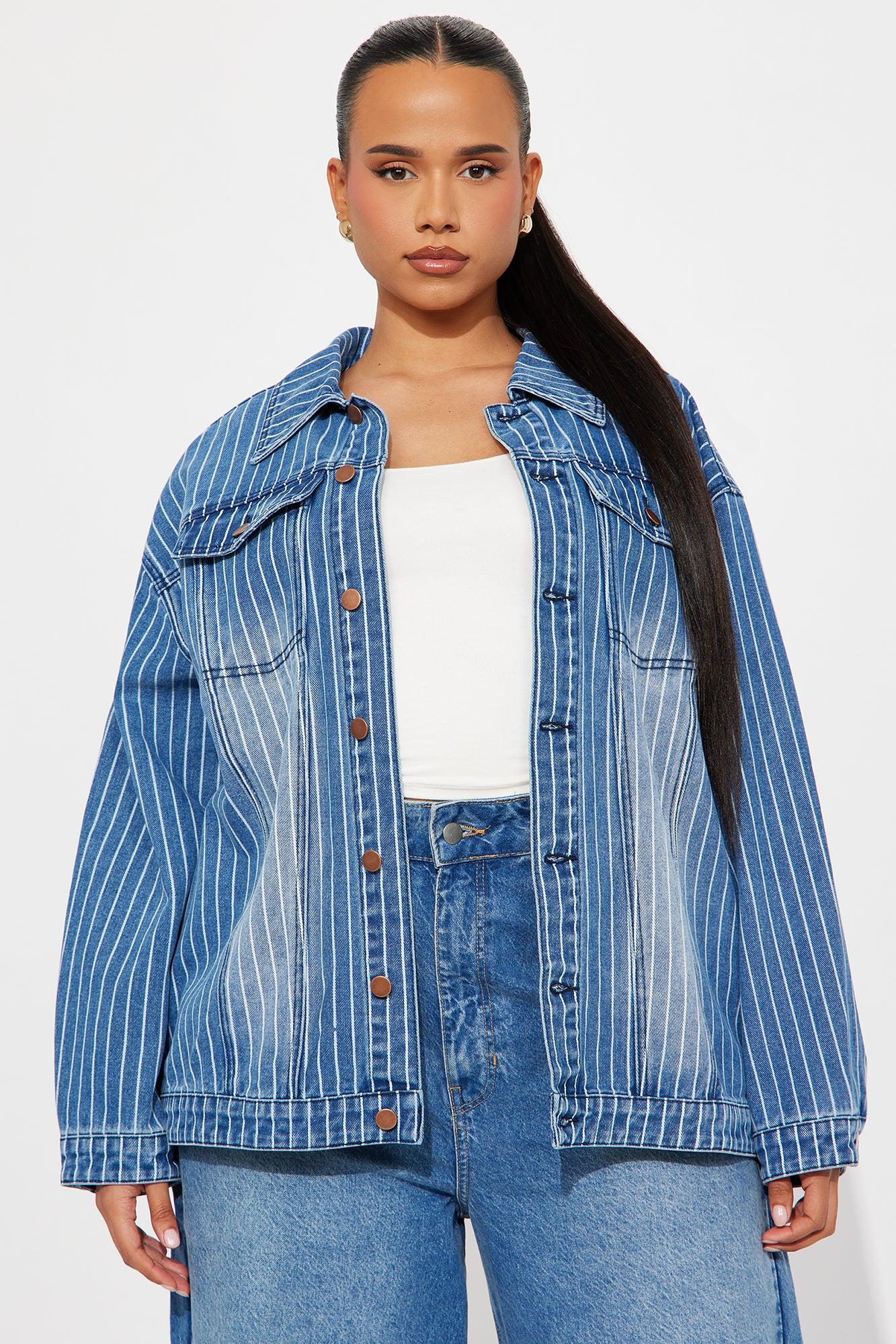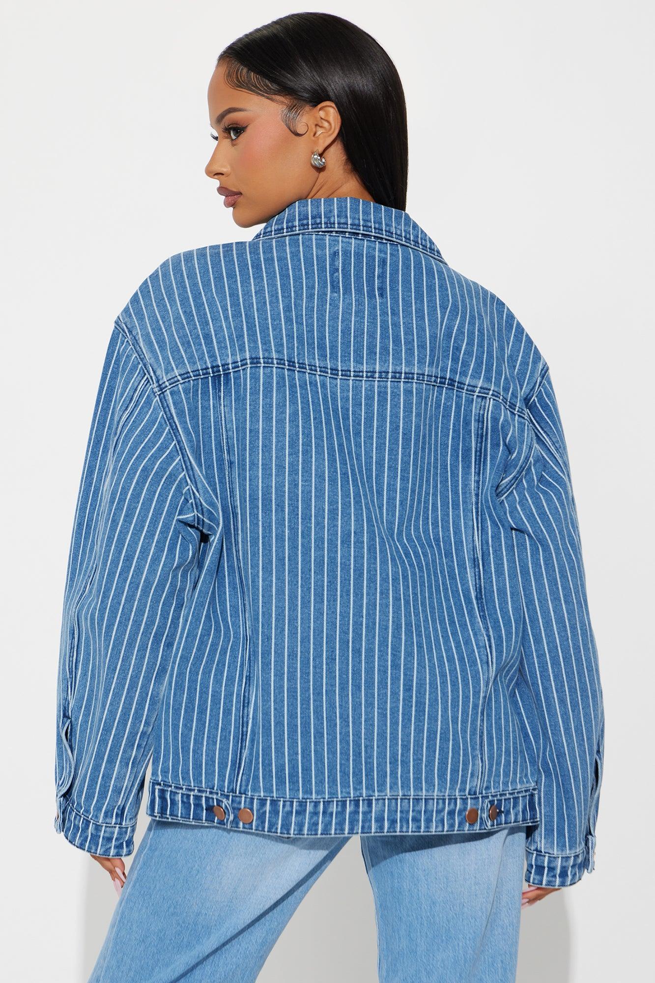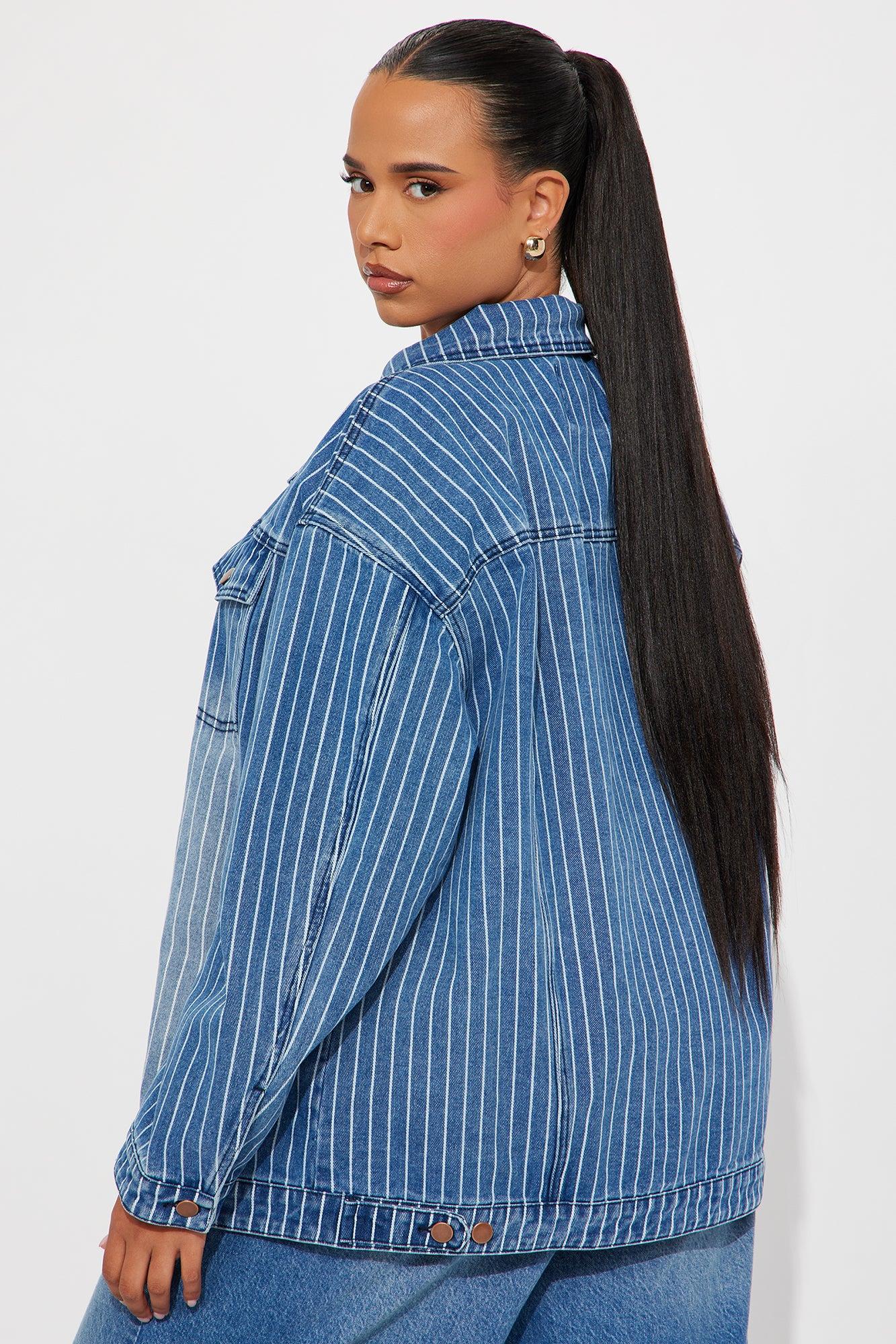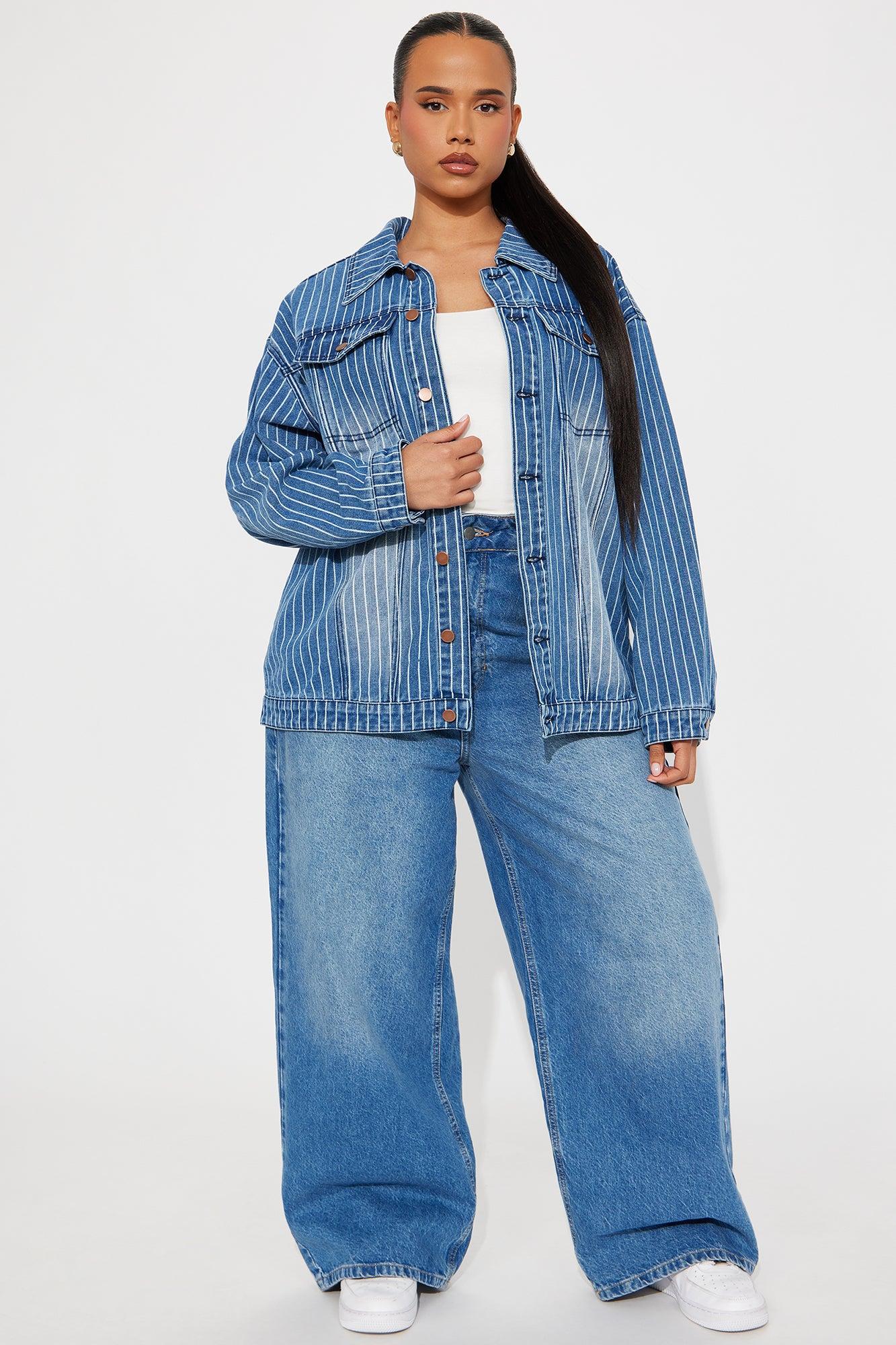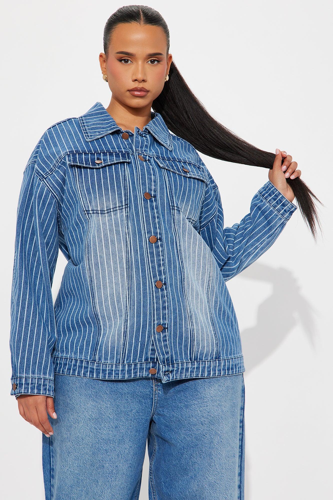 Available In Medium Wash. Denim Jacket Collar Long Sleeve Denim Rigid Pinstripe Button Closure Pockets Non Lined Disclaimer: Due To The Specialized Wash Process, Each Garment Is Unique. 81% Cotton 11% Rayon 8% Polyester Imported California Proposition 65WARNING: Cancer and Reproductive Harm - www.P65Warnings.ca.gov.