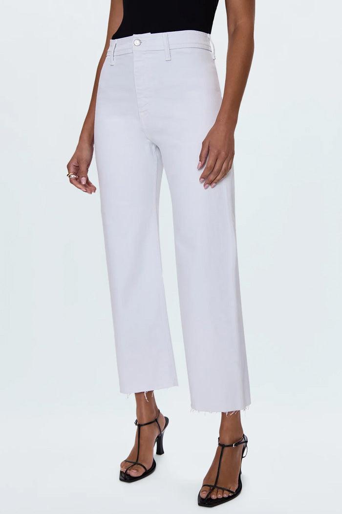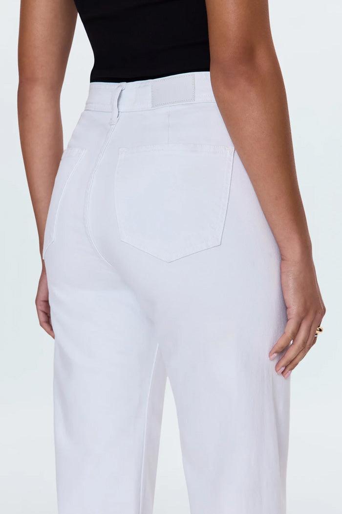 High rise waist, with a wide leg silhouette and a cropped, ankle length hemline. Crafted from our signature comfort stretch denim, with a double stitched waistline and scissor cut hems. Offered in a crisp white colored denim.