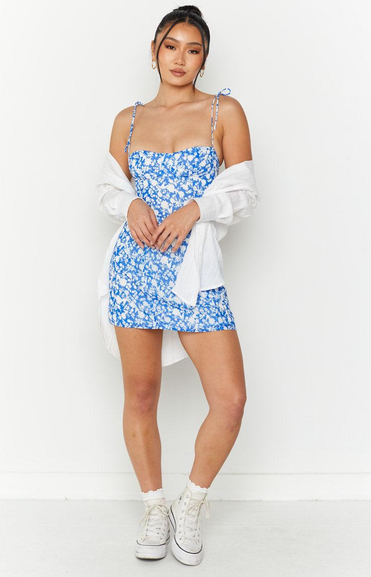 Blue Floral Mini Dress The cutest vacay mini dress for your next holiday at a warm destination! Pair with gold jewellery and sandals or sneakers. Mini length Lightweight material with no stretch Tie-up shoulder straps Flowy Lined Invisible zipper at back Blue floral print