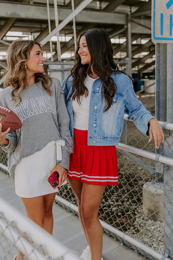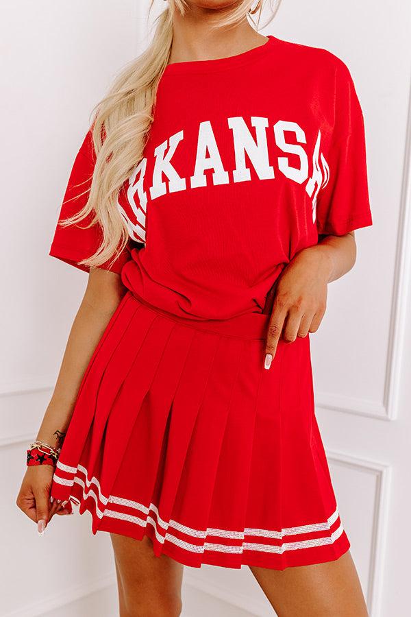 - Cheer on your team in this cute pleated skort! Featuring bold jersey-style accent stripes, it's perfect for showing off a sporty-chic vibe on game day. Crisp pleats make it perfect for letting your team spirit shine. Rally your friends and get ready to celebrate in style with this adorable piece. Get the Game Day essentials for supporting your team: The Arkansas Razorbacks! - Stretchy pleated material - Built-in stretchy shorts - An elastic waistline - Jersey-style sequined accent stripes at the bottom of the skirt - A flattering silhouette that ends in a pleated upper-thigh length hemline - This piece is perfect for fans of Arkansas, Georgia, Texas Tech, Alabama, Oklahoma, and more!