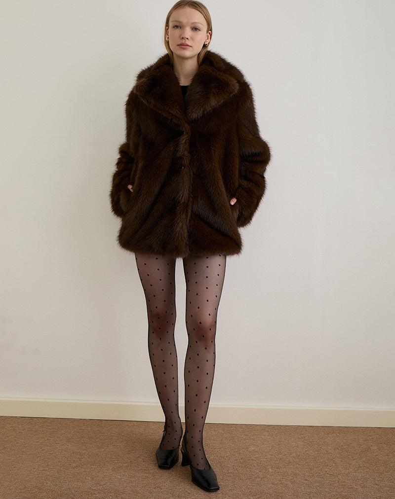 The Pepita jacket in dark brown faux fur is cut in a plush, oversized silhouette. Featuring a deep lapel and a clean open front, it offers a luxurious feel with a relaxed shape. Paired with the Lirenda dress. MODEL WEARS SIZE: EXTRA SMALL - MODEL HEIGHT:5'10