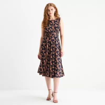 Perceptions Womens Sleeveless Floral Midi Fit + Flare Dress
