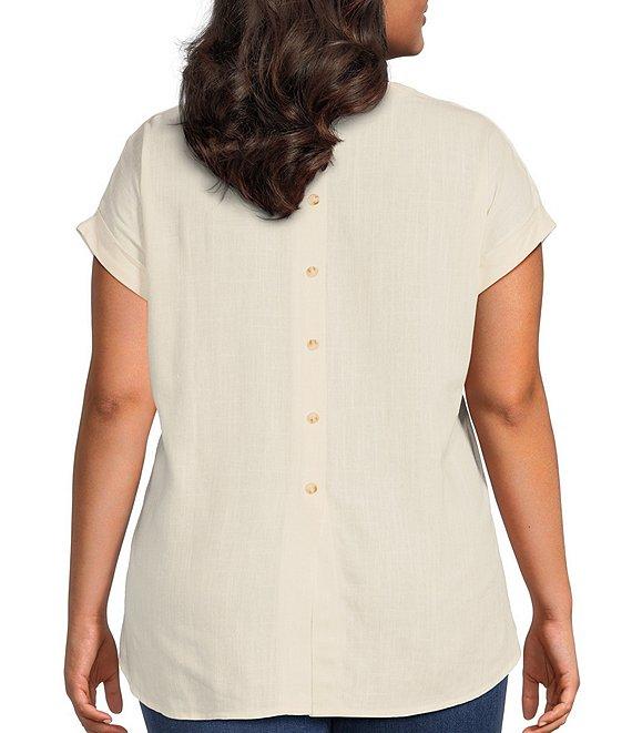 Perch By Blu Pepper Plus Short Sleeve Back Button Woven Linen Blend Top
