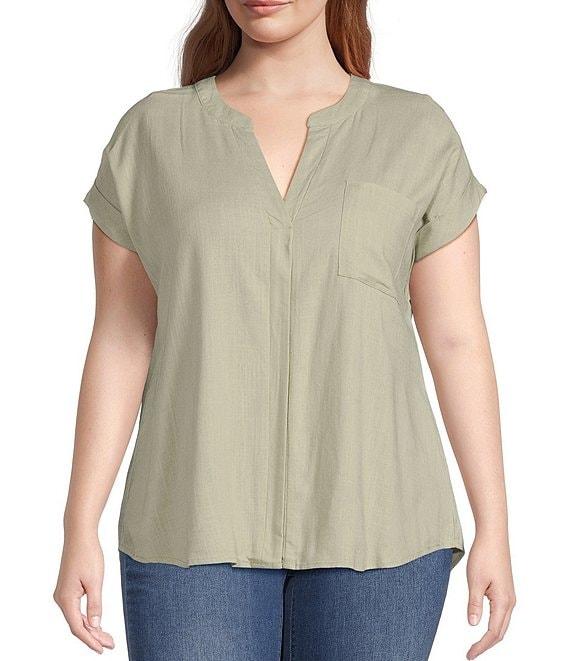 From Perch By Blu Pepper Plus, this top features: Split V-neckline Short sleeves Front pocket detail Back button closure Rayon/linen Hand wash/dry flat Imported.