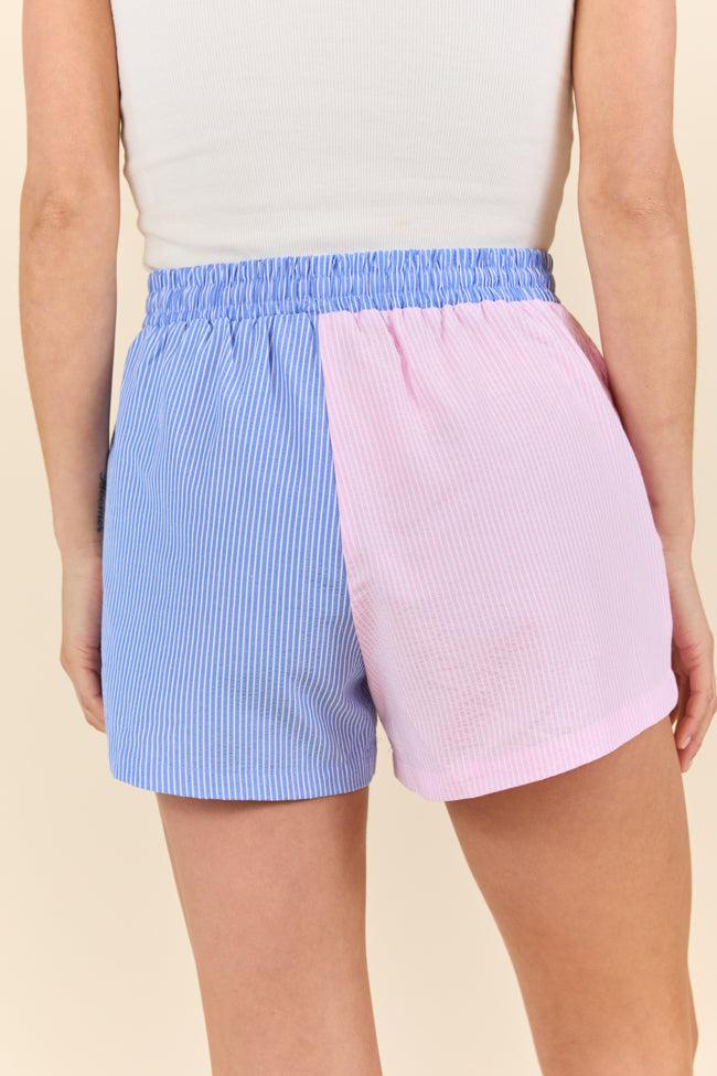 Details Blue and Pink Colorblock Striped Lounge Shorts Fabric only has stretch in elastic Drawstring elastic waistband, functional pockets Unlined Size small inseam: 3" Material and Care 45% cotton 55% polyester Machine wash cold, no drum drying Patterns may vary Materials may have natural variations Colors may vary from different viewing devices.