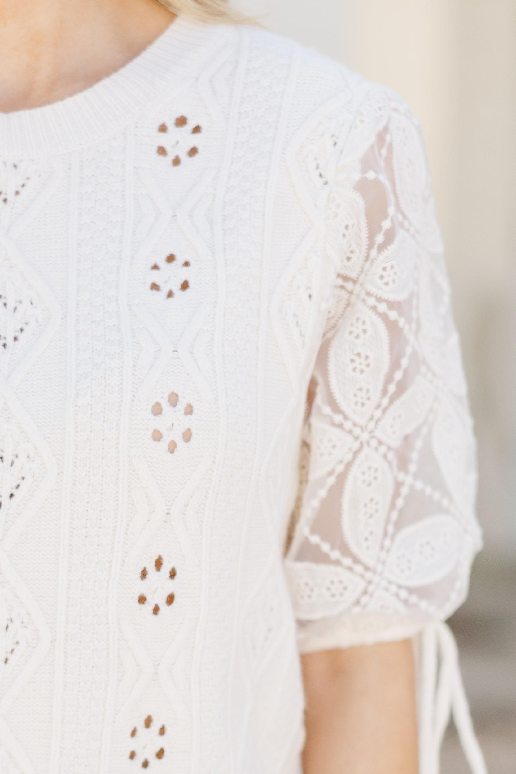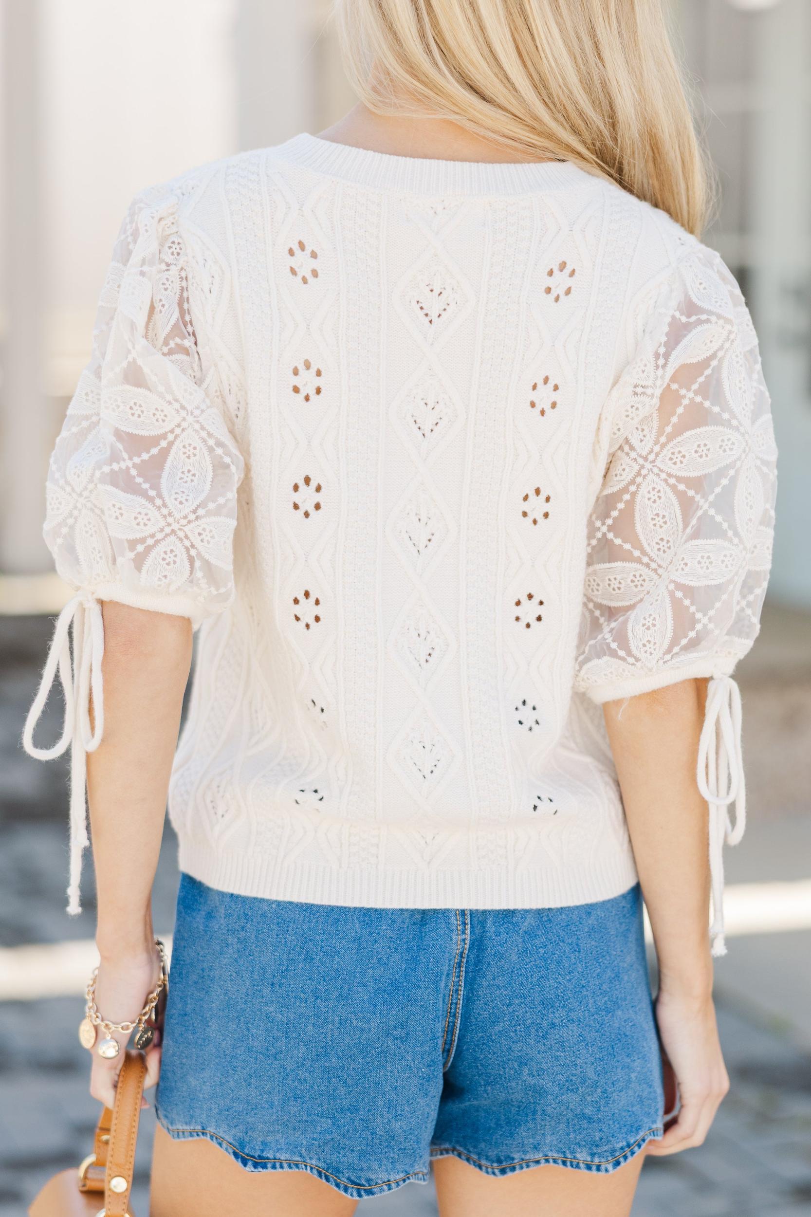 Cozy meets chic in this darling cream knit! The lacey sleeves and eyelet details add a dash of romance, while the drawstring cuffs keep things cute and playful. It's the kind of top you’ll throw on for coffee dates, park picnics, and everything in between. Style it with denim and you're set! Round neckline Short puff sleeves with tied bow detailing Eyelet fabric Material has a fair amount of stretch Baileigh is wearing the small.