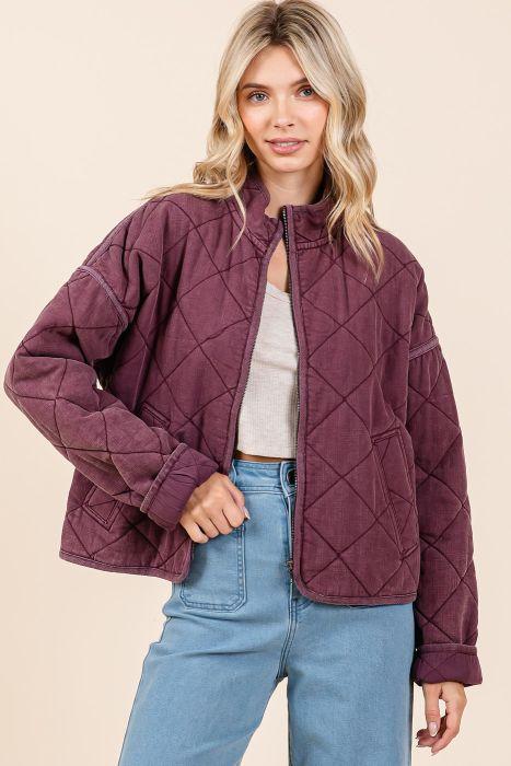 The Perfect Tone Quilted Jacket: sleek, stylish, and ready for any adventure. The quilted mineral wash fabric offers hassle-free stretch and a relaxed fit, perfect for all-day wear. With a high collar, front zipper closure, and drop shoulder design, this jacket is both functional and fashionable. Plus, it has convenient pockets for all your essentials. Stay comfortable and chic in this unique jacket. Details Quilted Mineral Wash Jacket Fabric hassle stretch, relaxed fit High collar, Front zipper closure, Drop shoulder with long sleeves and pockets Pair this cute jacket with jeans and booties Unlined Material and Care 100% Cotton Patterns may vary Materials may have natural variations Colors may vary from different viewing devices.