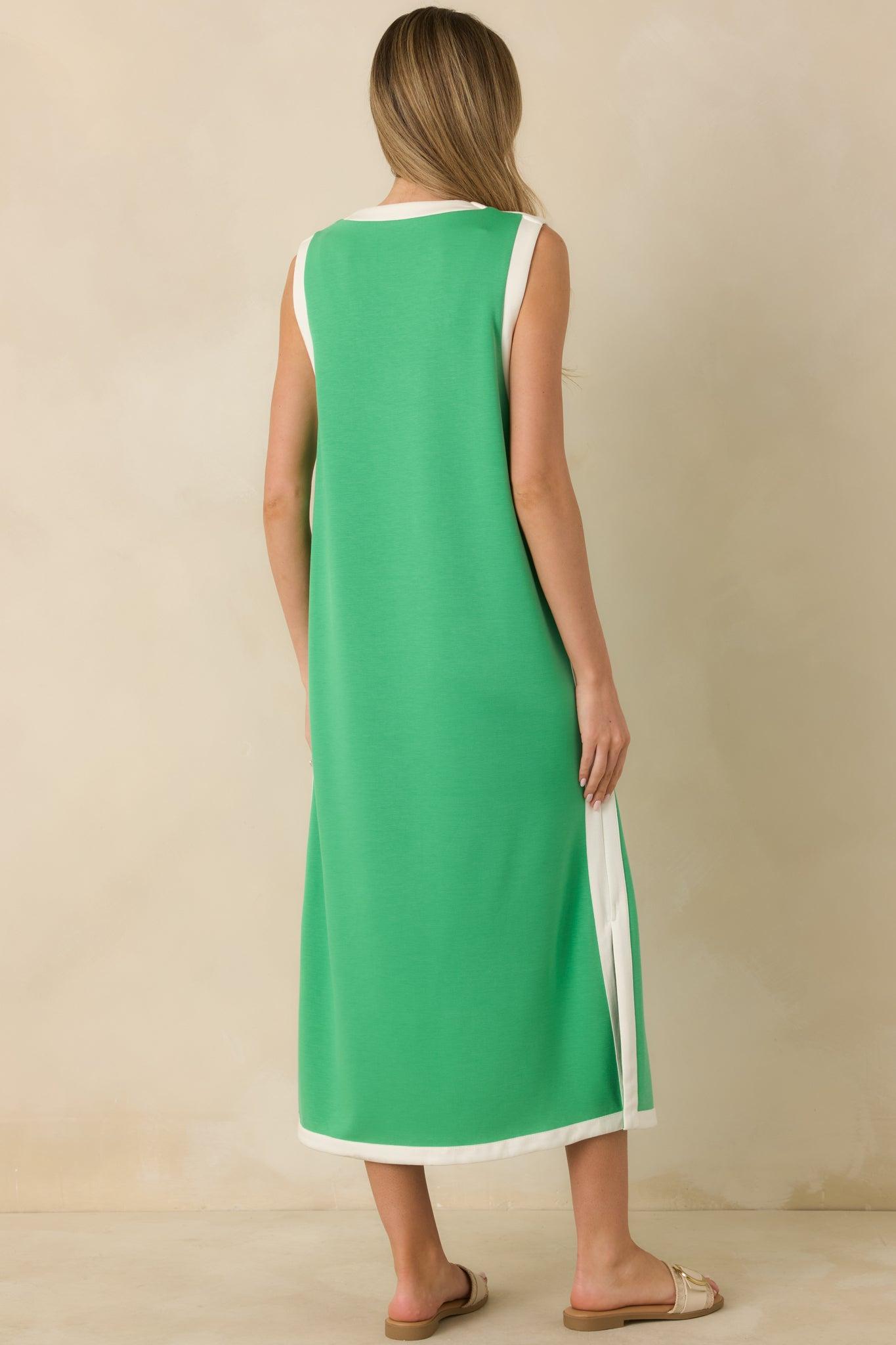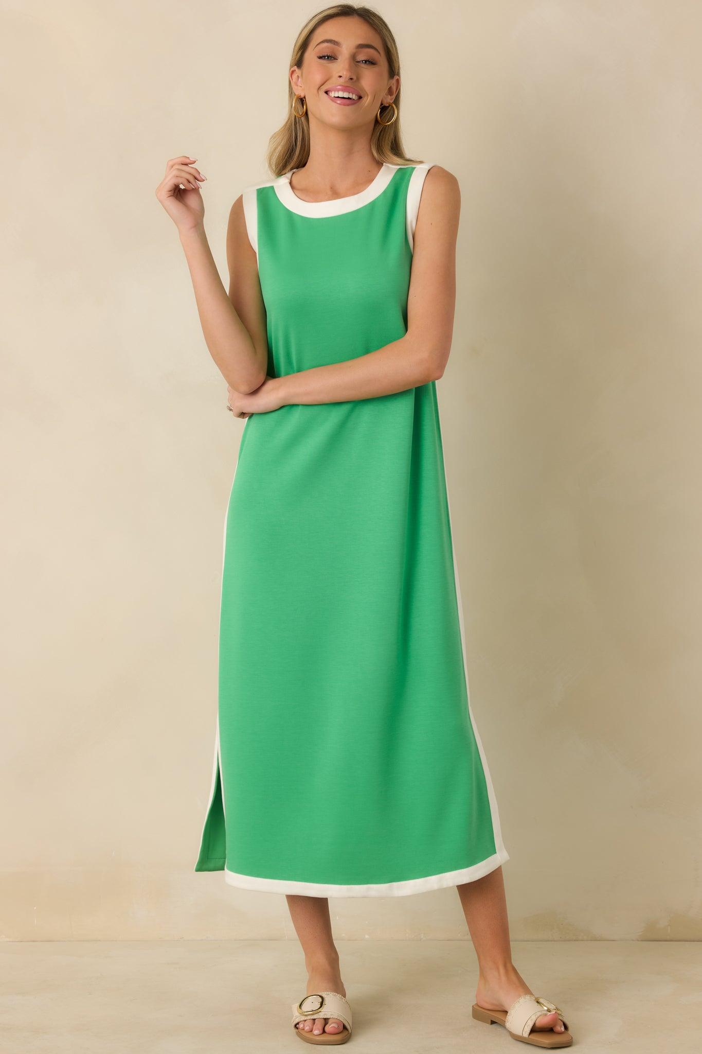Effortless meets elevated in the Perfectly Framed Green Jersey Knit Contrast Trim Sleeveless Maxi Dress. The soft, easy drape gets a polished boost from contrast trim that outlines every curve just right, giving the whole look that clean, modern frame. Equal parts relaxed and refined, it’s the throw-on style that still feels intentionally put-together—whether you pair it with sneakers, slides, or a sleek little jacket. This green sleeveless jersey knit maxi dress features a relaxed straight silhouette with contrast ivory trim along the neckline, armholes, side seams, and hem. Designed with a crew neckline, underarm panels, side slits for ease of movement, and a soft, stretchy midweight knit fabric. 55% Rayon, 40 Cotton, & 5% Spandex Unlined Hand Wash Cold Manufactured in China Designed in The USA Model is 5'8" and Wearing a Size Small, Clipped, Model is a True X-Small