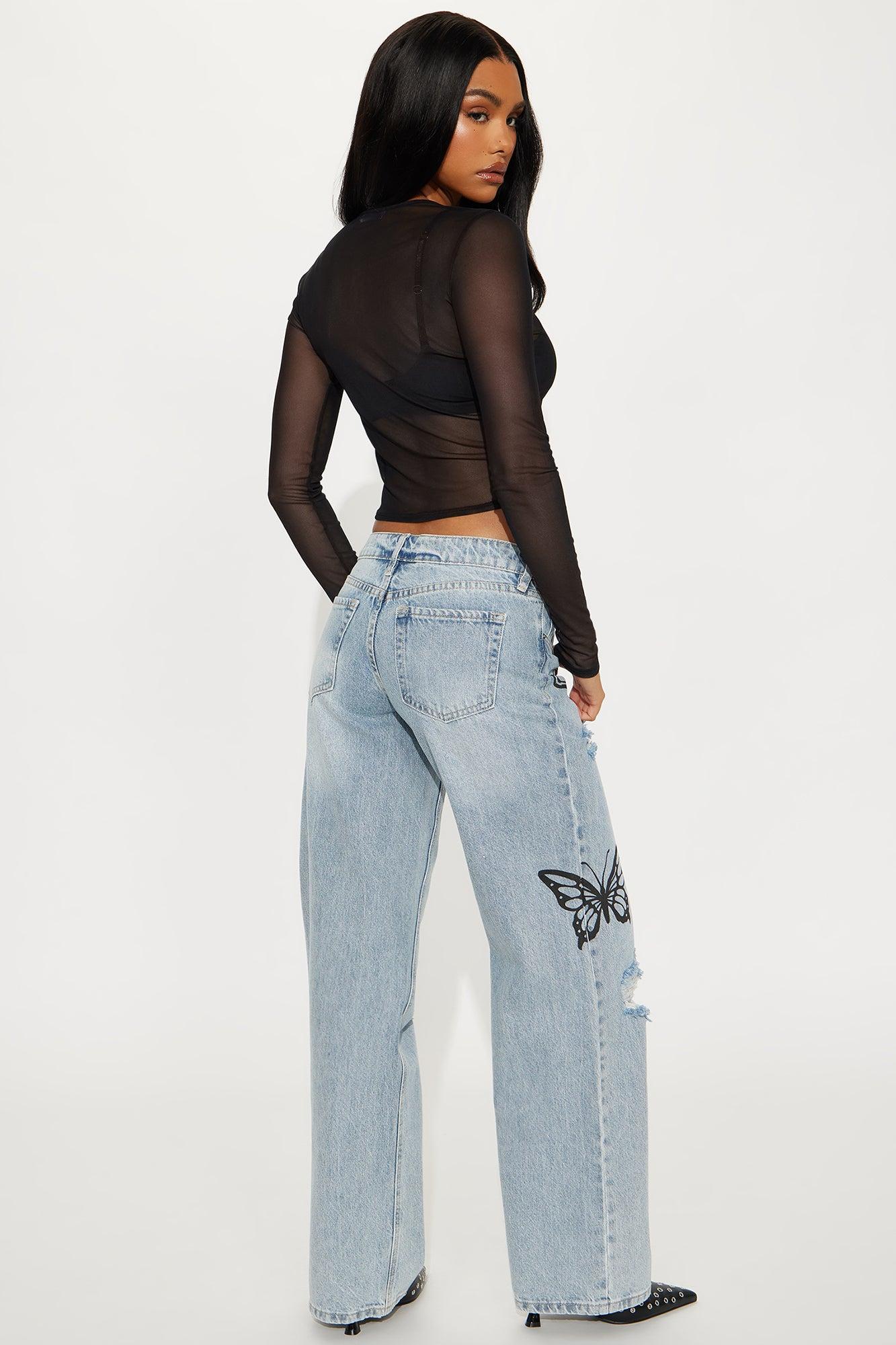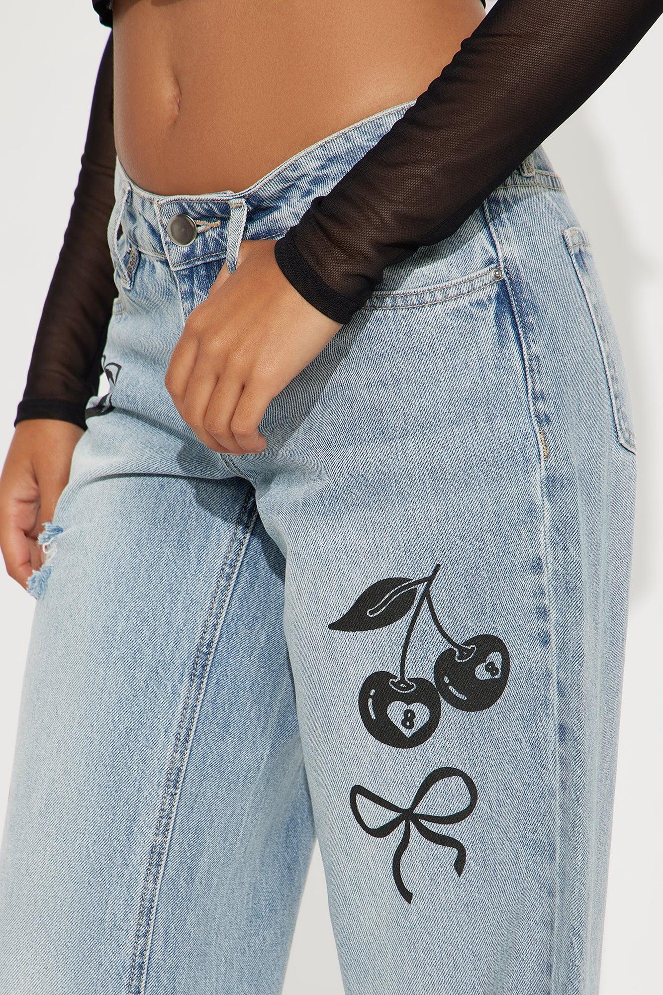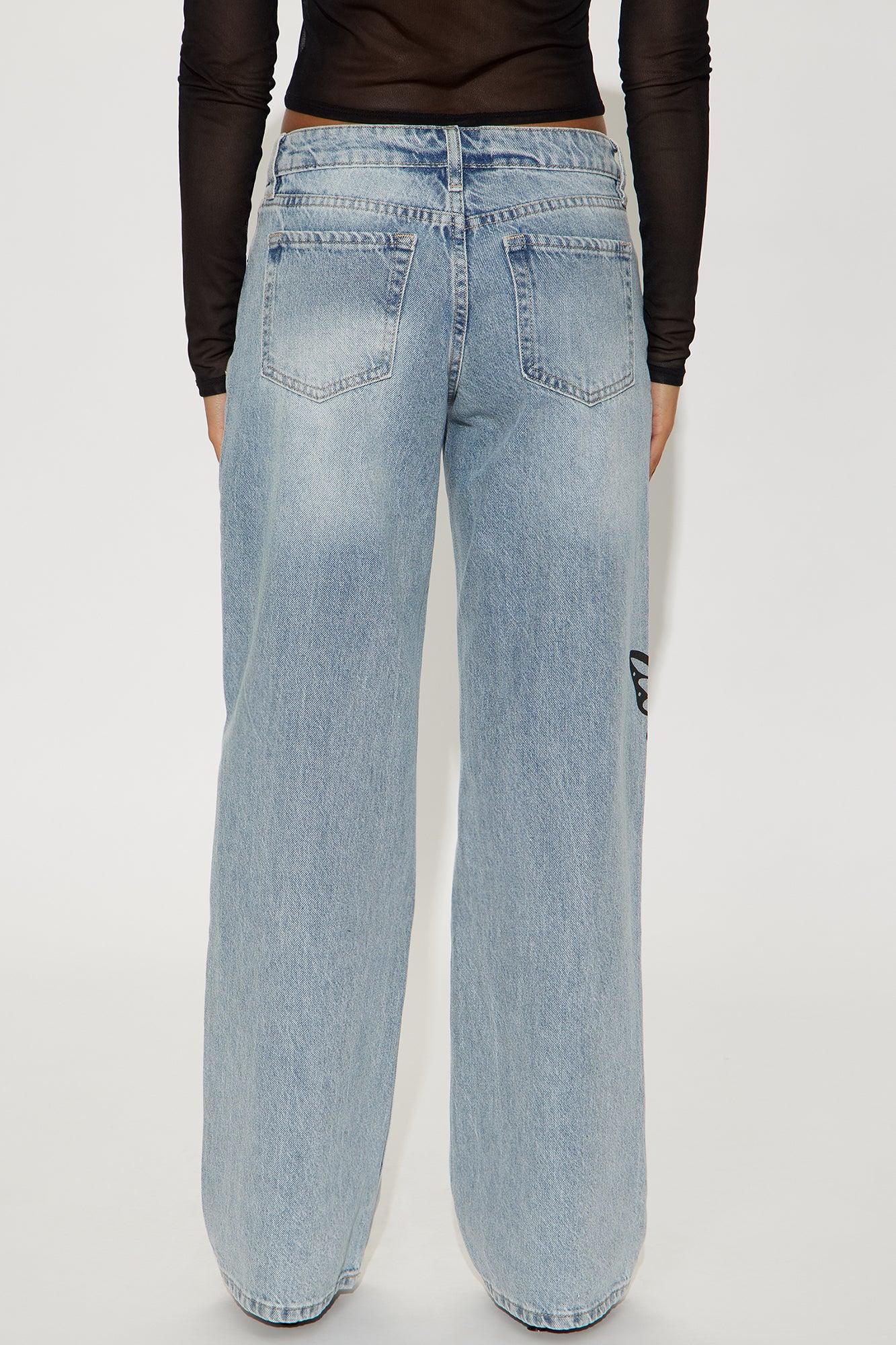 Available In Light Wash. Wide Leg Jean 5 Pocket Graphic Print Ripped Front Zipper and Button Detail 8.5" Low Rise 33" Inseam 100% Cotton Non Stretch Disclaimer: Due To The Specialized Wash, Printing & Distressing Process, Each Garment Is Unique. Imported