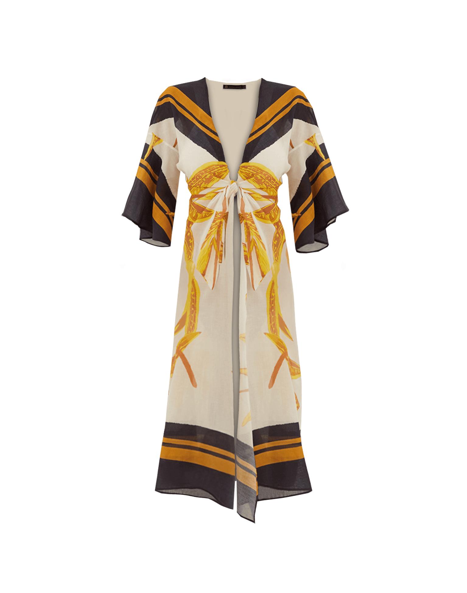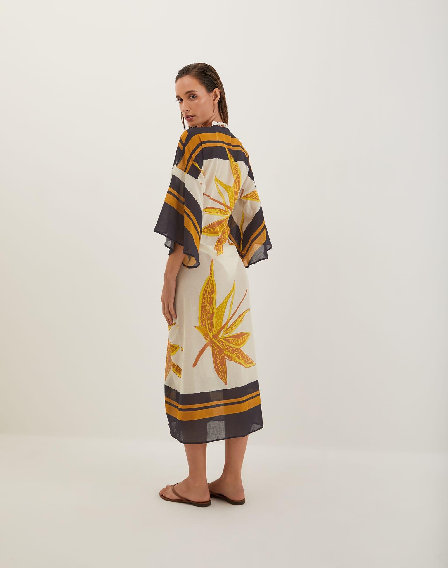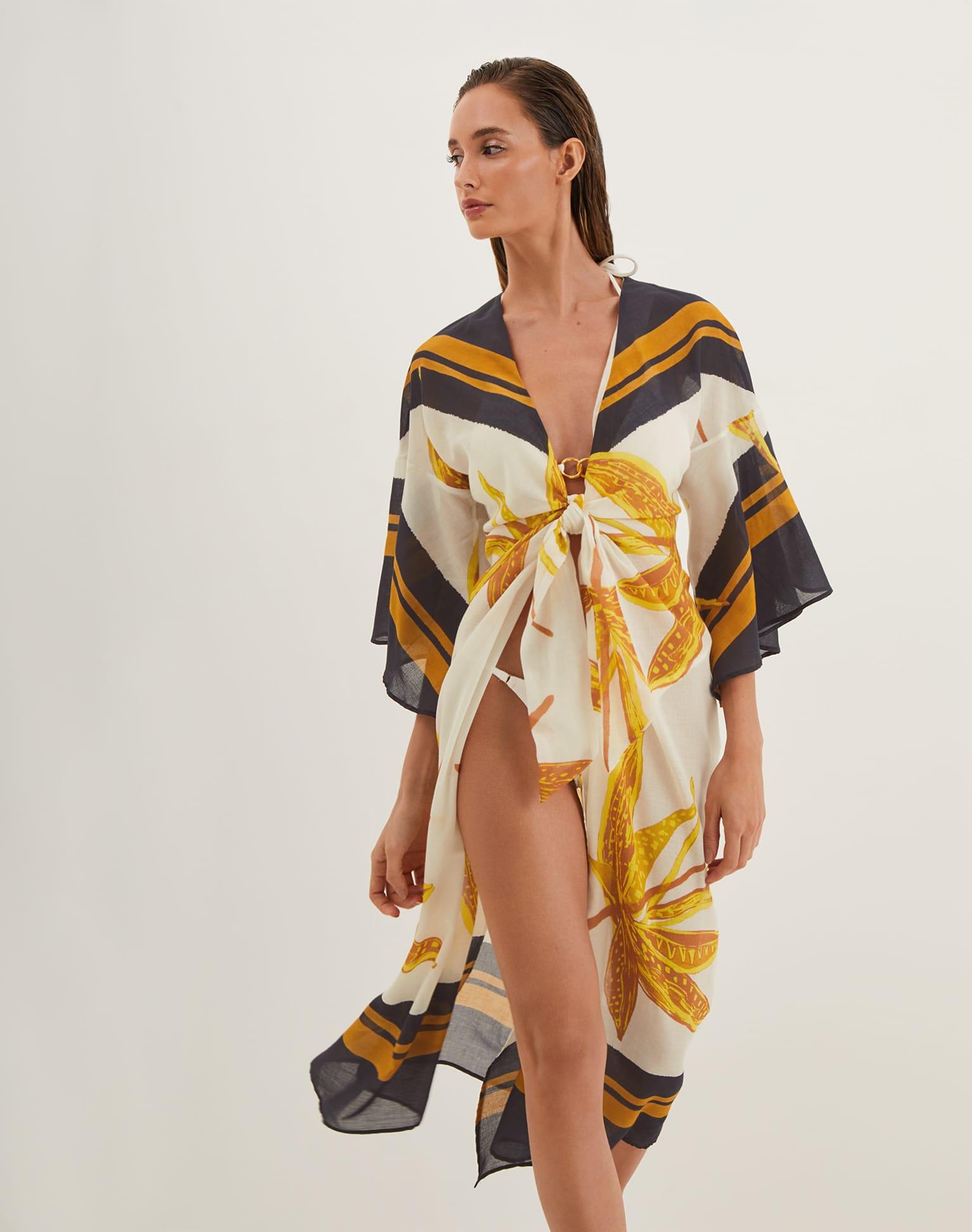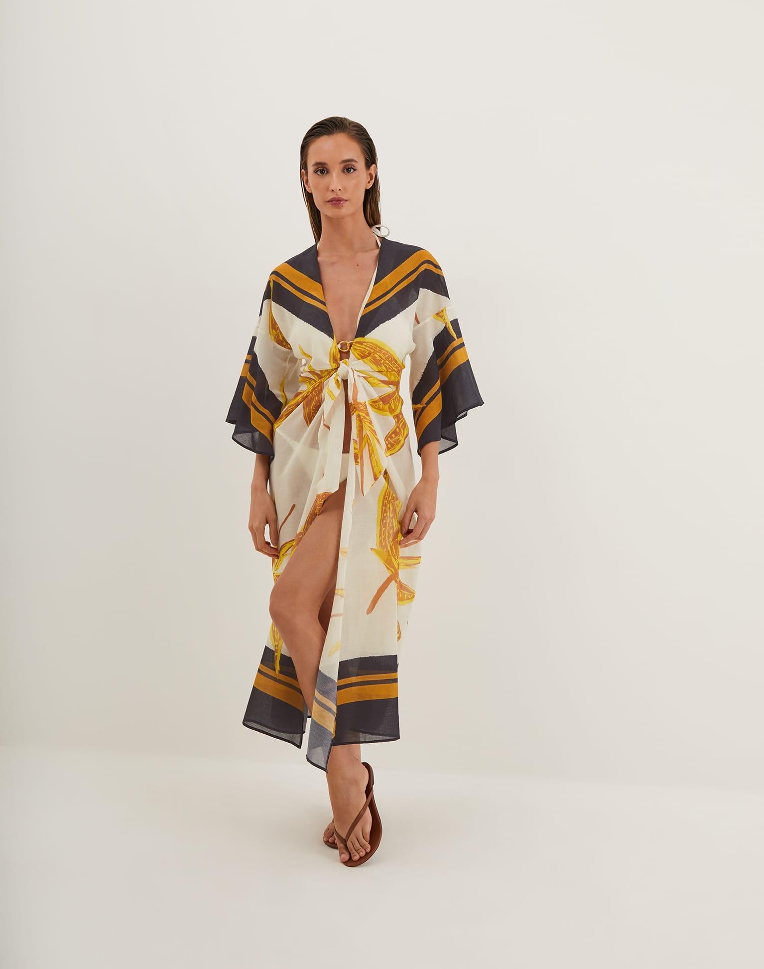 The ViX Perola Long Caftan is your effortlessly chic solution for those must-cover-up moments. Crafted from lightweight fabric, it features breezy ¾ sleeves and a stylish front knot tie, combining comfort and elegance for any occasion. Style the Perola Long Caftan with a matching swimsuit and sandals for a resort-ready