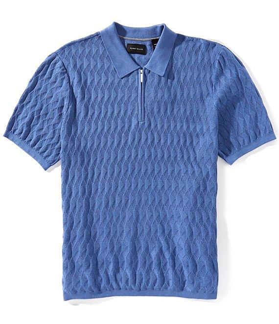 From Perry Ellis, this polo shirt features: Textured, geo pattern Mock neck Short sleeves Quarter-zip closure Pullover construction Cotton/modal Machine wash/tumble dry Imported.