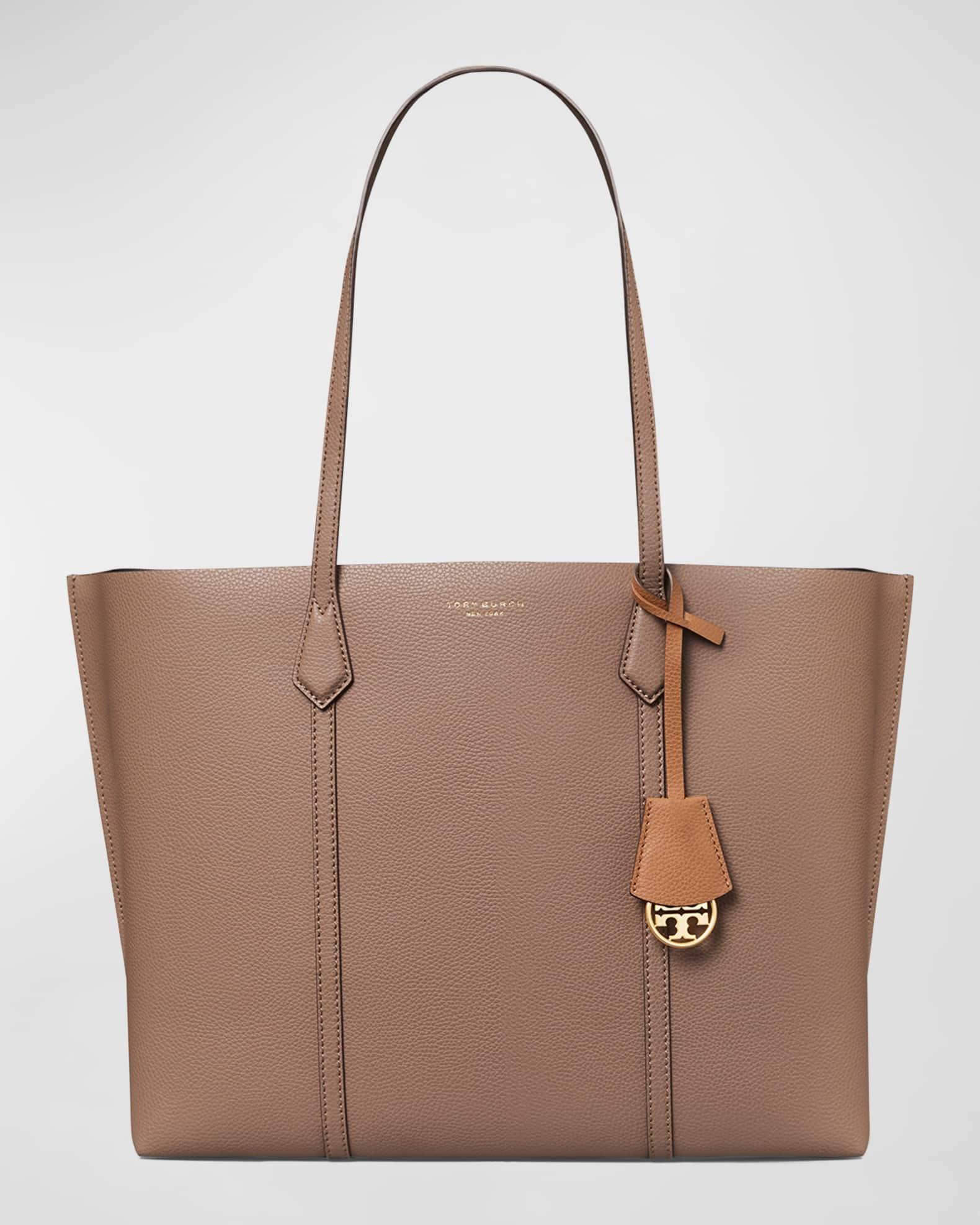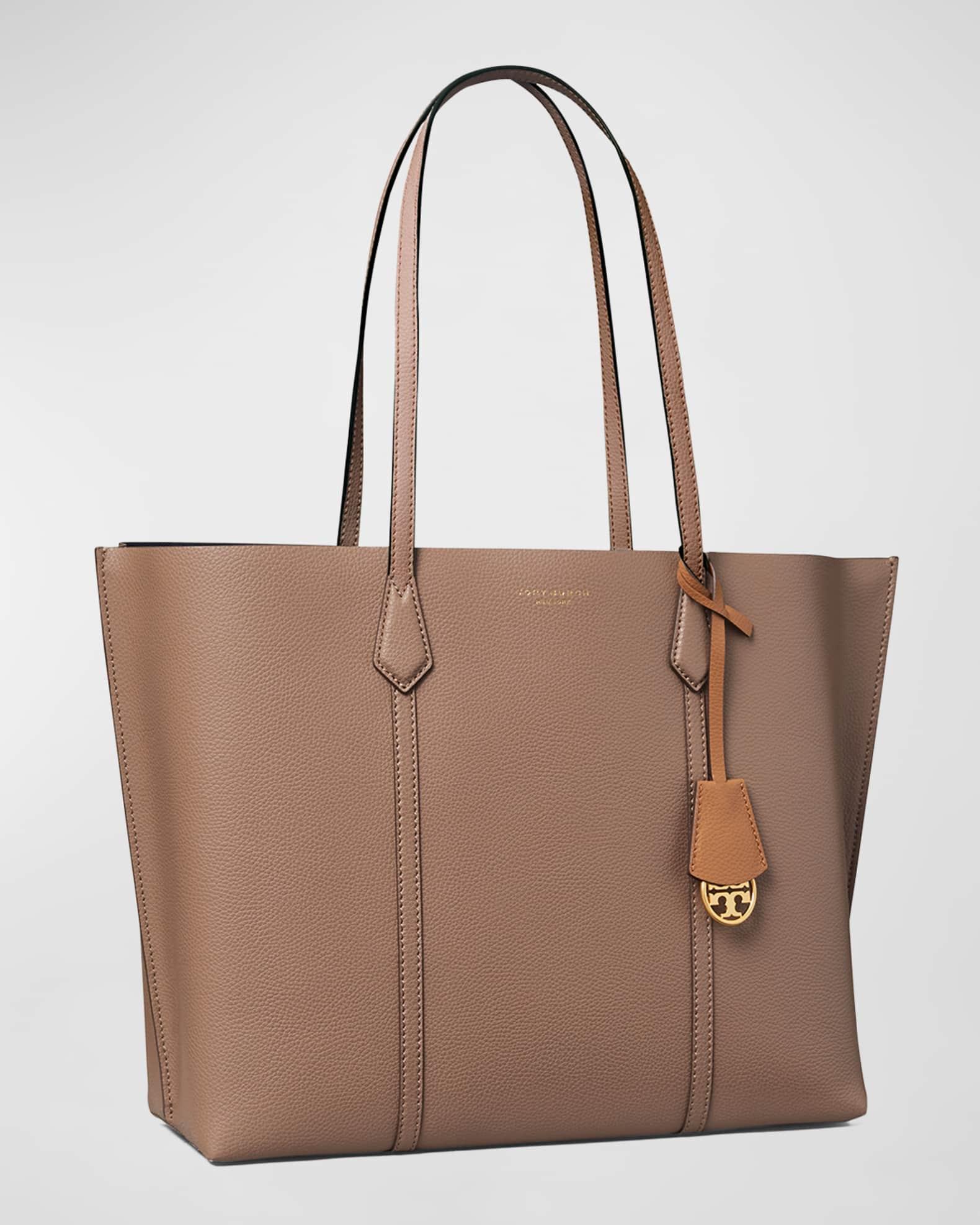 A thoughtful approach to extreme function. The Perry tote is updated with additional pockets for organization, longer straps that fit comfortably over the shoulder and extra room — with a center zip compartment that fits a laptop. Made of Italian pebbled leather, it now has protective feet and comes with a removable charm, in tonal or contrast colors. Tory Burch tote bag in leather. Flat shoulder straps with a 10.4" drop; removable logo charm. Can be worn on the shoulder. Open top; center zip divides interior. Holds a 13" laptop. Three slip pockets. Protective metal feet. Item weighs approx. 2.2 lb. Dimensions: 11.6"H x 14.3"W x 5.3"D. Nylon/polyurethane Clean with soft cloth "Perry" is imported.