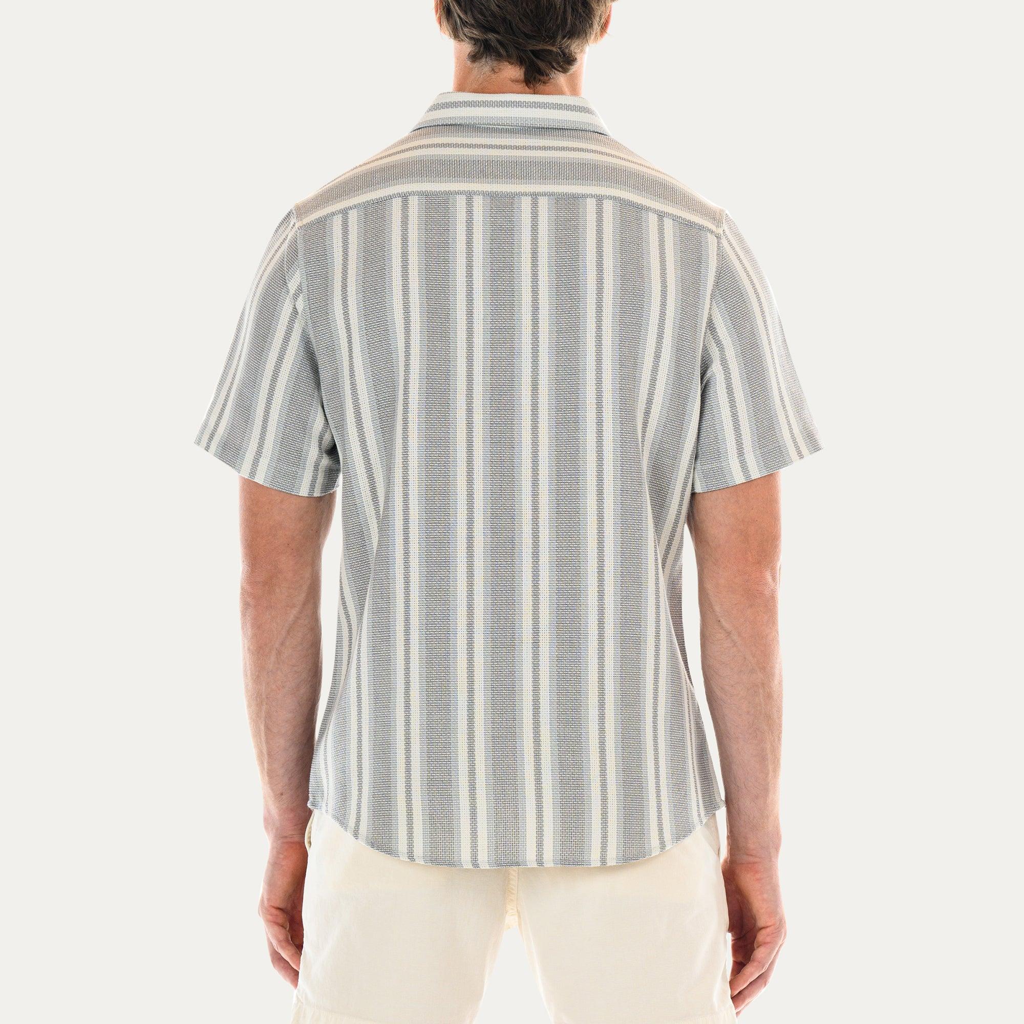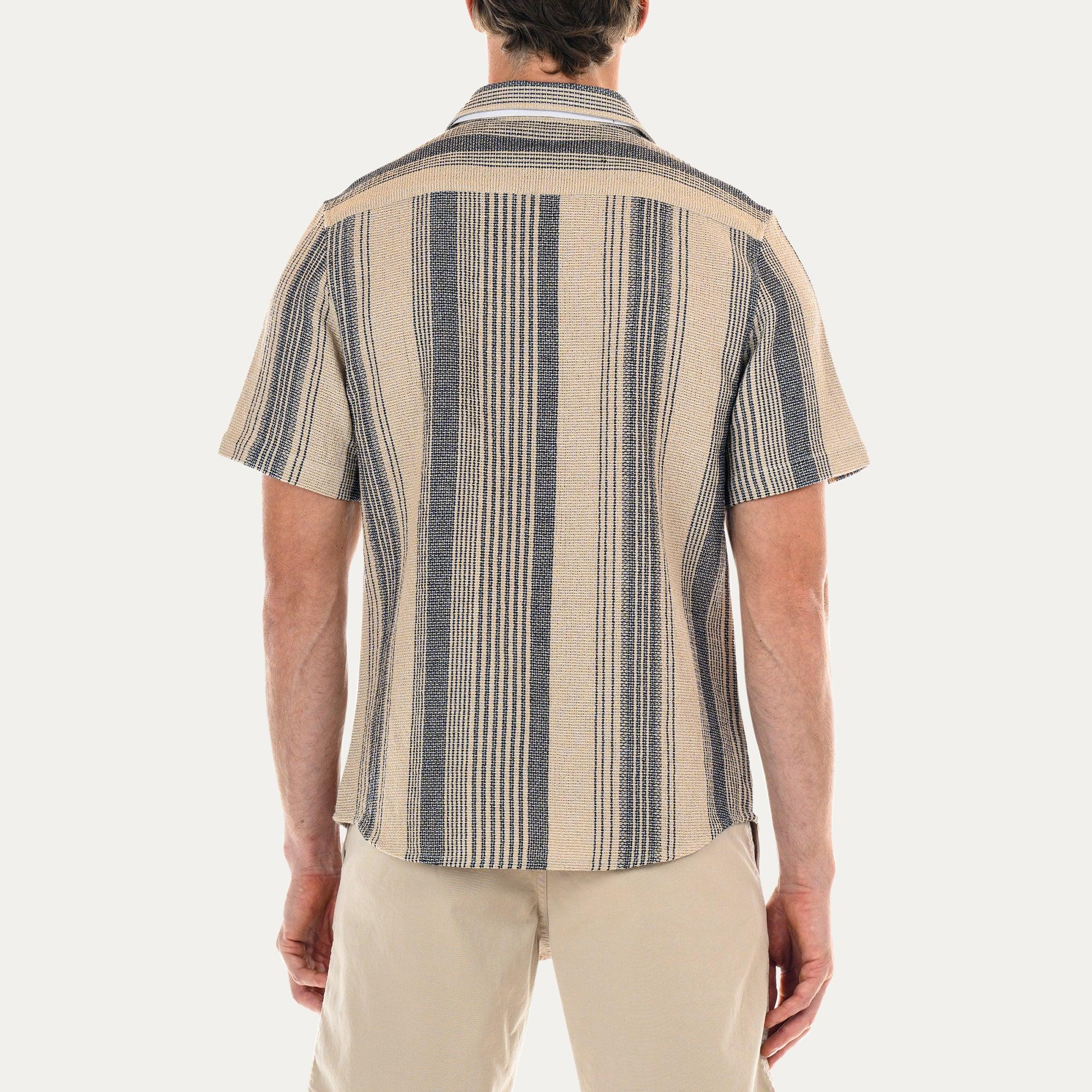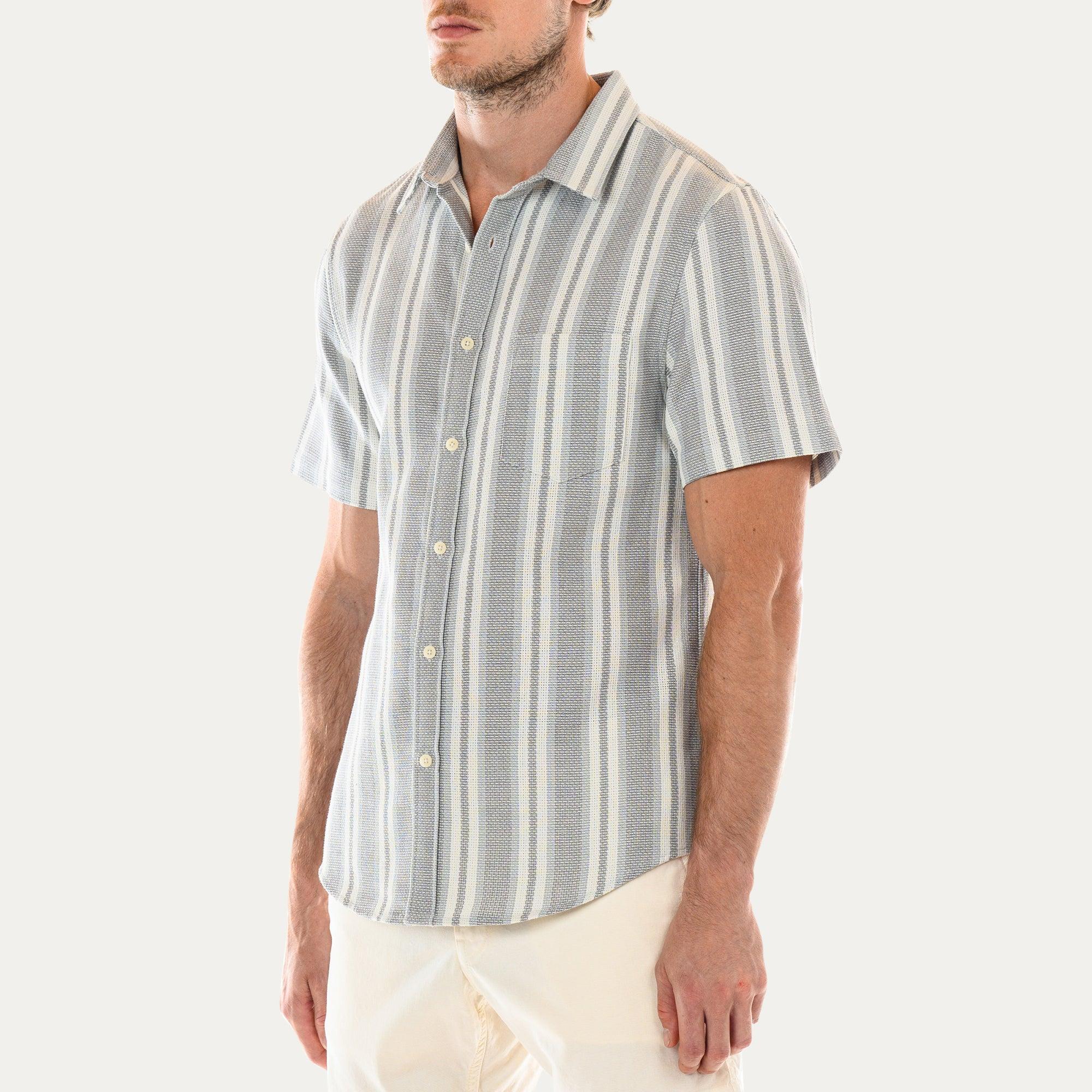 The Perth short sleeve shirt features a classic fitting silhouette, full button placket, and a pointed collar. Made from 100% midweight cotton burlap fabric, with a textured weave and striped pattern. Pointed collar Button front opening Classic fit Front patch pocket Model is wearing a size medium Machine wash in cold water and dry on low heat Garment dyed in Los Angeles, CA