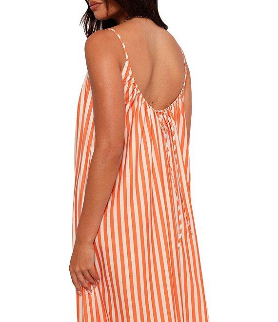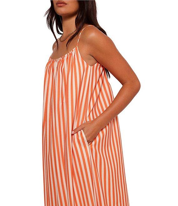 From Petal & Pup, this dress features: Stripe print Round neckline Sleeveless Adjustable straps detail Tie close detail at back Pull-over construction Functional side pockets Approx. 53.93" length Lined Polyester Hand wash Imported.