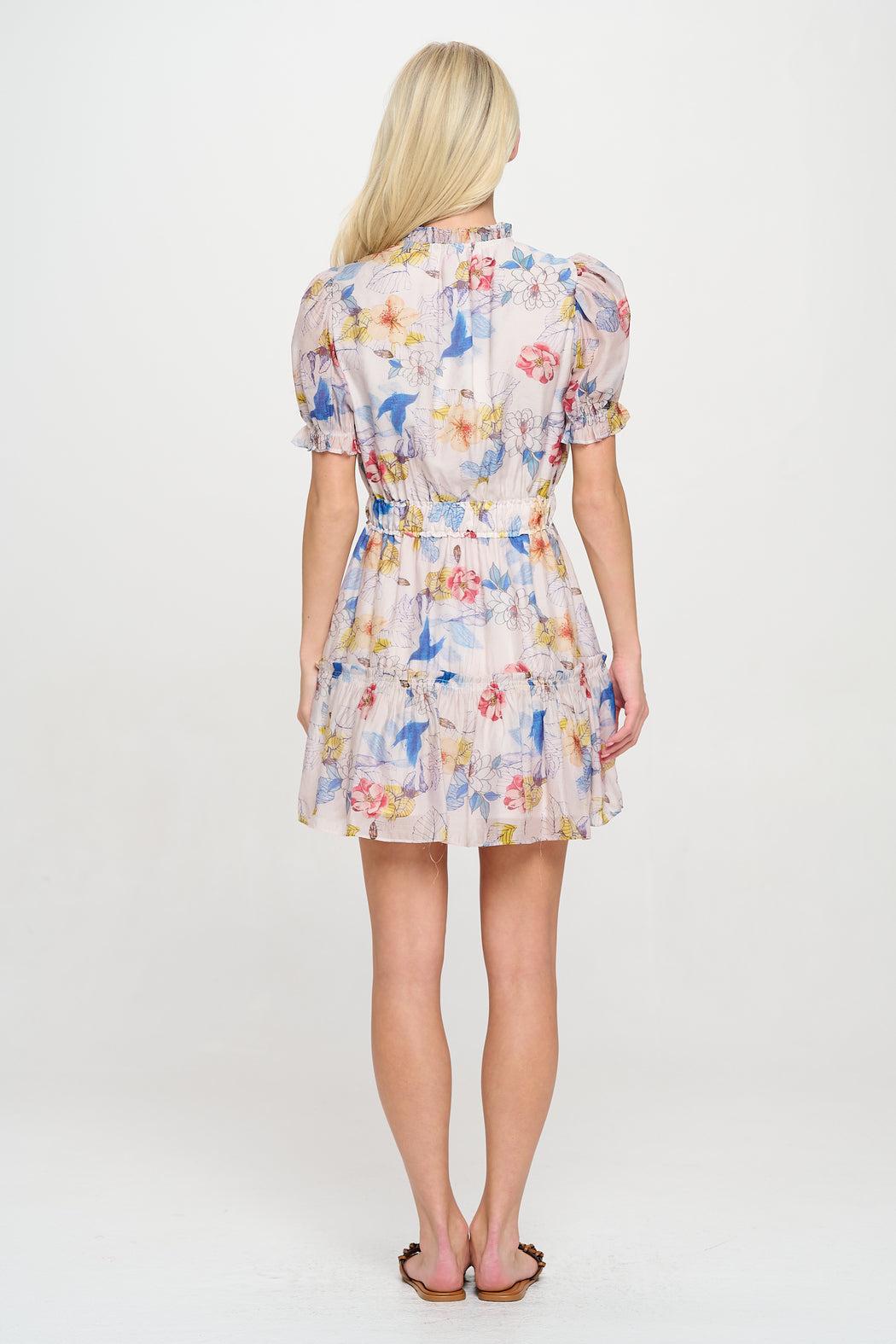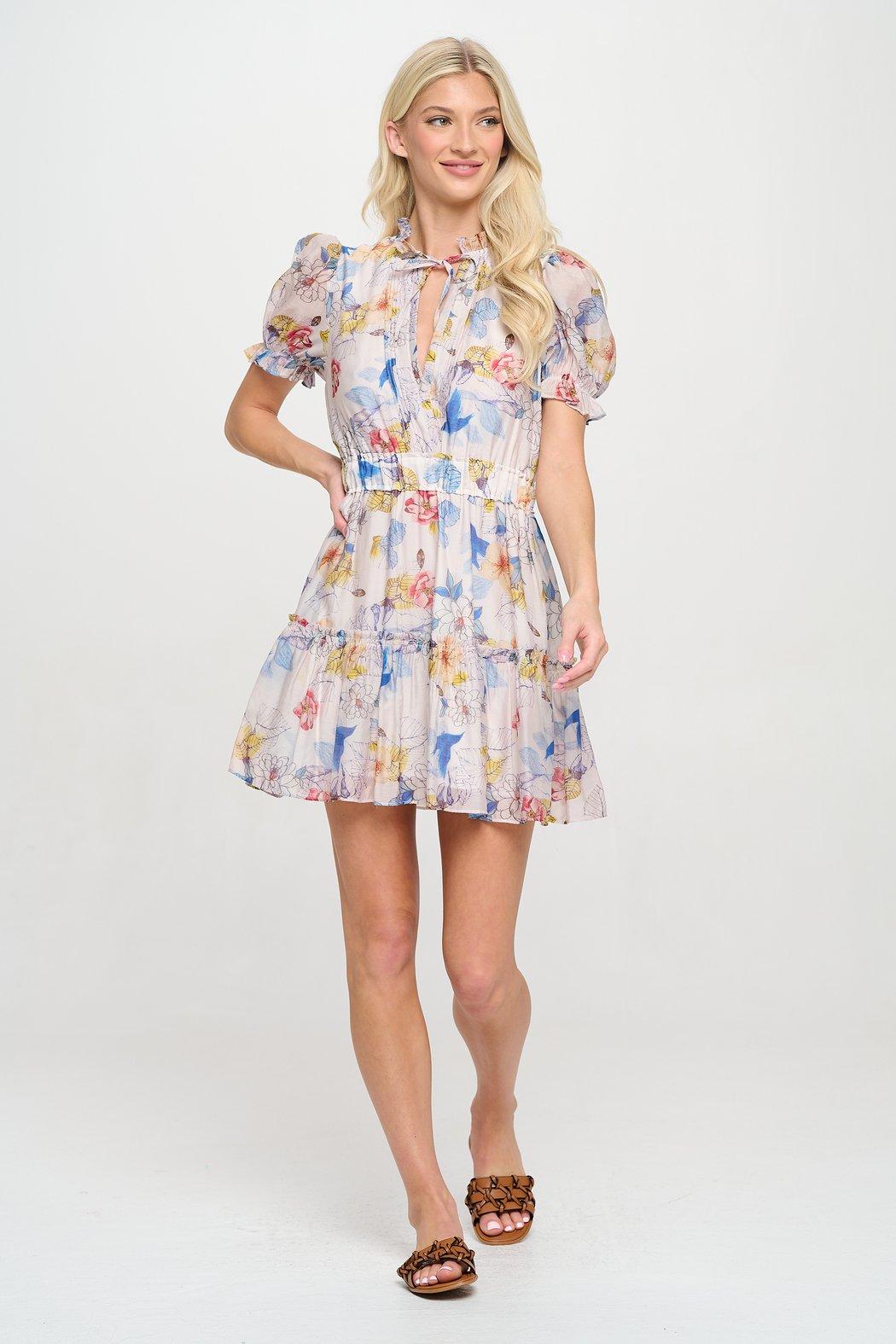 This flirty floral mini dress captures the essence of easy romance. Designed with a feminine ruffle neckline, front tie detail, and puff sleeves, this breezy silhouette features a softly gathered waist and tiered hem for a flattering flow. Lightweight and effortless, it’s perfect for garden parties, brunch dates, or warm-weather getaways.