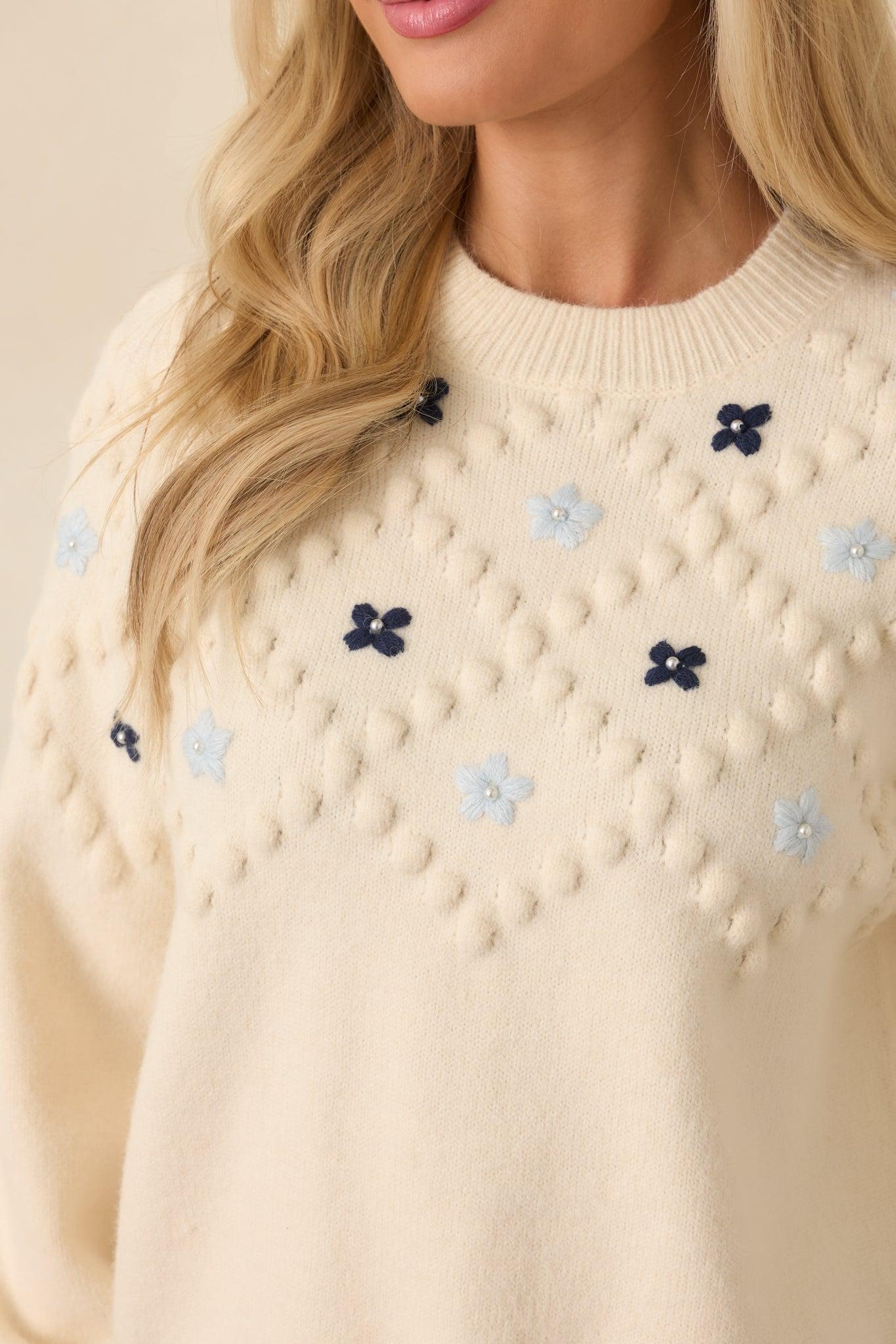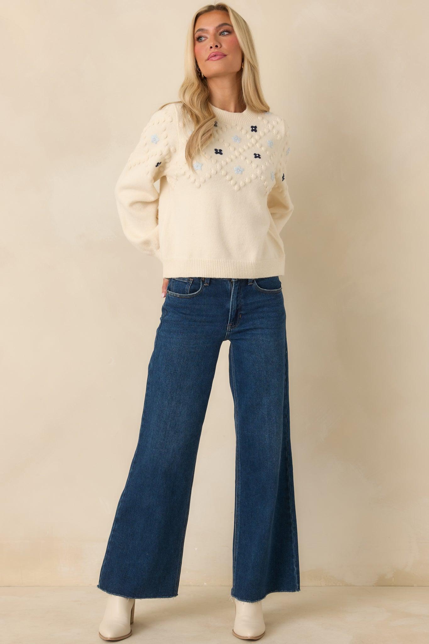 Petals and Pearls Ivory Multi Knit Floral Embroidered Crewneck Sweater is all about the little details that make an outfit feel special. Soft embroidery, subtle texture, and a cozy knit come together for a sweater that feels feminine without trying too hard. It’s the kind of piece you reach for when you want something simple, sweet, and quietly polished. This ivory knit sweater features a soft, medium-weight fabric with raised bobble texture throughout and multicolor floral embroidery across the front. Designed with a classic crew neckline, long sleeves, and ribbed trim at the neckline, cuffs, and hem. 52% Acrylic, 28% Nylon, & 20% Polyester Unlined Hand Wash Cold Manufactured in China Designed in the USA Model is 5'8" and wearing size small