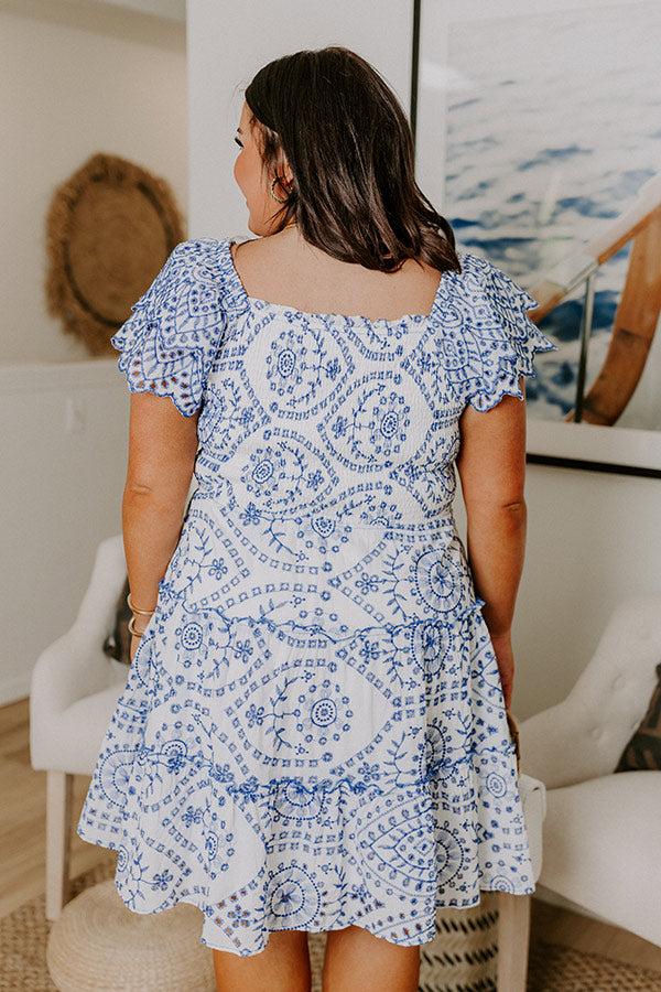 - From brunches to strolls through the park, this cute mini dress is all about charming moments! The embroidered eyelet material and smocked details add a playful twist that's perfect for everyday plans. - Lightweight eyelet material with blue colored embroidery - An elastic square cut neckline - Short, loose sleeves with scalloped cuffs - A smocked bodice - An elastic waistline - Hidden side pockets - A flowy and flattering silhouette that ends in a straight, mini dress length hemline