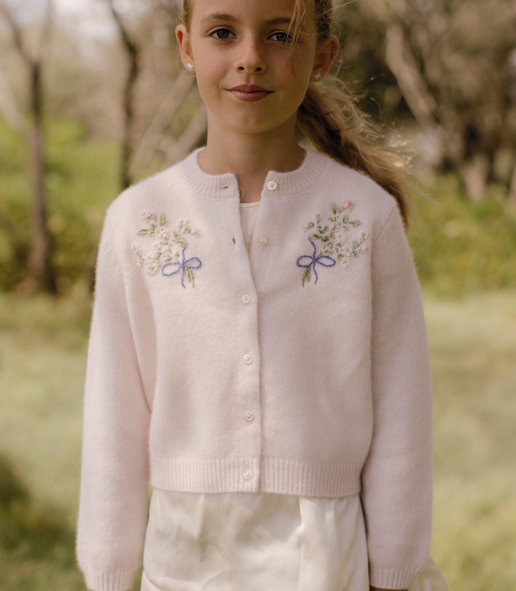 In the softest cashmere, our Petit Gardenia Cardigan takes inspiration from ‘50s embroidered cardigans, featuring a classic crew neck, raglan full-length sleeves, and embroidered flowers adorned with sequins. Ribbing lends texture to the collar, hem, and cuffs, and a line of buttons extends down the front.
