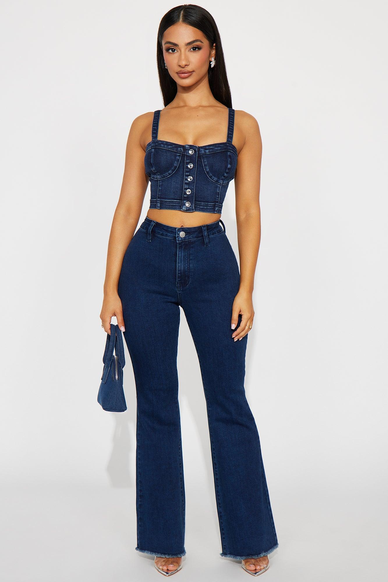 Available In Acid Wash Denim. Pair With 15 Minutes Of Fame Denim Corset Tank Available in Petite 31", Regular 34" Inseam, & Tall 37" Inseam. Flare Jean Medium Stretch Denim Functional Back Pockets 11" High Rise 69% Cotton 29% Polyester 2% Spandex Imported