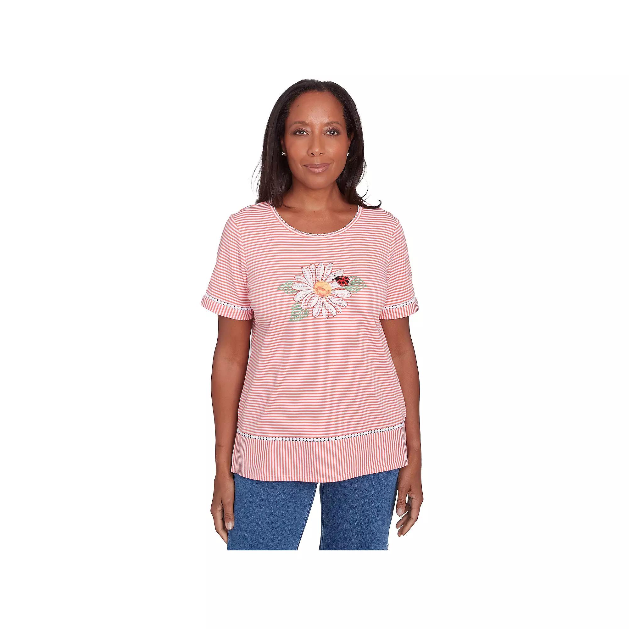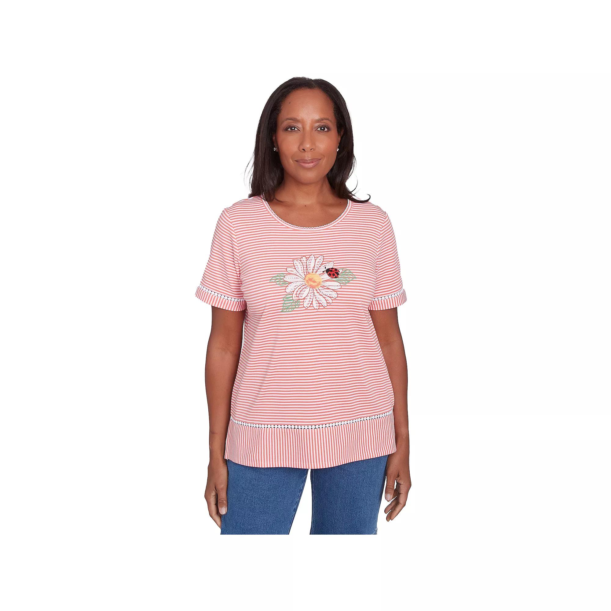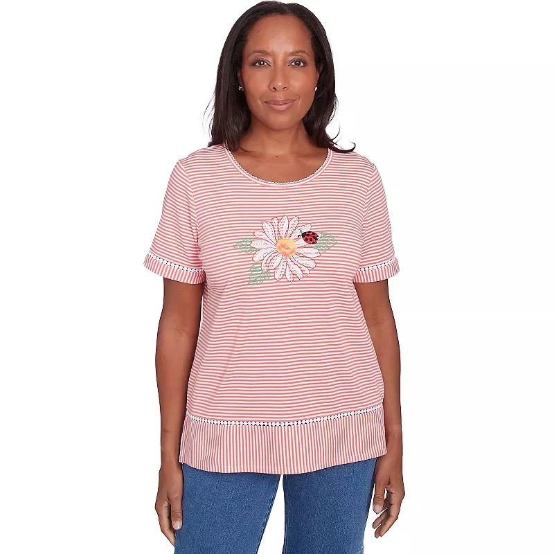 This women's daisy knit striped tee from Alfred Dunner is sure to become a favorite piece in your wardrobe.Click on this WOMEN'S GUIDE to find the perfect fit and more!This women's daisy knit striped tee from Alfred Dunner is sure to become a favorite piece in your wardrobe. Click on this WOMEN'S GUIDE to find the perfect fit and more!FEATURES No closure - pullover styling Crewneck Short sleeves Playful daisy pattern adds a touch of whimsy Soft knit fabric ensures comfort and breathabilityFIT & SIZING 22.5-in. length from shoulder to hemFABRIC & CARE Cotton, polyester Machine wash and tumble dry Imported Size: M Petite. Color: Coral. Gender: female. Age Group: adult.