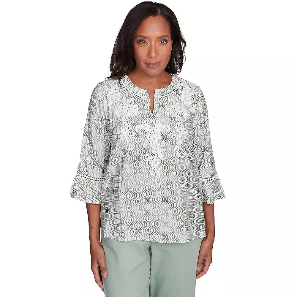 This geometric print shirt is a stylish fusion of bold design and delicate details. Featuring a split neckline adorned with intricate embroidery, it offers a refined yet relaxed look. The three-quarter flare sleeves add movement, while the straight hemline with split vents ensures an airy, comfortable fit.Click on this WOMENS GUIDE to find the perfect fit and more!This geometric print shirt is a stylish fusion of bold design and delicate details. Featuring a split neckline adorned with intricate embroidery, it offers a refined yet relaxed look. The three-quarter flare sleeves add movement, while the straight hemline with split vents ensures an airy, comfortable fit. Click on this WOMENS GUIDE to find the perfect fit and more!FEATURES Button front 3/4-length sleeves SplitneckFIT & SIZING 23 1/2-in. length from shoulder to hemFABRIC & CARE Rayon, nylon Machine wash and line dry Imported Size: XL Petite. Color: Aloe. Gender: female. Age Group: adult. Pattern: embroidered.