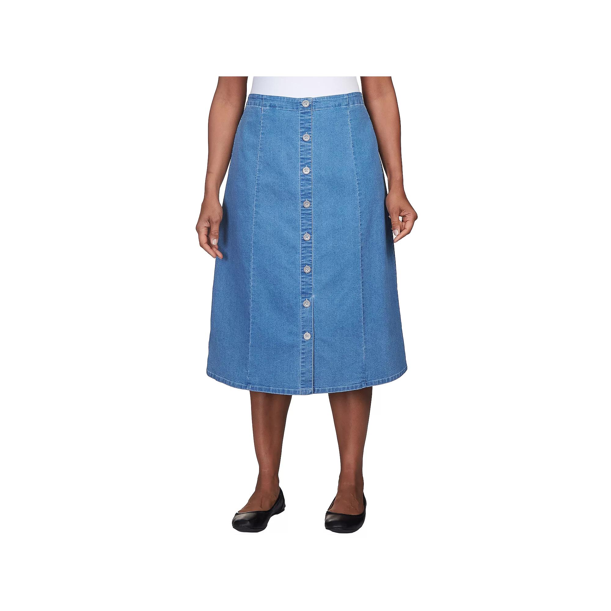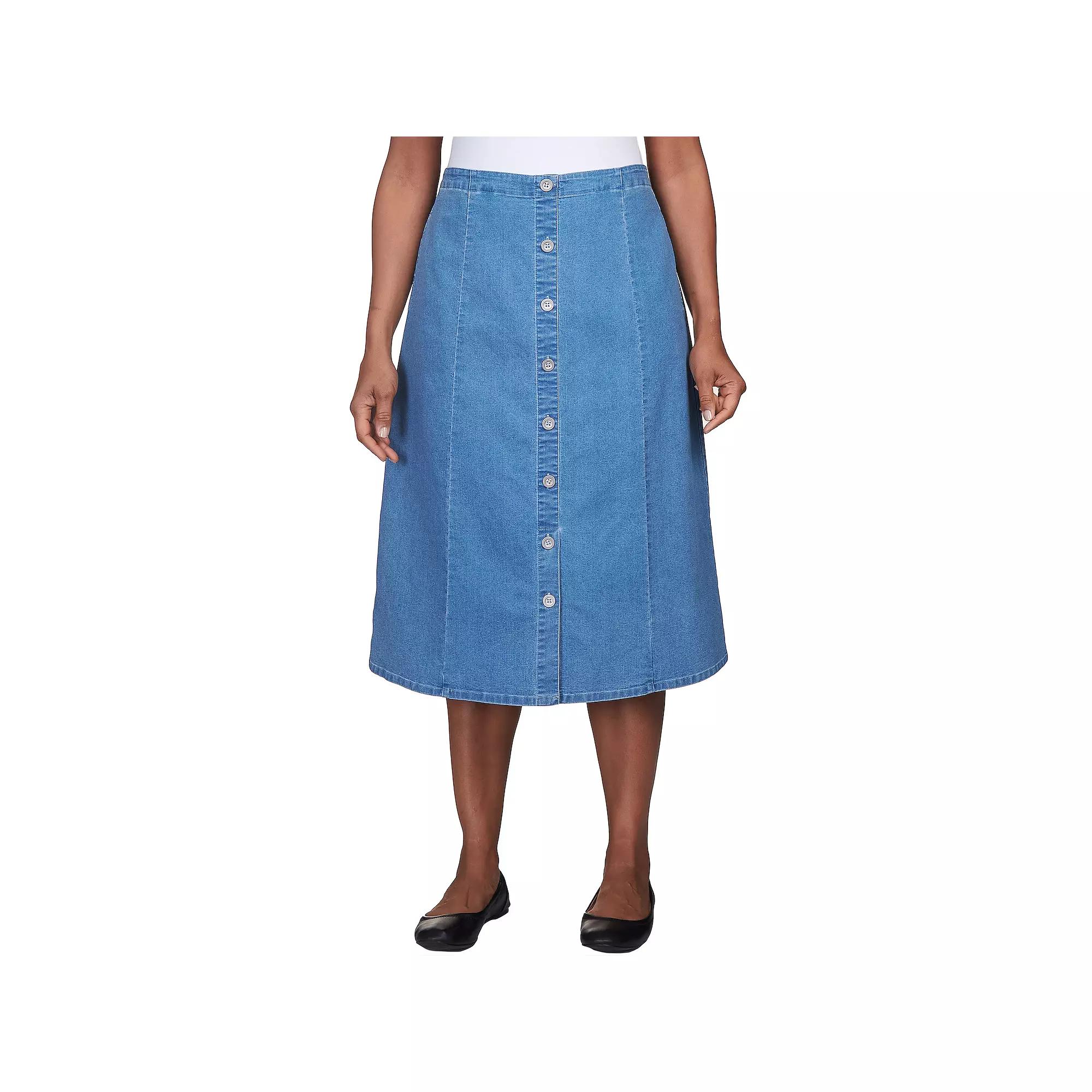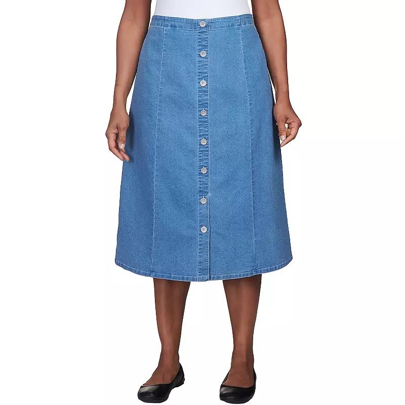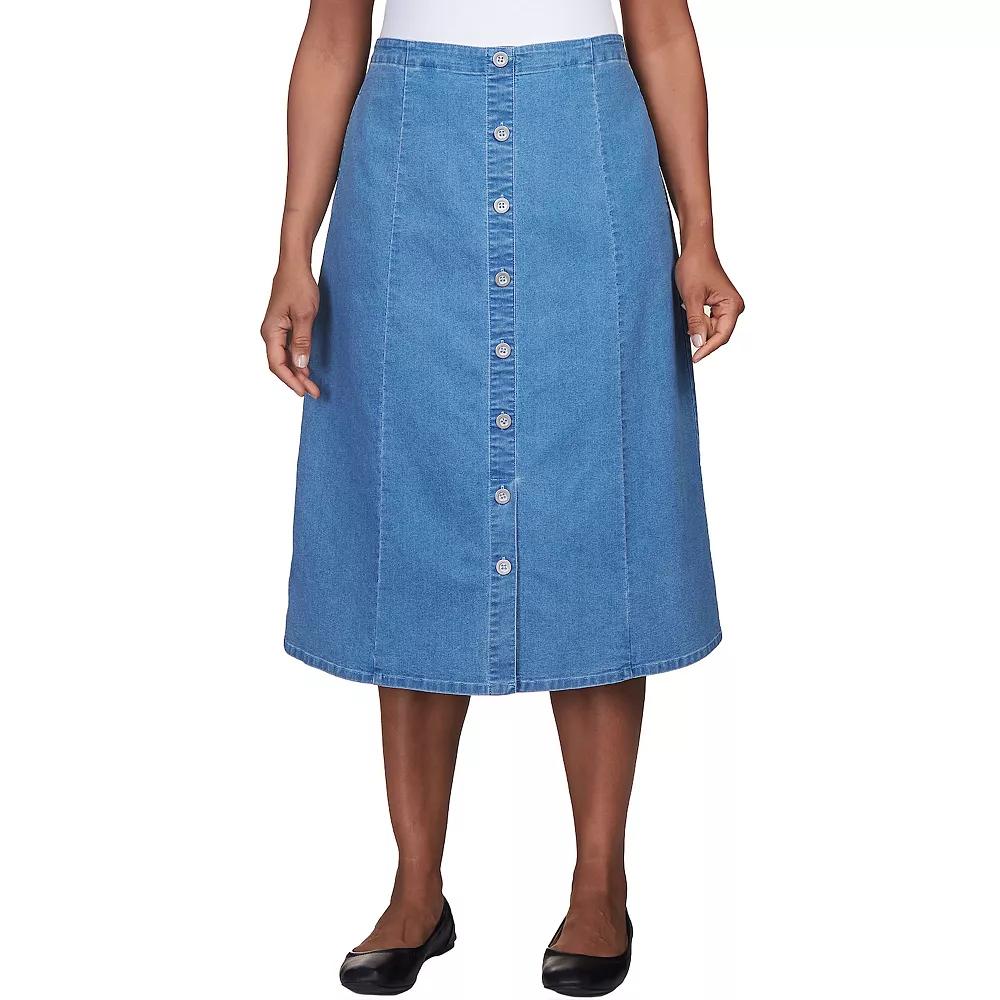 Add some flair to your wardrobe with this womens denim midi skirt from Alfred Dunner.Click on this WOMENS GUIDE to find the perfect fit and more!FEATURES Button front detailing Flat front A-line silhouette Denim construction 2 pockets UnlinedFIT & SIZING Midi length hits below the knee Midrise sits on the high hip No closure - pull-on styling 27 3/4-in. length Elastic waistbandFABRIC & CARE Cotton, polyester, spandex Machine wash and tumble dry Imported Size: 14 Petite. Color: Dark Denim. Gender: female. Age Group: adult.