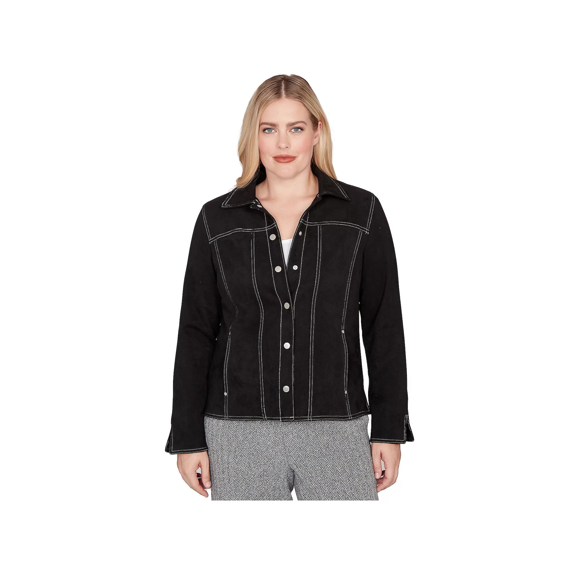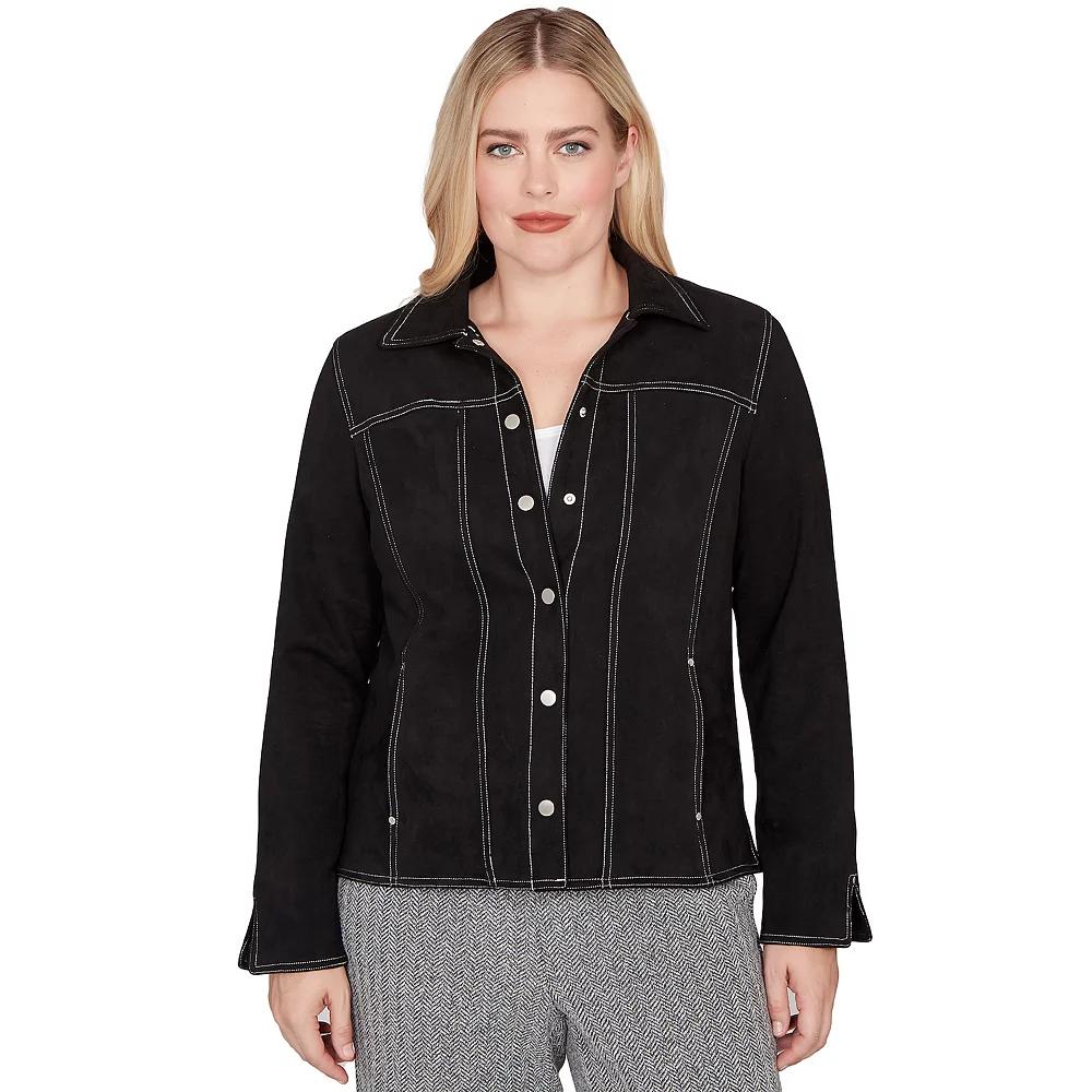 Elevate your style with this chic faux suede jacket that perfectly marries timeless charm with cozy comfort. Featuring a beautifully printed inner lining and classic details like a collared neckline and button-up front, this Alfred Dunner piece is a versatile must-have for effortlessly enhancing your everyday outfits. Click on this WOMEN'S GUIDE to find the perfect fit and more! - https://www.kohls.com/feature/womens-fit-guide.jsp. FEATURES: Soft, touchable faux suede finish, Beautifully printed inner lining, Classic collared neckline and button-up front, Versatile straight hemline for easy layering, Elevates everyday looks with a subtle edge. FIT & SIZE: 21-in. length from shoulder to hem. MATERIAL & CARE: Polyester, Spandex, Machine wash and line dry. DETAILS: Button front closure, Long sleeves, Imported. Size: M Petite. Color: Black. Gender: female. Age Group: adult. Material: WOVEN.