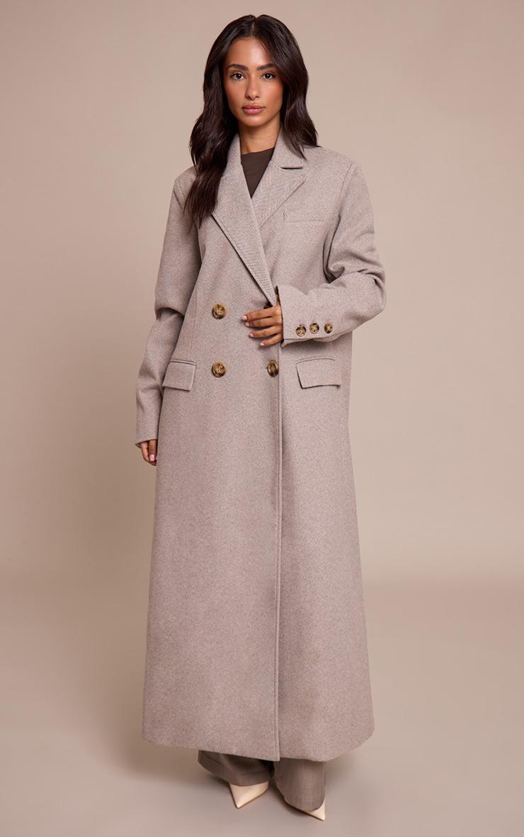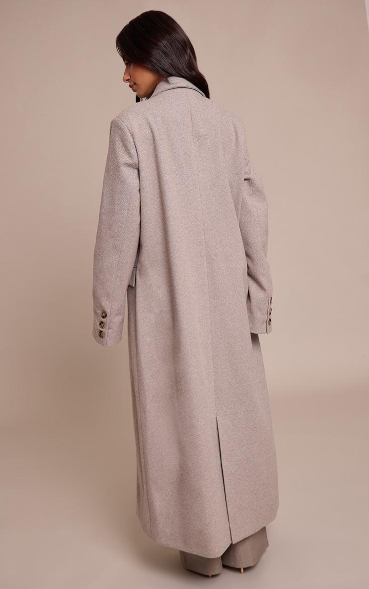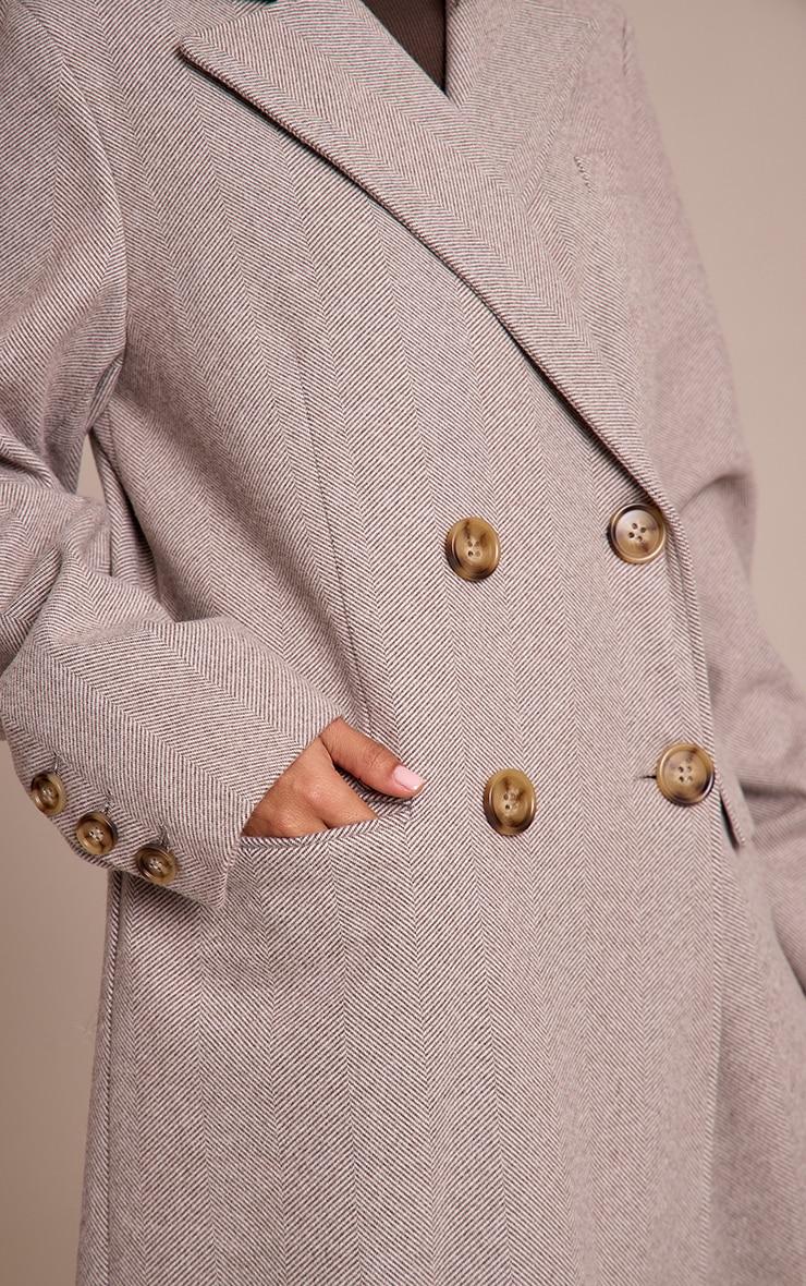 Embrace a powerful aesthetic with a piece that merges structure and flow. The petite beige herringbone double breasted maxi coat presents an expansive, tailored silhouette, its deep notched lapels defining a clean, commanding neckline. Large, round buttons articulate the classic double-breasted fastening, complementing the refined herringbone pattern as the coat cascades to a full maxi length, lending confident dimension to any day ensemble. Style it over a streamlined ribbed top and sharp wide-leg pants. Complete the look with chic kitten heels and subtle accessories for an effortlessly composed finish that asserts your refined aesthetic.Length approx 147.5cm/58inch (Based on sample size XS)Model wears size XSModel Height - 5ft 2inchp]:!mb-4inch>Category: OuterwearProduct type: Wool Look CoatColor: BeigeMaterial: Faux WoolOccasion: Day