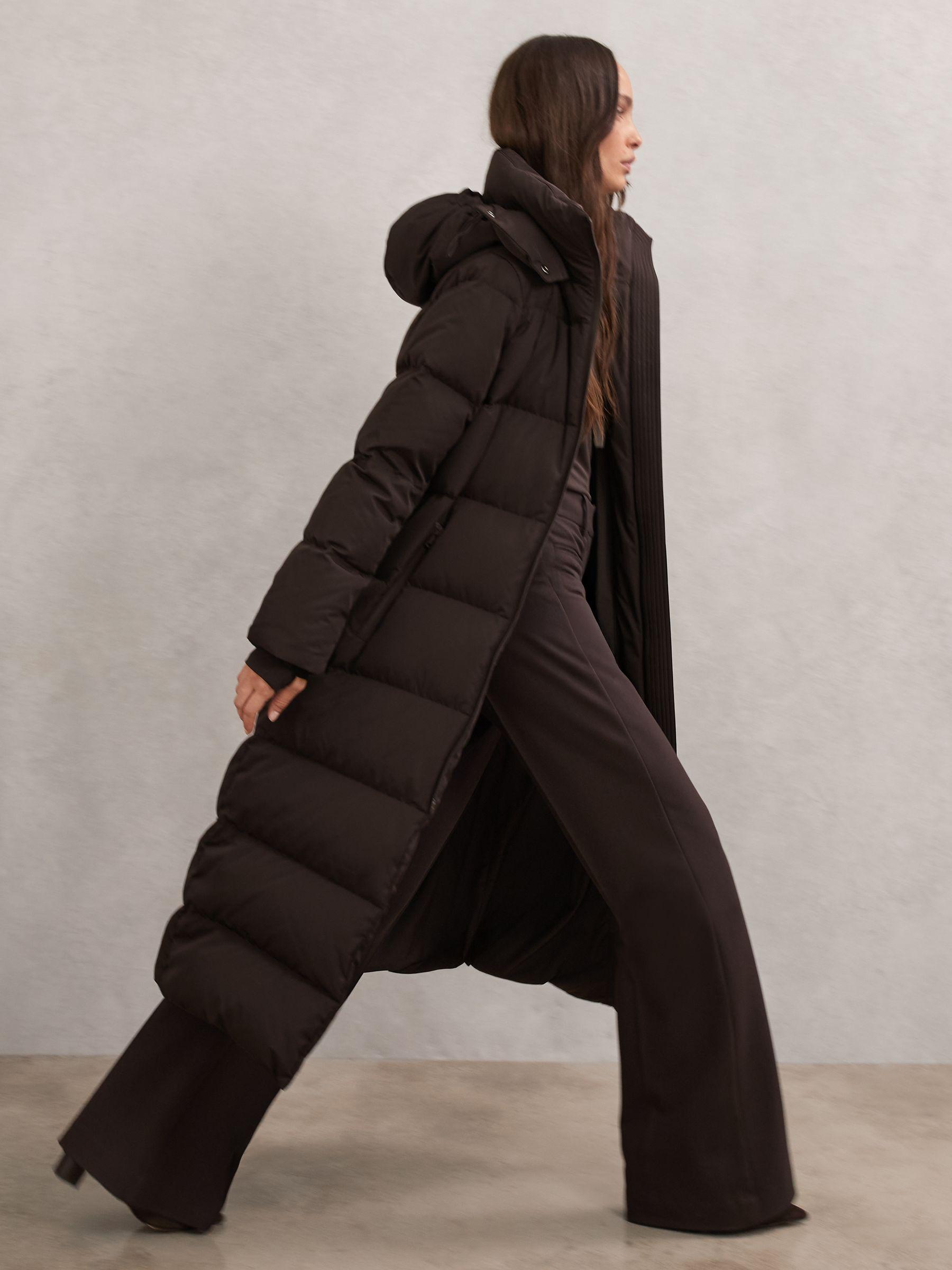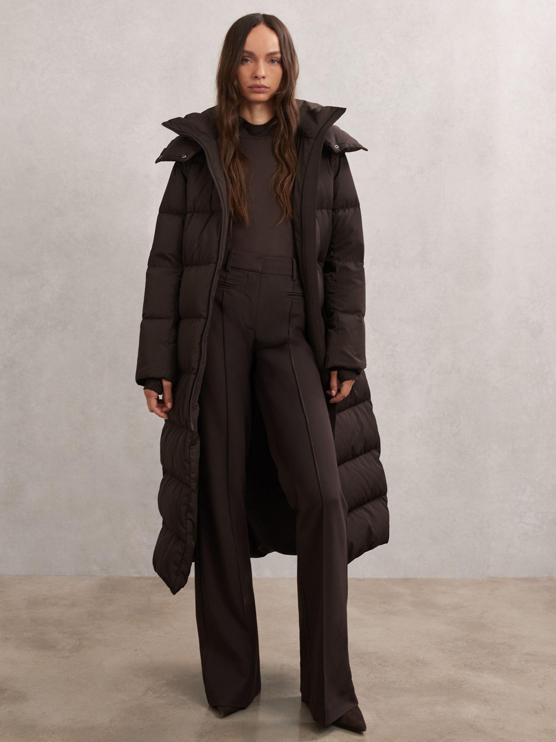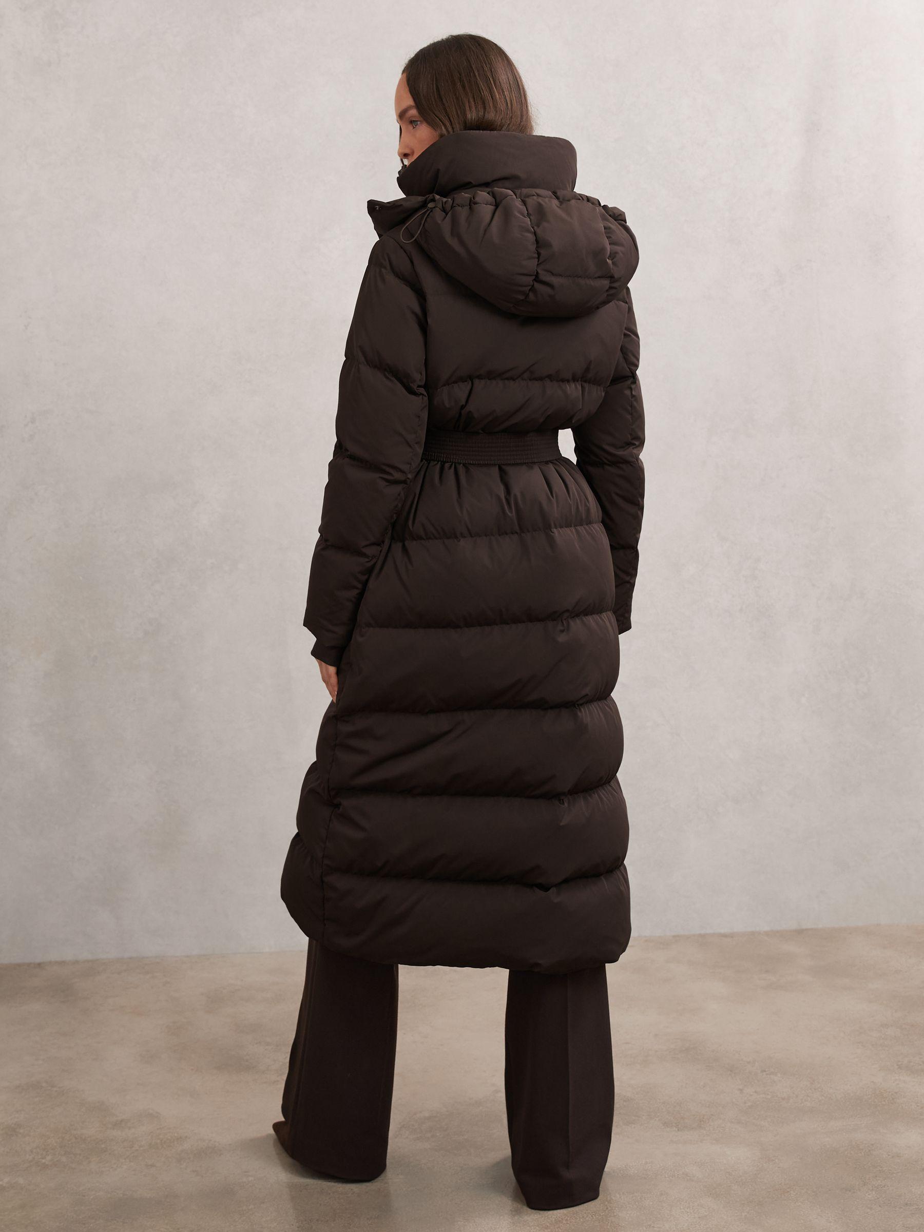 Petite Belted Longline Hooded Puffer Coat in Chocolate Brown