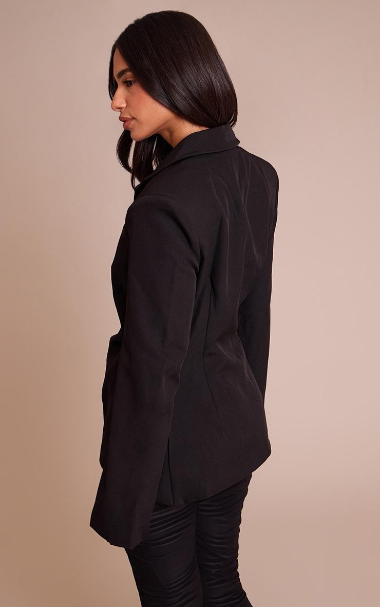 The petite black asymmetric style wrap blazer offers modern tailoring with a wrap design and asymmetric hem. Wear over a fitted dress or skinny pants for contemporary office or evening wear. Complete the look with pointed heels and minimal accessories.Length approx 45.5cm/18inch (Based on sample size XS)Model wears size XSModel Height - 5ft 2inchp]:!mb-4inch>Brand: PrettyLittleThingCategory: OuterwearProduct type: Fitted BlazerColor: BlackMaterial: Tailored WovenOccasion: Day