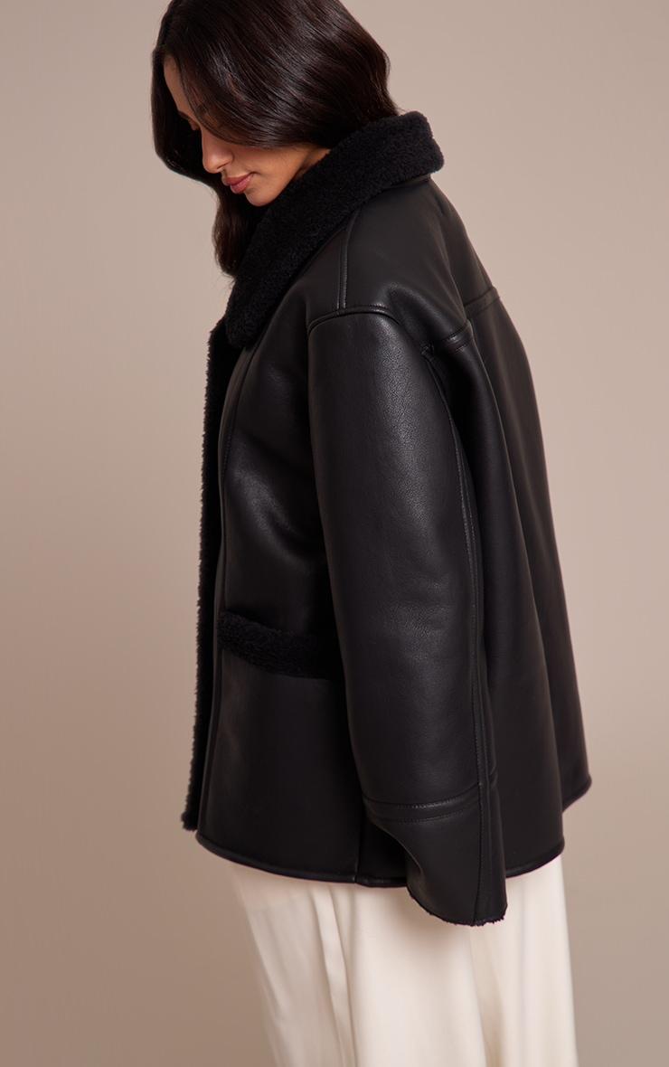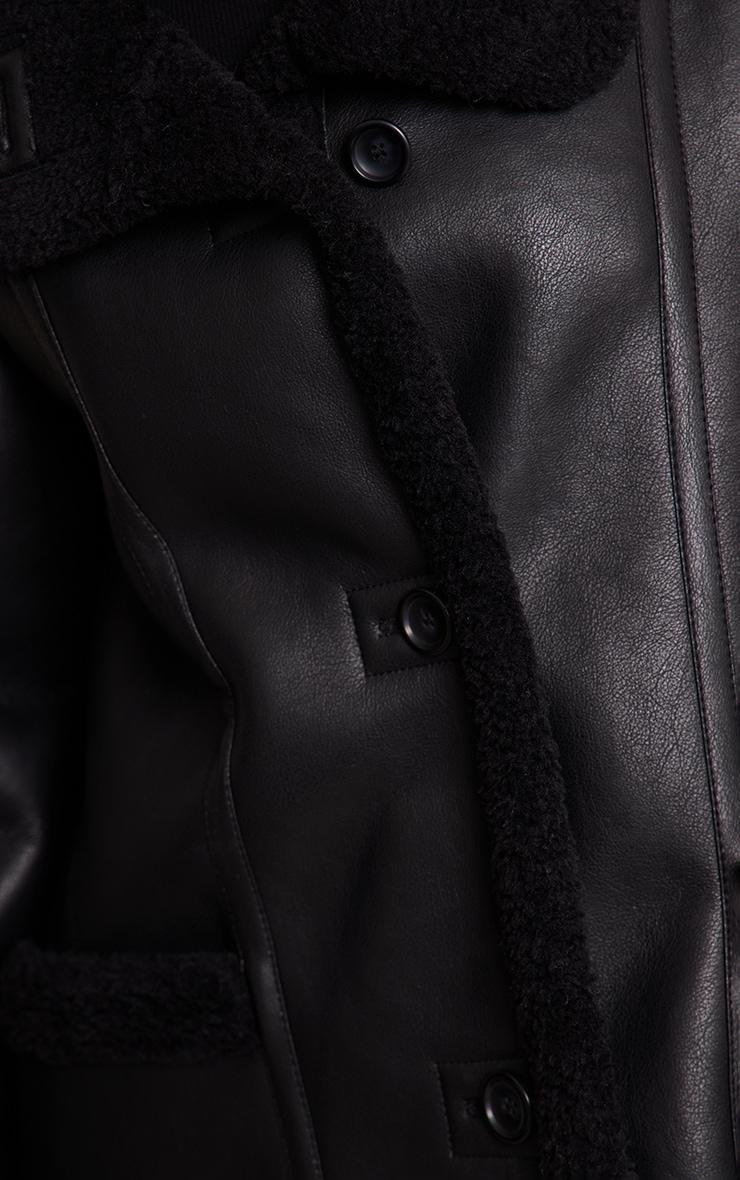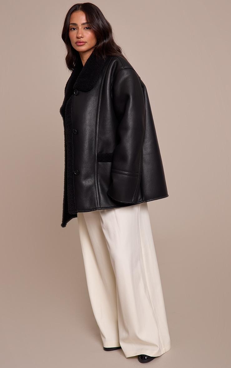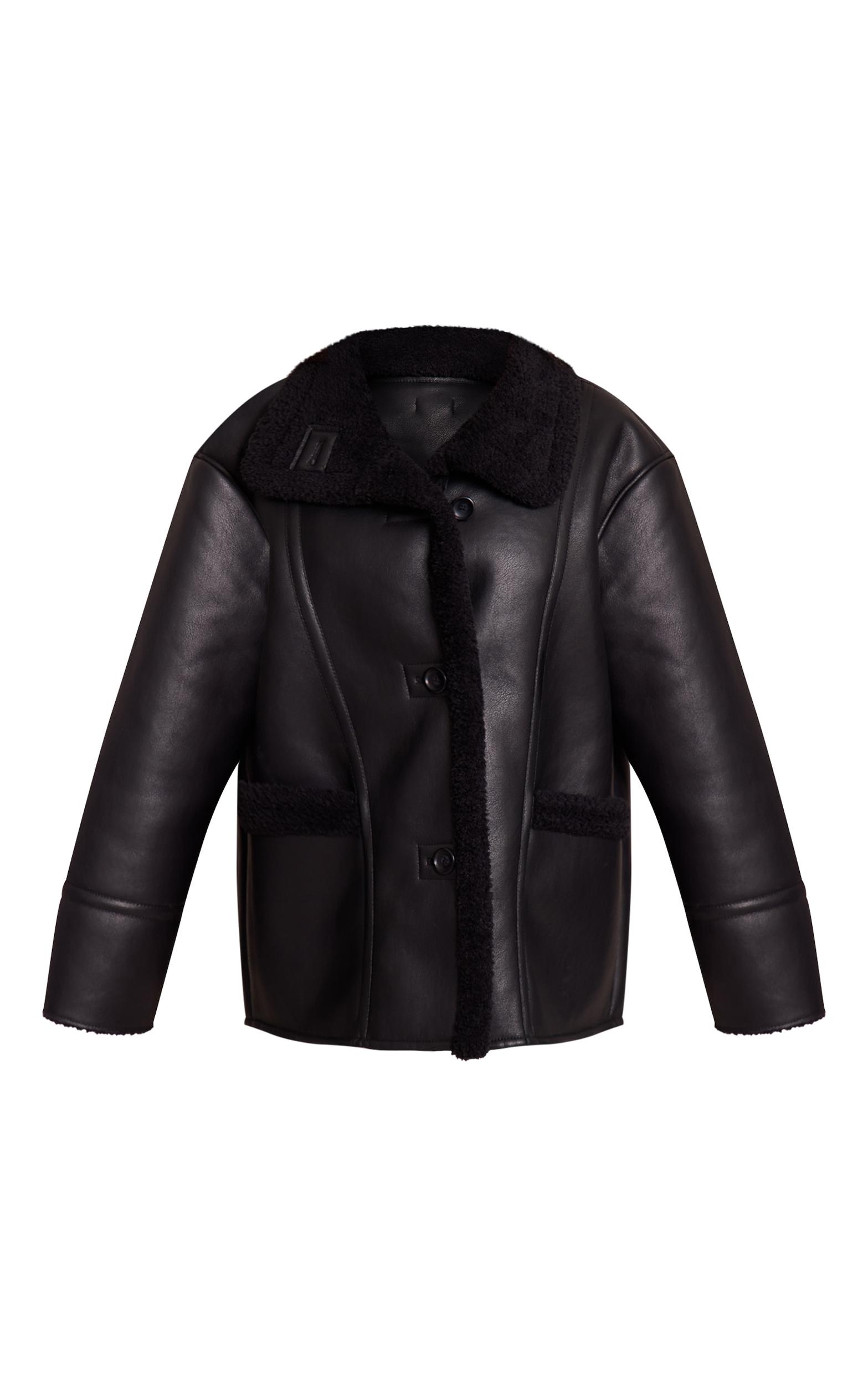 Define your cold-weather aesthetic with an artful edge. The petite black borg lining funnel neck aviator cuts a confident, oversized silhouette, its plush borg lining visibly tracing the distinct funnel neck, generous cuffs, and front placket, creating an undeniable textural contrast. Bold button fastenings secure the front, complemented by integrated patch pockets for an effortless finish. Pair this impactful black piece with tailored wide-leg pants or sleek black jeans, grounding your look with robust boots and a subtle gold ring for an undeniably polished presence that commands every moment of your day.Length approx 45.5cm/18inch (Based on sample size S)Model wears size SModel Height - 5ft 2inchp]:!mb-4inch>Category: OuterwearProduct type: AviatorColor: BlackMaterial: Faux LeatherOccasion: Day