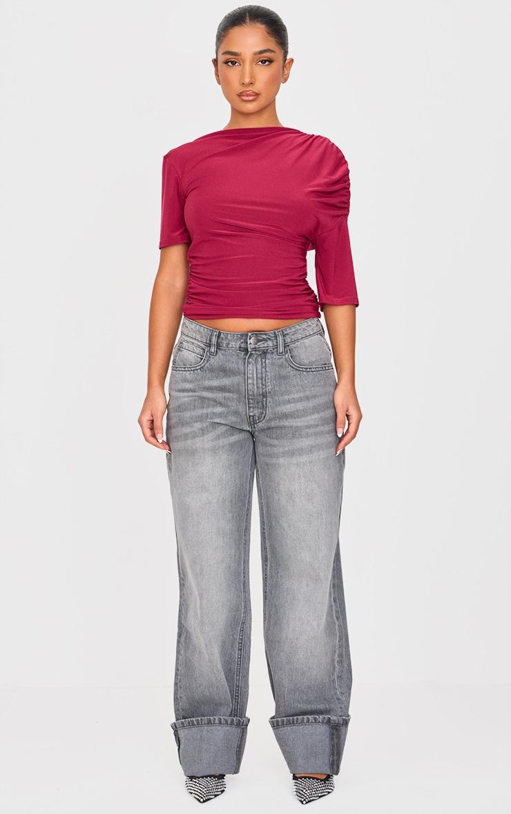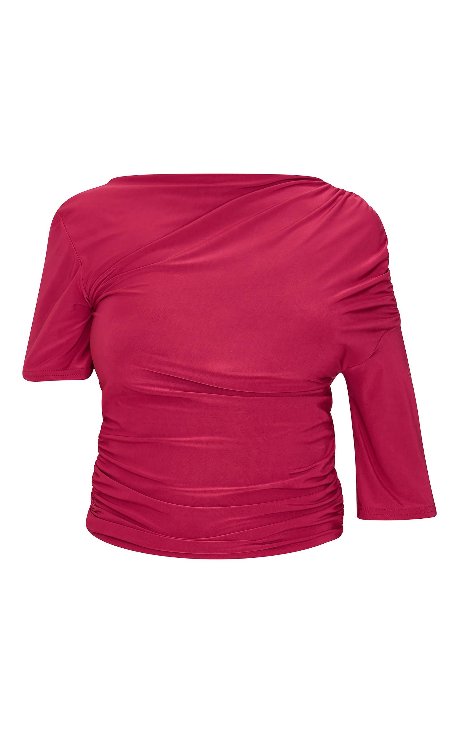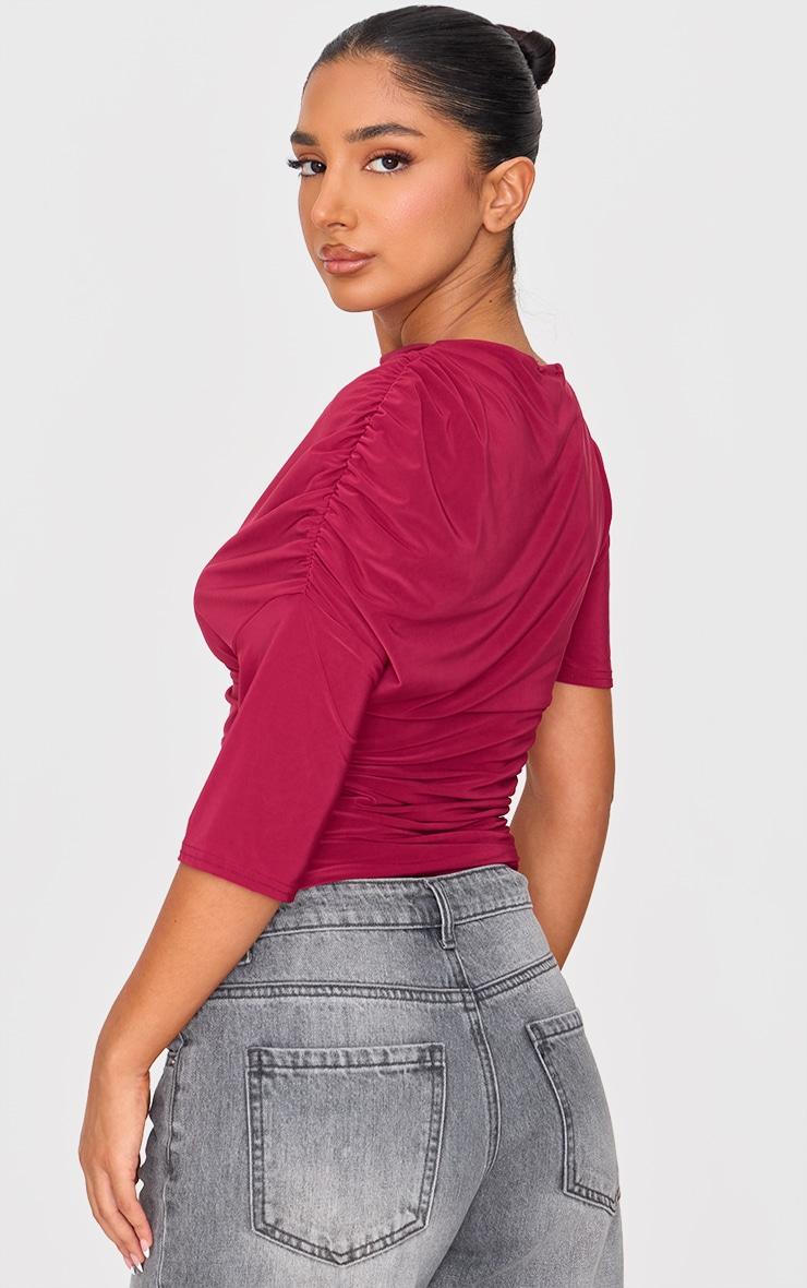 Take your basics collection to new heights with this petite burgundy double slinky ruched short sleeve top. Brought to you in a burgundy hue double slinky material with a ruched detail and short sleeves, this top is all the new you need. Style with jeans, slip on heels and simple accessories for a look like no other. Length approx 46cm/18inch (Based on a sample size XS) Model wears size XSModel Height - 5ft 4inchp]:!mb-0inch>Category: TopsProduct type: Cami TopColor: BurgundyMaterial: Slinky JerseyDesign: PlainNeckline: SlashSleeves: ShortOccasion: Evening