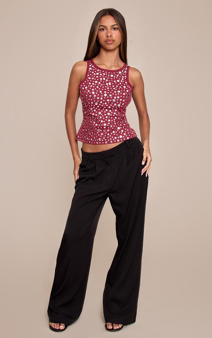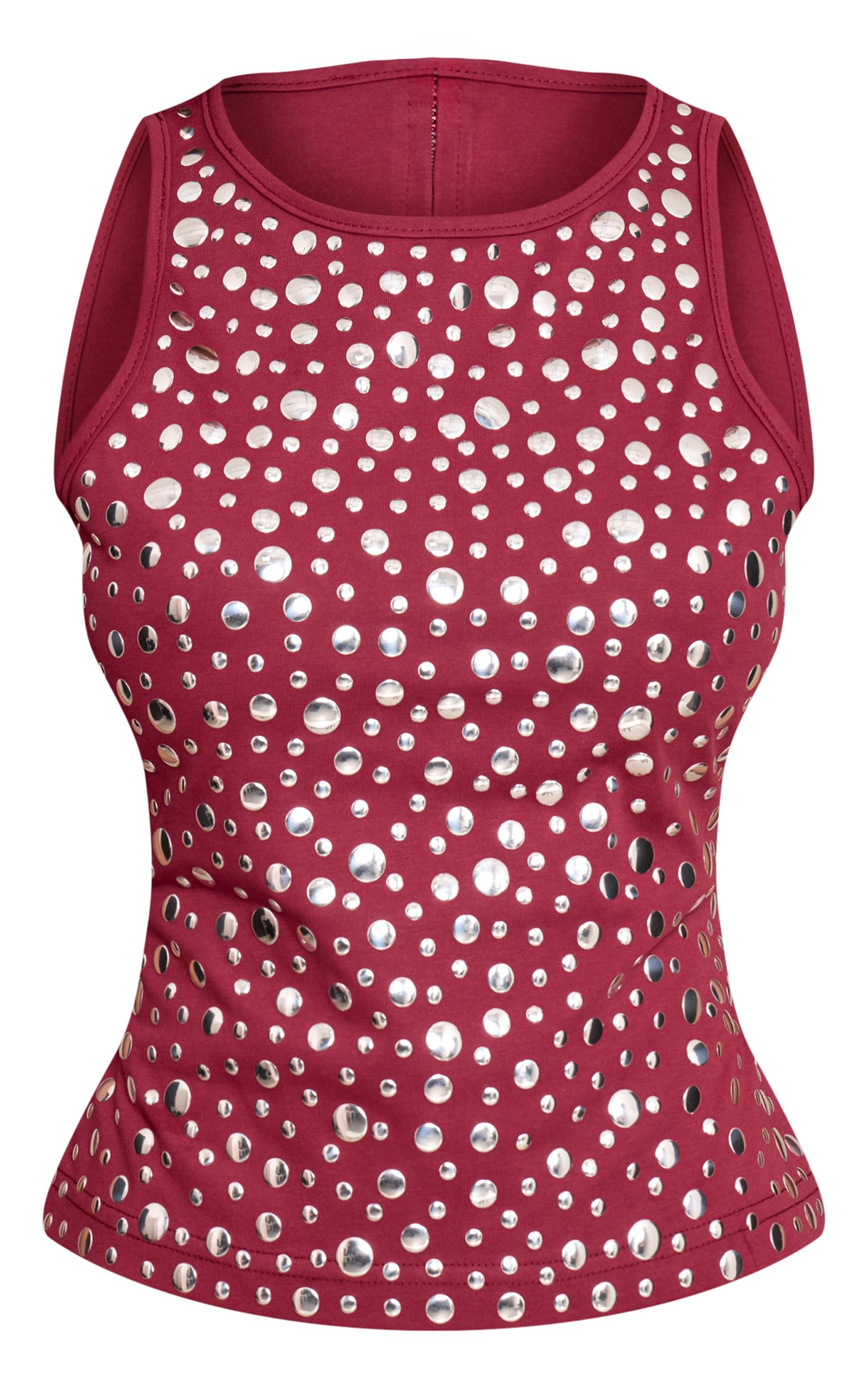 Project confident style in the petite burgundy stud detail Vest top. Its flattering silhouette is elevated by a round neckline and striking scattered stud detailing. Whether tackling your daily agenda or stepping out for a relaxed brunch, this piece ensures impact. Style it with tailored wide-leg pants, finish with sleek black heels, and delicate accessories for a confident, artful ensemble.Length approx 45.5cm/18inch (Based on sample size US 2)Model wears size UK 6/ EU 34/ AUS 6/ US 2Model Height - 5ft 3inchp]:!mb-4inch>Brand: PrettyLittleThingCategory: TopsProduct type: Vest TopColor: BurgundyMaterial: Cotton JerseyOccasion: Day