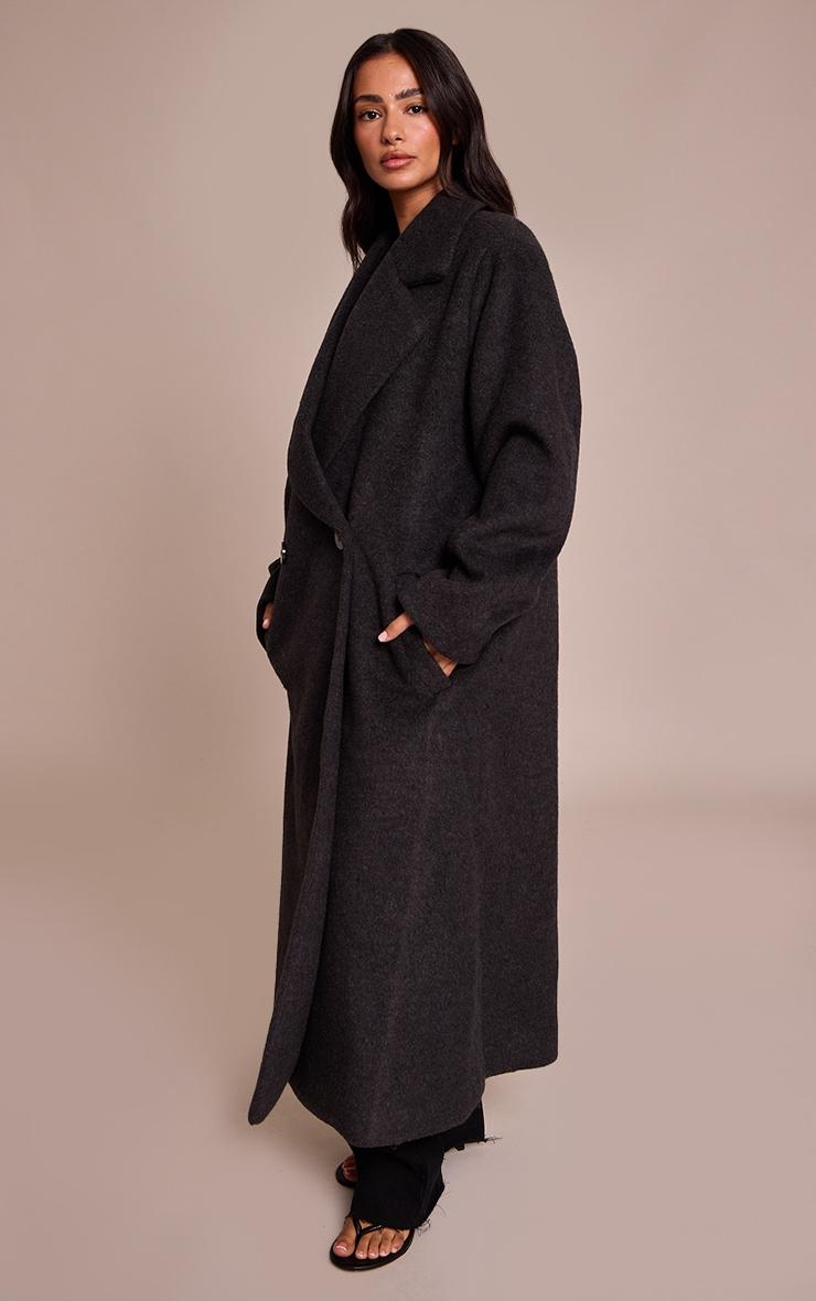 Command attention with a silhouette that speaks volumes, making an undeniable statement in the petite charcoal brushed wool maxi coat. This artfully oversized outerwear piece features a sweeping maxi length and wide notched lapels, complemented by a confident double-breasted button fastening and functional side pockets. Its relaxed, flowing cut ensures effortless daywear versatility. Layer yours over a fine knit sweater and tailored black pants, completing the ensemble with sleek mid calf boots and a minimalist black bag for an assured, polished aesthetic.Length approx 129.5cm/51inch (Based on sample size XS)Model wears size XSModel Height - 5ft 2inchp]:!mb-4inch>Category: OuterwearProduct type: Wool Look CoatColor: CharcoalMaterial: Faux WoolOccasion: Day