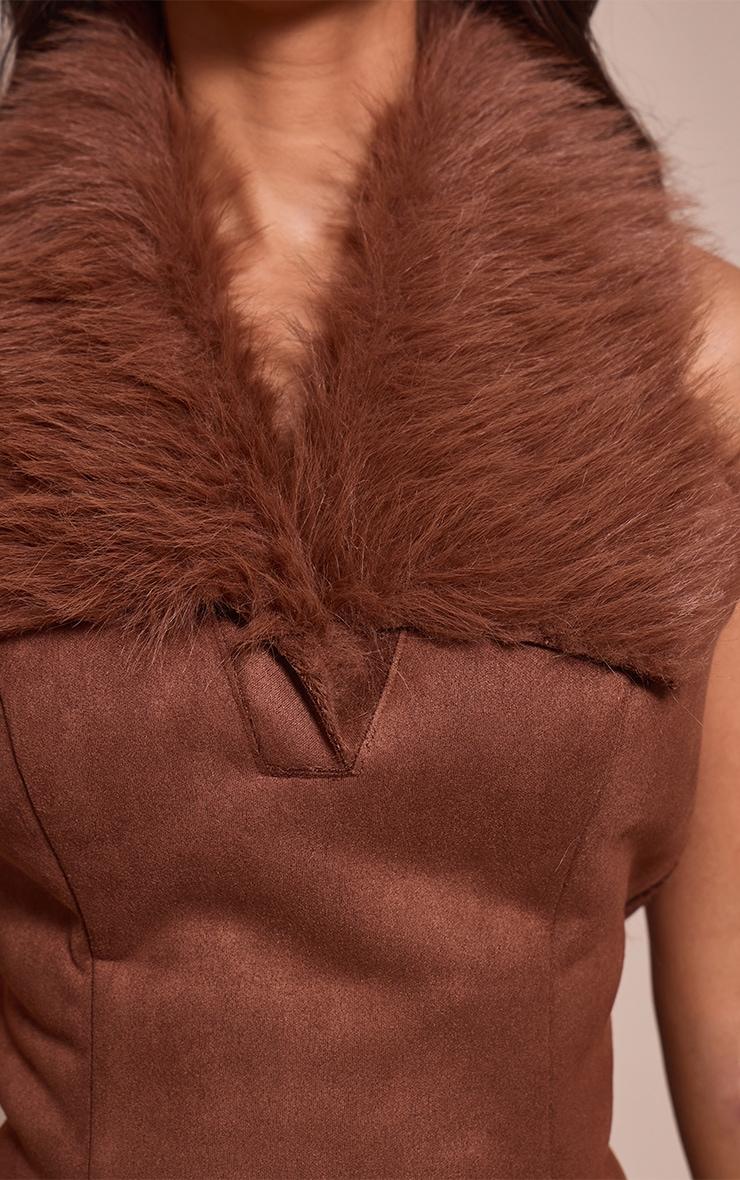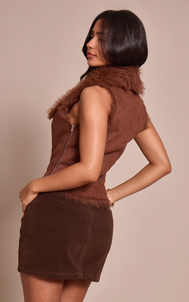 Own the allure of elevated textures with the petite chocolate sleeveless suede zip up top, an artful piece designed to define your daywear. Its rich chocolate hue, sleek sleeveless cut, and fitted bodice create a confident silhouette, expertly framed by a striking faux fur collar and a subtle matching trim at the hem, all secured with a discreet side zip. Introduce this distinctive top to tailored black pants and chic knee high boots for an effortlessly polished aesthetic, adding delicate gold bracelets to complete your look with knowing confidence.Length approx 45.5cm/18inch (Based on sample size US 2)Model wears size UK 6/ EU 34/ AUS 6/ US 2Model Height - 5ft 2inchp]:!mb-4inch>Brand: PrettyLittleThingCategory: TopsProduct type: Vest TopColor: ChocolateMaterial: Faux SuedeOccasion: Day