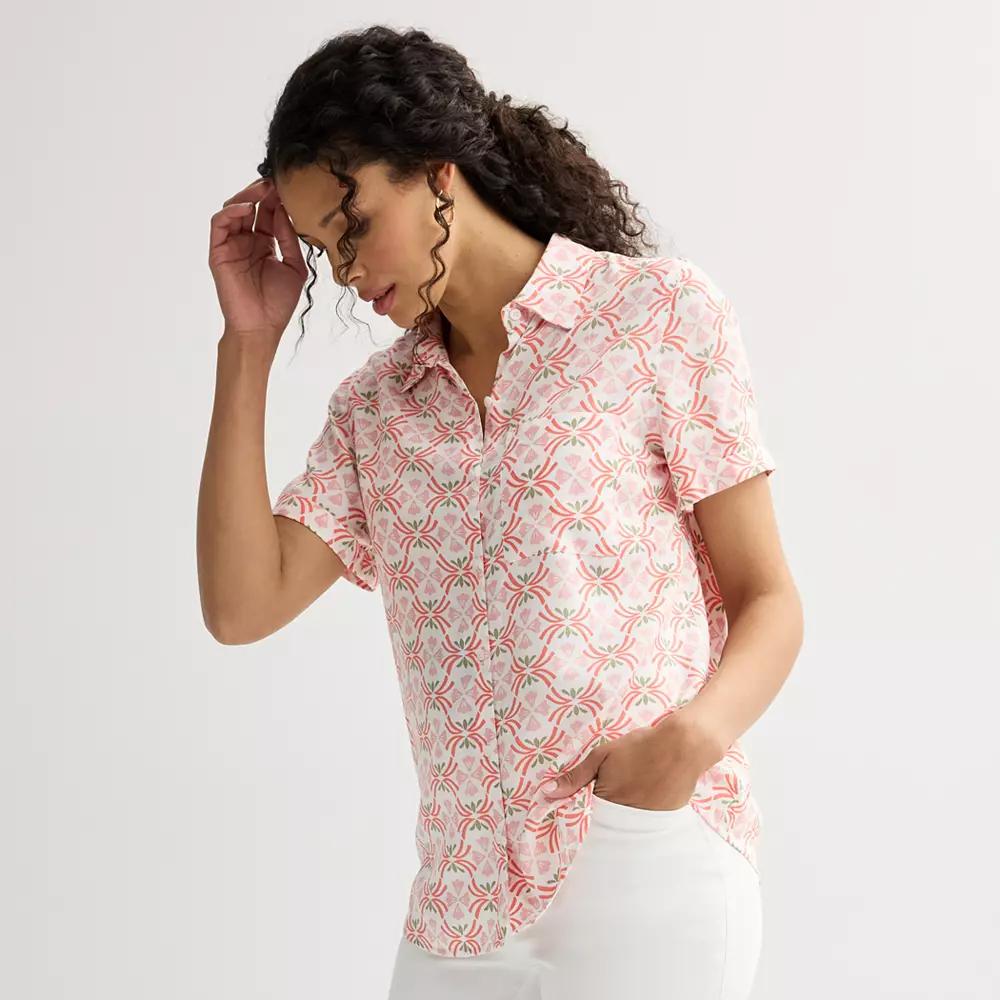Give your wardrobe a fun upgrade with this Petite Croft & Barrow Woven Paisley Print Button Down Short Sleeve Camp Shirt.Click on this WOMEN'S GUIDE to find the perfect fit and more! Give your wardrobe a fun upgrade with this Petite Croft & Barrow Woven Paisley Print Button Down Short Sleeve Camp Shirt.Click on this WOMEN'S GUIDE to find the perfect fit and more! FEATURES Collared neckline Short sleeves Sewn-rolled cuffs 1 chest pocket Button front Rounded hem UnlinedFIT & SIZING Relaxed fit style 26-in. length from shoulder to hemFABRIC & CARE Rayon Plain weave construction Machine wash Imported Size: XS Petite. Color: Pink White Tile. Gender: female. Age Group: adult.