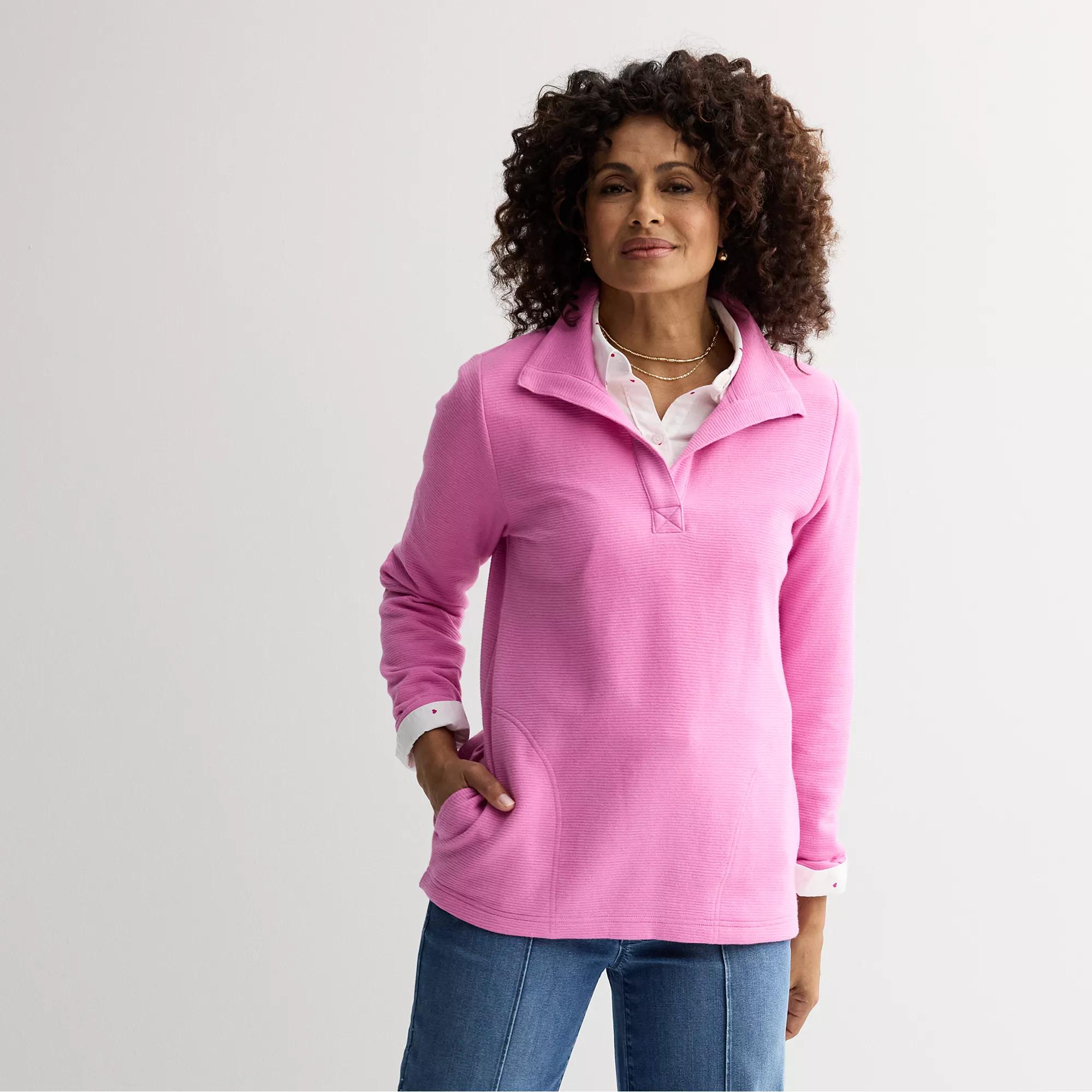 Cozy and comfortable, this women's pullover from Croft & Barrow will keep you warm when things get cold.Click on this WOMEN'S GUIDE to find the perfect fit and more!Cozy and comfortable, this women's pullover from Croft & Barrow will keep you warm when things get cold.Click on this WOMEN'S GUIDE to find the perfect fit and more!FEATURES Splitneck Set-in sleeves long sleeves Sewn-rolled cuffs Rounded hem 2 pockets UnlinedFIT & SIZING 25-in. length from shoulder to hemFABRIC & CARE Cotton, polyester Machine wash ImportedRESPONSIBLE Supports more sustainable cotton farming Size: XS Petite. Color: Bubblegum Taffy. Gender: female. Age Group: adult.