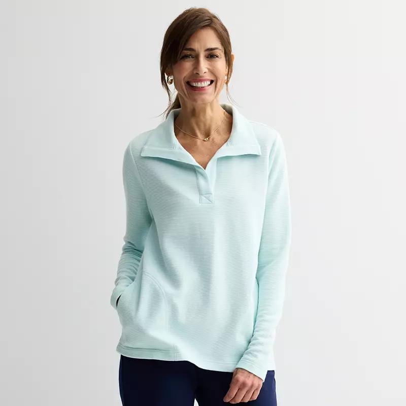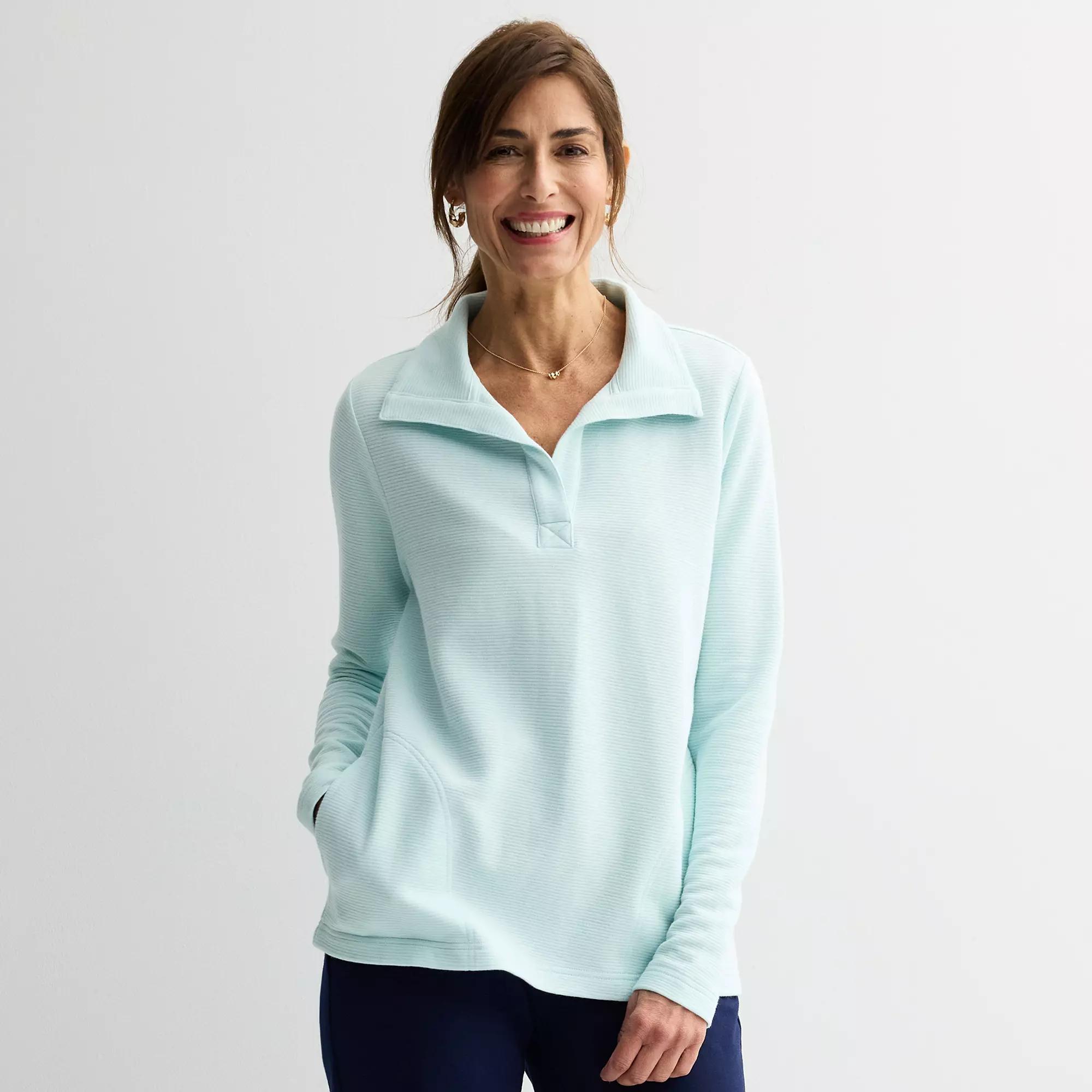 Cozy and comfortable, this women's pullover from Croft & Barrow will keep you warm when things get cold.Click on this WOMEN'S GUIDE to find the perfect fit and more!Cozy and comfortable, this women's pullover from Croft & Barrow will keep you warm when things get cold.Click on this WOMEN'S GUIDE to find the perfect fit and more!FEATURES Splitneck Set-in sleeves long sleeves Sewn-rolled cuffs Rounded hem 2 pockets UnlinedFIT & SIZING 25-in. length from shoulder to hemFABRIC & CARE Cotton, polyester Machine wash ImportedRESPONSIBLE Supports more sustainable cotton farming Size: M Petite. Color: Aqua Tint. Gender: female. Age Group: adult.