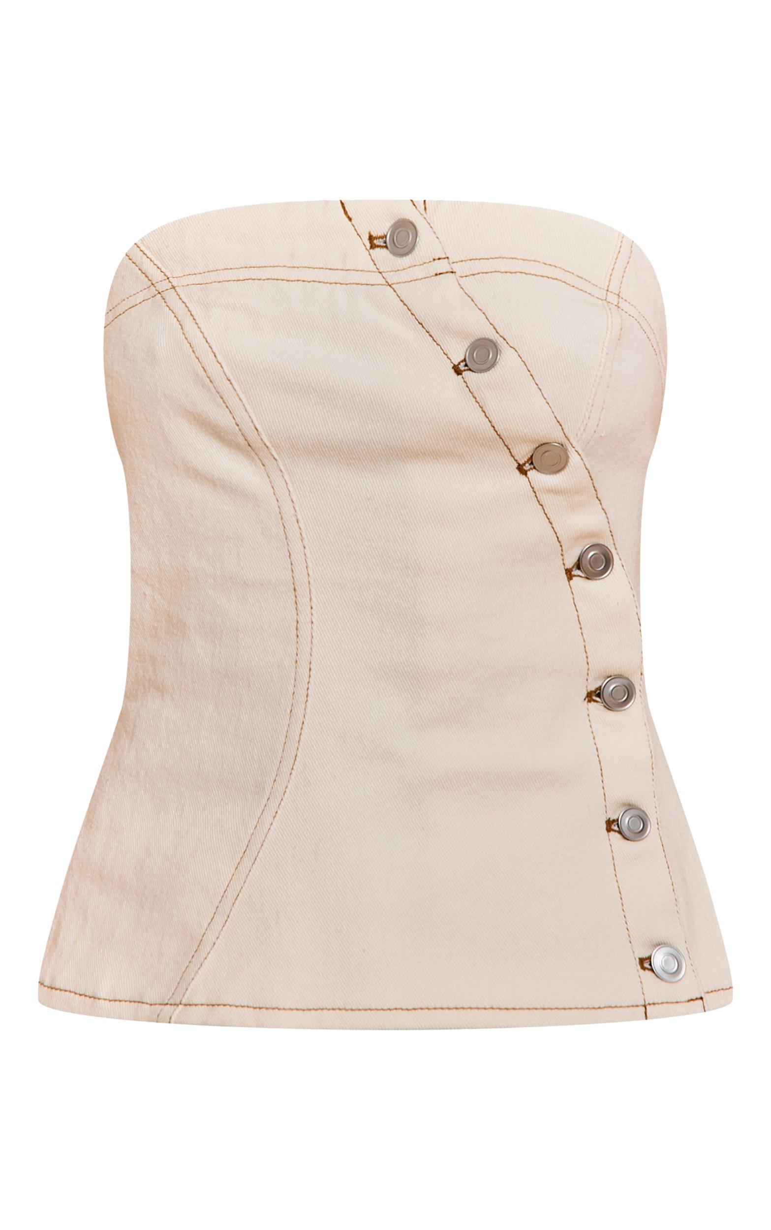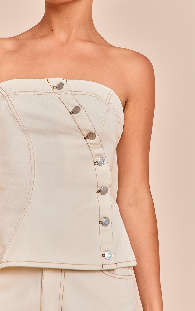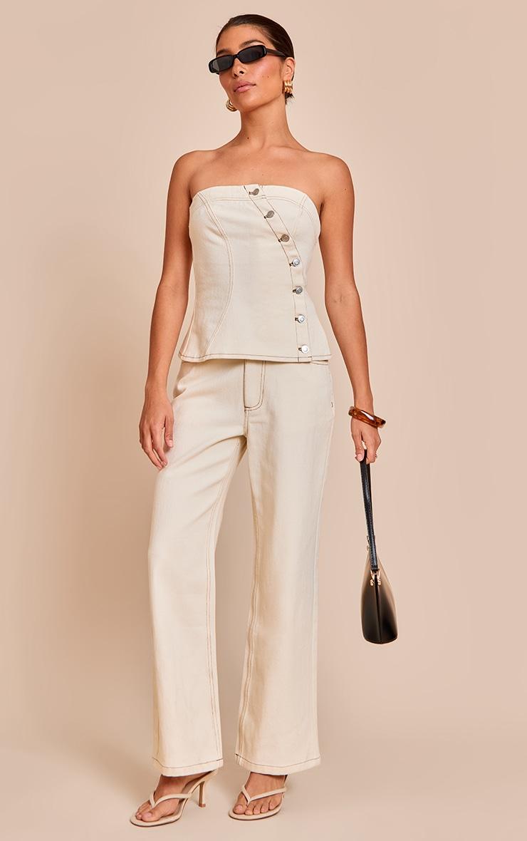 Craft an assured day look with an artful spin. The petite ecru denim asymmetric button bandeau top delivers a contemporary take on classic denim. Its clean bandeau neckline offers a refined silhouette, contrasted by an artfully asymmetric button placket and a subtle peplum hem that defines the waist. Pair this ecru denim two piece set piece with its matching wide-leg pants for a cohesive statement, or dial down the drama with dark wash jeans and crisp white sneakers for an effortless, confident edge. This top is the ultimate foundation for a distinct daywear statement.Length approx 34.5cm/13.5inch (Based on sample size US 2)Model wears size UK 6/ EU 34/ AUS 6/ US 2Model Height - 5ft 5inchp]:!mb-4inch>Brand: PrettyLittleThingCategory: DenimProduct type: TopColor: EcruMaterial: Rigid DenimOccasion: Day