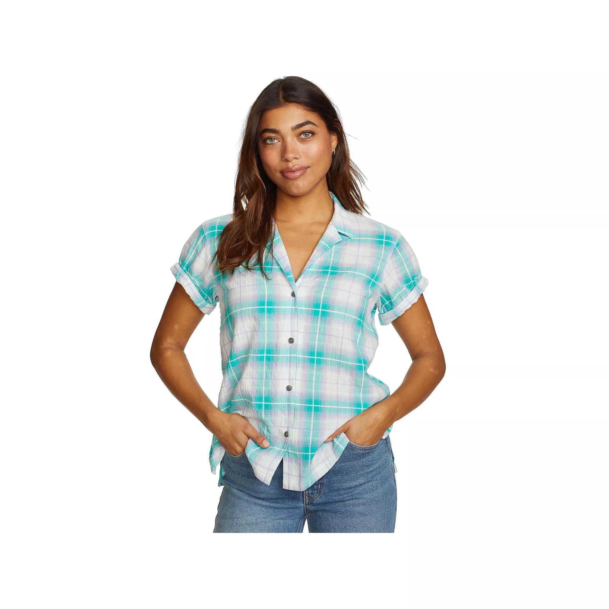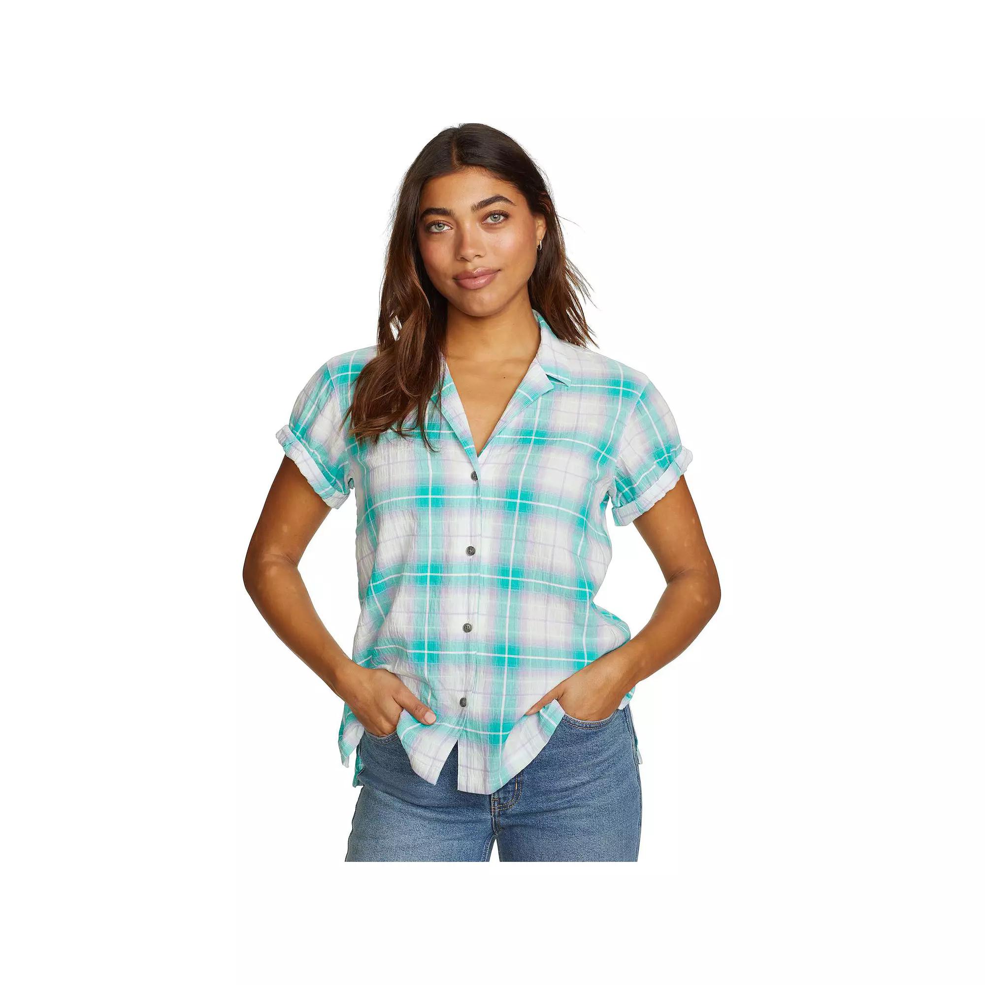 Eddie Bauer's bestselling, lightweight, packable cotton is now available in an easy, camp shirt style. The perfect complement to your favorite shorts or casual pants.Click on this WOMEN'S GUIDE to find the perfect fit and more!Eddie Bauer's bestselling, lightweight, packable cotton is now available in an easy, camp shirt style. The perfect complement to your favorite shorts or casual pants.Click on this WOMEN'S GUIDE to find the perfect fit and more!FEATURES Collared neckline Short sleeves with rolled cuffs Button closure Straight hem UnlinedFIT & SIZING Classic fit 24-in. length from shoulder to hemFABRIC & CARE Cotton Machine wash and tumble dry low Imported Size: L Petite. Color: Green. Gender: female. Age Group: adult.