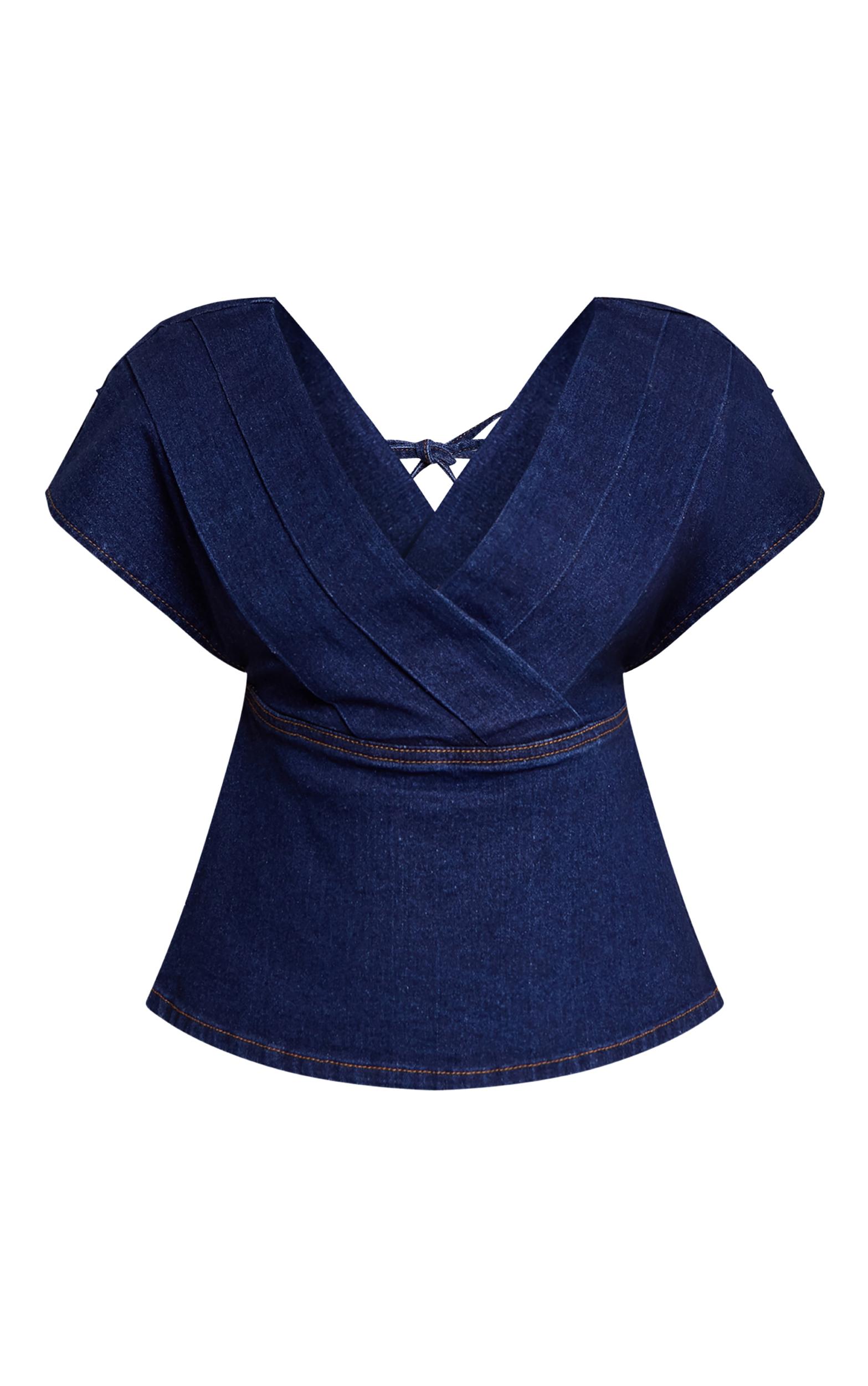 Master daywear with a modern denim piece that transcends the everyday. Crafted in a rich indigo blue, the petite indigo denim peplum v neck top presents an artful wrap-front bodice that forms a confident V-neckline, subtly defined by elegant pleat-like detailing and precise contrast stitching. Its structured peplum waist creates an undeniably flattering silhouette, finished with short cap sleeves for a sleek profile. Team this distinctive top with high-waisted tailored pants for an effortlessly polished day aesthetic, grounding your look with sophisticated nude heels and completing the ensemble with subtle layered necklaces. This is confident denim reimagined, ensuring your presence is felt without effort.Length approx 45.5cm/18inch (Based on sample size US 2)Model wears size UK 6/ EU 34/ AUS 6/ US 2Model Height - 5ft 2inchp]:!mb-4inch>Category: DenimProduct type: Denim TopColor: IndigoMaterial: Rigid DenimOccasion: Day